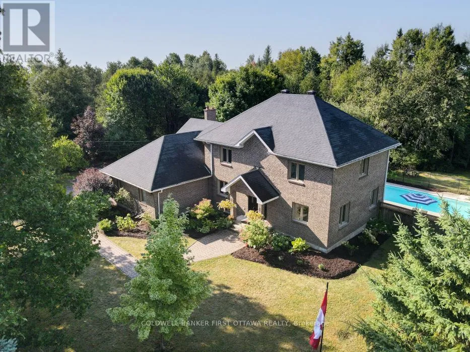Cross Streets: Ottawa Street & Ramsay Conc 11A. ** Directions: 417 W, Exit 155 Almonte, Left onto March Road, 1st Right at Roundabout onto Ramsay Concession 11A. Nestled on a picturesque 26.517-acre natural oasis, this stunning all-brick family home blends timeless elegance with modern efficiency. Boasting geothermal heating and cooling, it offers both environmental sustainability and year-round comfort. Step into the bright, welcoming foyer and discover generous living spaces filled with natural light. A professional main-floor office with calming views easily doubles as a bedroom. The living and dining rooms sparkle with sunshine, while the open-concept kitchen-with abundant cabinetry, new quartz countertops and flooring-flows seamlessly into the inviting family room, creating a warm space for connection and comfort. Patio doors lead to a spacious deck, perfect for BBQs and outdoor gatherings. The landscaped yard includes a fully fenced in-ground swimming pool, perfect for summer enjoyment. A fenced vegetable garden invites homegrown harvests. A convenient main-floor powder and laundry room completes the main level. Upstairs, the luxurious primary retreat features hardwood floors, a walk-in closet, and a 5-piece ensuite. Three additional generously sized bedrooms share a stylish 4-piece bathroom. Take a look at the second staircase, which also leads up to the second floor. The finished lower level offers an expansive recreation area, ideal for family fun or entertaining, a kitchenette in the making (electrical and plumbing have been completed, should buyers want to use it for an in-law suite). Direct access from the attached double garage connects to both the lower level and main floor, ensuring ease of entry. This remarkable property offers the best of country living with elegant indoor comfort and thoughtful outdoor features, truly a serene and sustainable family haven. (id:27476)