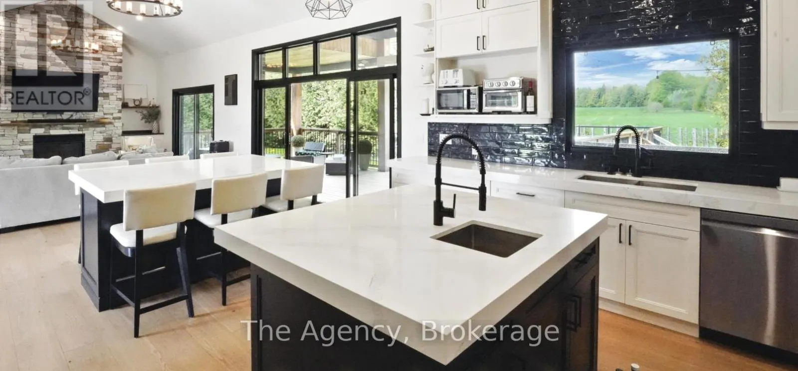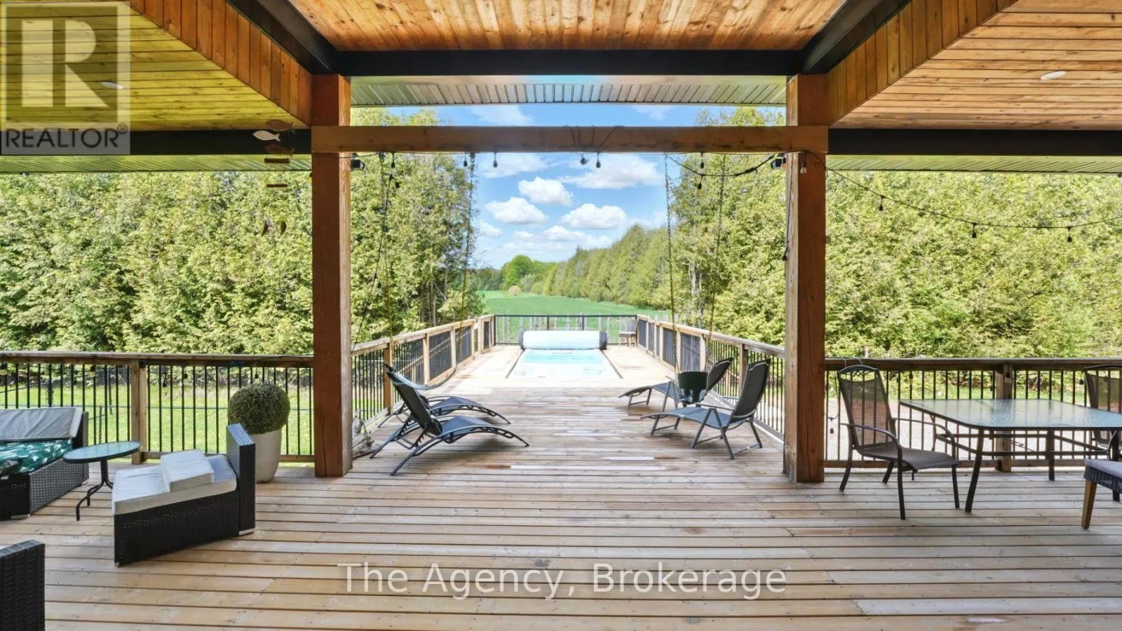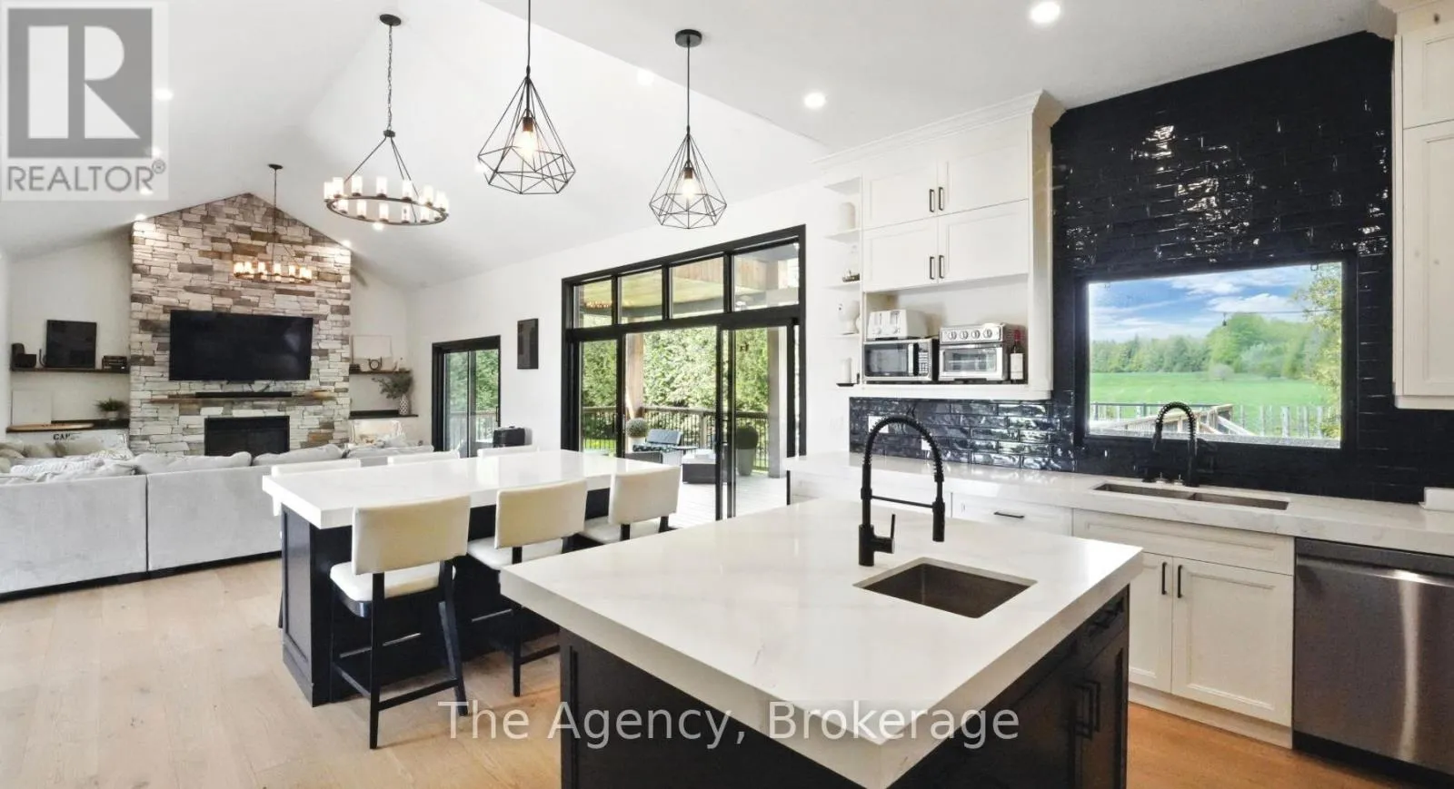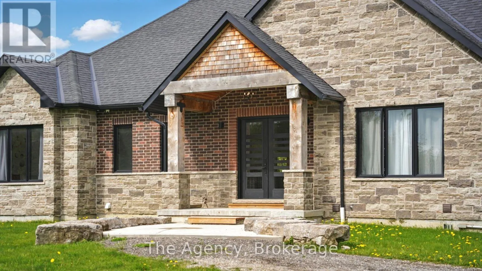 Side Rd 10 and Hwy 10 A rare opportunity to own this stunning, custom-built home, offered for the first time! Boasting over 5,000 sq. ft. of living space, this exceptional property is conveniently located on Hwy 10 with natural gas service. The exterior showcases timeless stone and brickwork, complemented by striking Douglas fir beams inside. Step into an inviting interior with soaring 10-foot ceilings throughout, elegant 8-foot doors, and a seamless open-concept layout. The full chef's kitchen, complete with a double island, flows effortlessly into the expansive deck, perfect for indoor-outdoor living. The primary suite offers a spa-like ensuite and two walk-in closets. This home features 3+2 bedrooms and 3.5 baths, with a lower level boasting 9-foot ceilings, an in-law suite with a separate entrance, a gym, and in-floor heating throughout. The heated and insulated garage is designed for versatility, featuring high ceilings ideal for a lift, a Tesla charger, and a backup generator. The property is enhanced by 20 years of meticulous landscaping, a mature cedar tree line, power-gated entry, additional parking pads, an invisible fence with a dedicated dog run, and a breathtaking spring-fed river teeming with speckled trout. An extraordinary home combining luxury, comfort, and nature, don't miss this one-of-akindopportunity! The driveway has been recently paved. (id:27476)