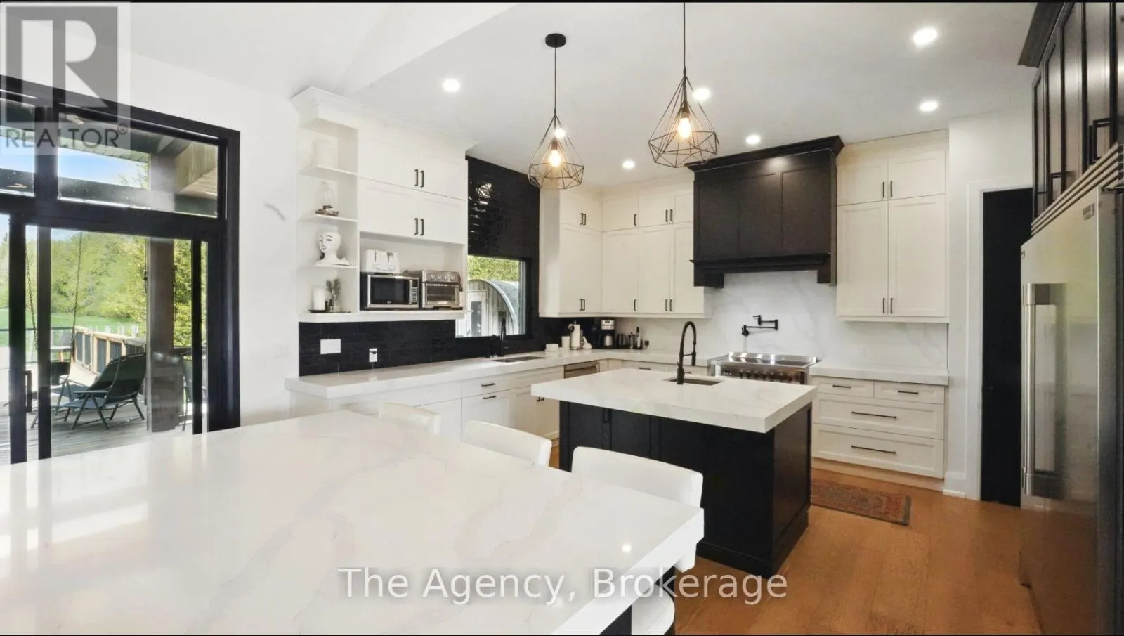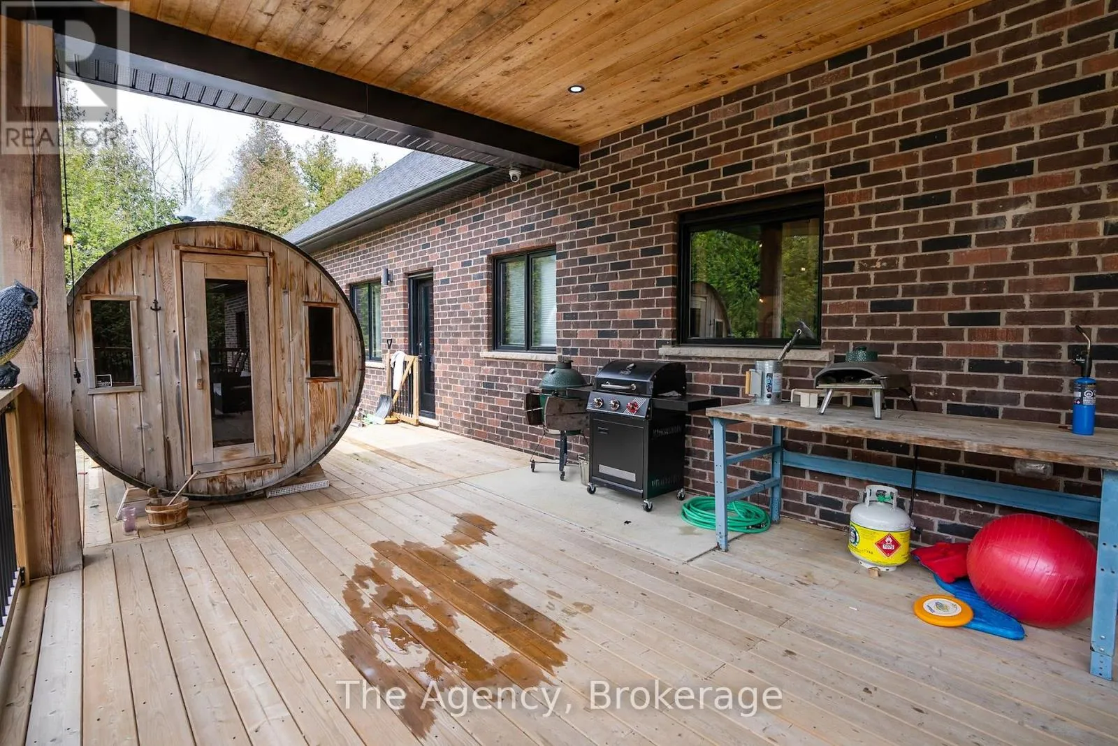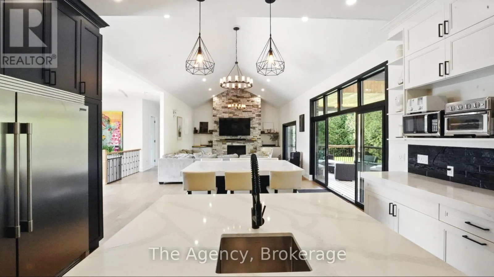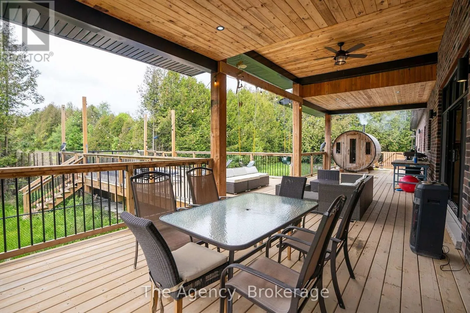 Side Rd 10 and Hwy 10 A rare opportunity to own this stunning, custom-built home, offered for the first time! Boasting over 5,000 sq. ft. of living space, this exceptional property is conveniently located on Hwy 10 with natural gas service. The exterior showcases timeless stone and brickwork, complemented by striking Douglas fir beams inside. Step into an inviting interior with soaring 10-foot ceilings throughout, elegant 8-foot doors, and a seamless open-concept layout. The full chef's kitchen, complete with a double island, flows effortlessly into the expansive deck, perfect for indoor-outdoor living. The primary suite offers a spa-like ensuite and two walk-in closets. This home features 3+2 bedrooms and 3.5 baths, with a lower level boasting 9-foot ceilings, an in-law suite with a separate entrance, a gym, and in-floor heating throughout. The heated and insulated garage is designed for versatility, featuring high ceilings ideal for a lift, a Tesla charger, and a backup generator. The property is enhanced by 20 years of meticulous landscaping, a mature cedar tree line, power-gated entry, additional parking pads, an invisible fence with a dedicated dog run, and a breathtaking spring-fed river teeming with speckled trout. An extraordinary home combining luxury, comfort, and nature, don't miss this one-of-akindopportunity! The driveway has been recently paved. (id:27476)