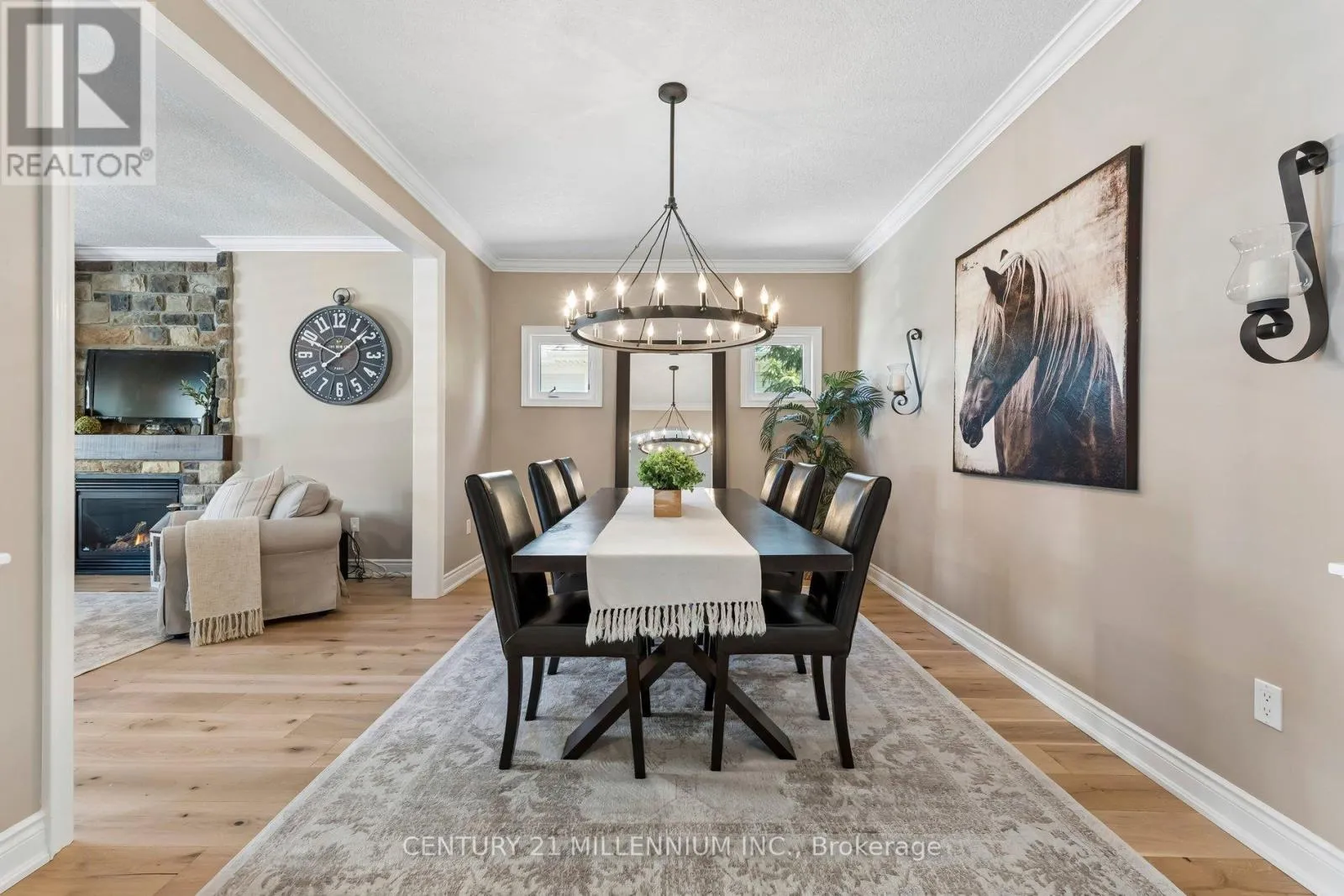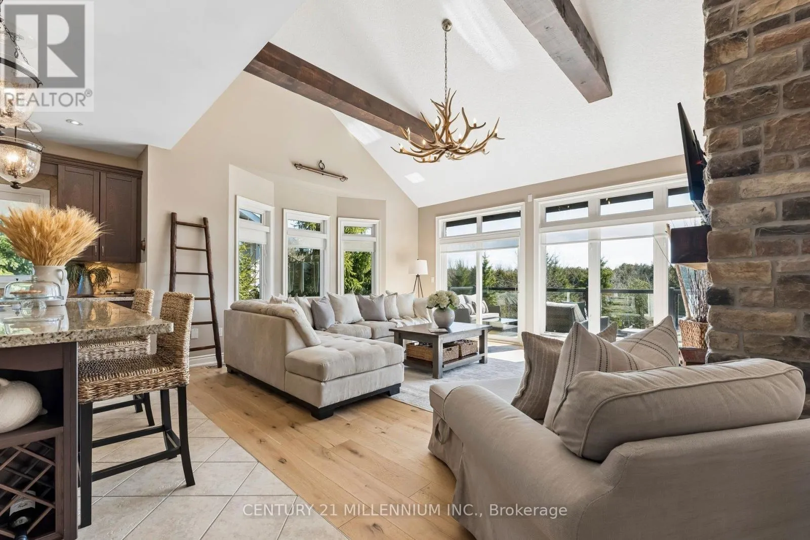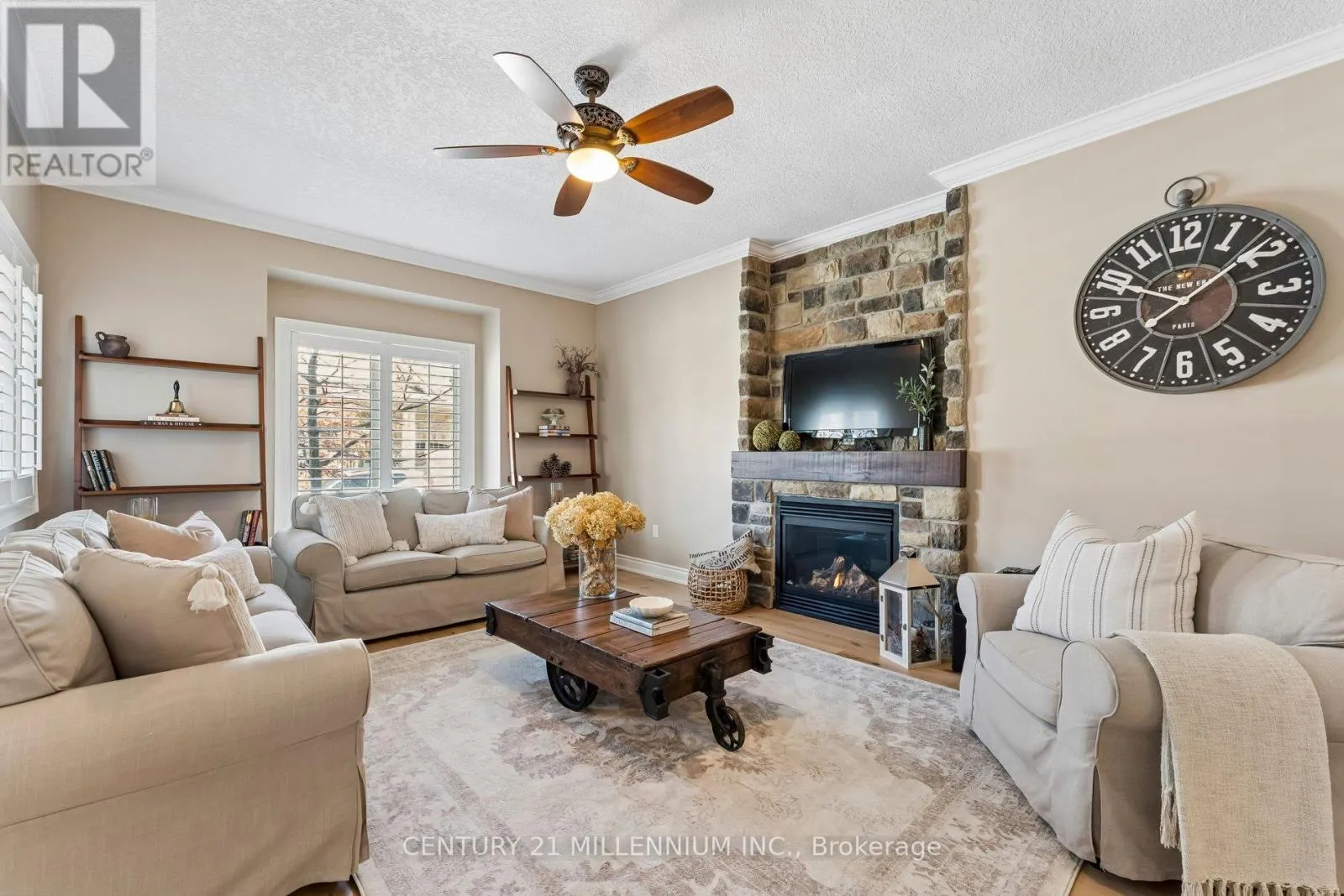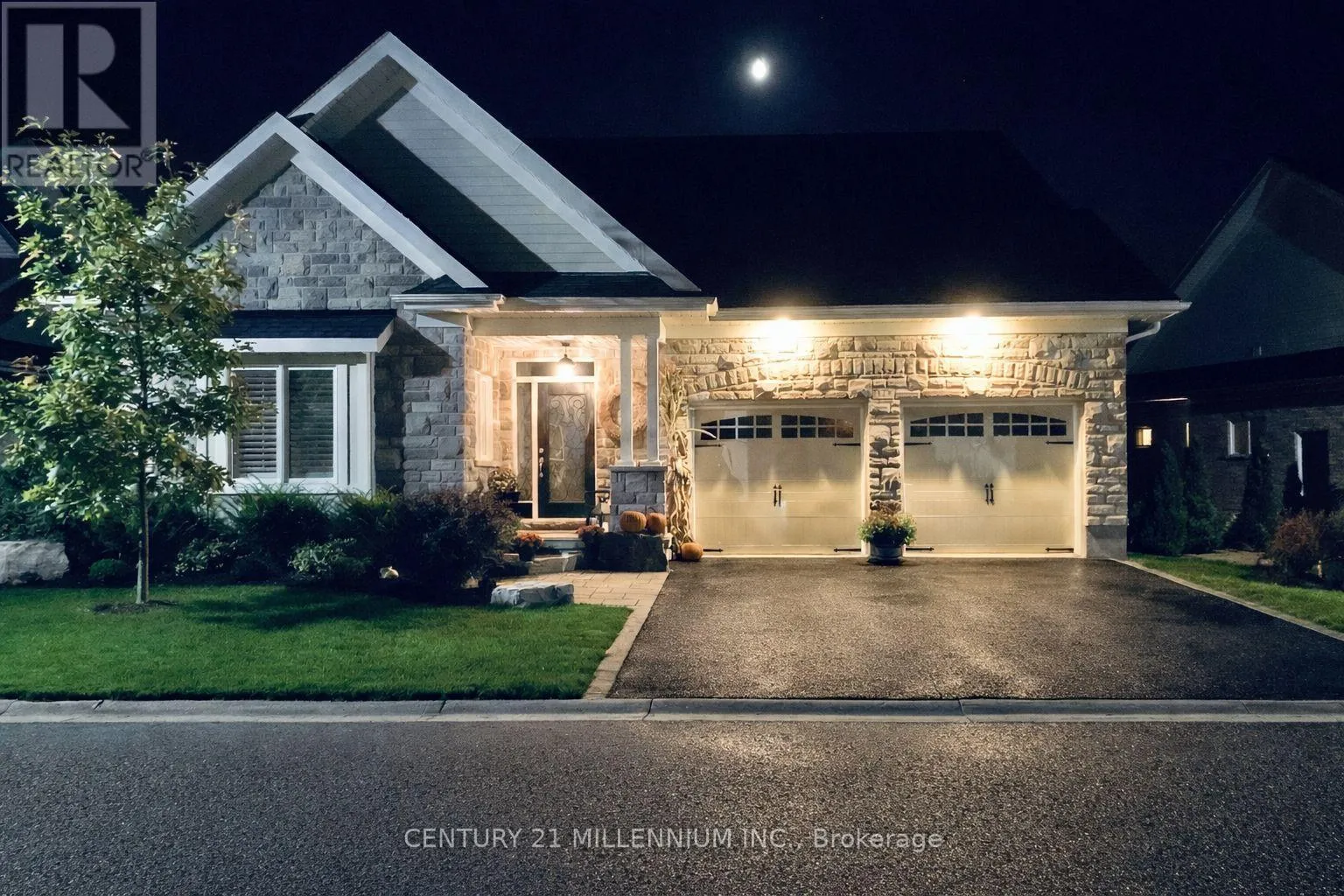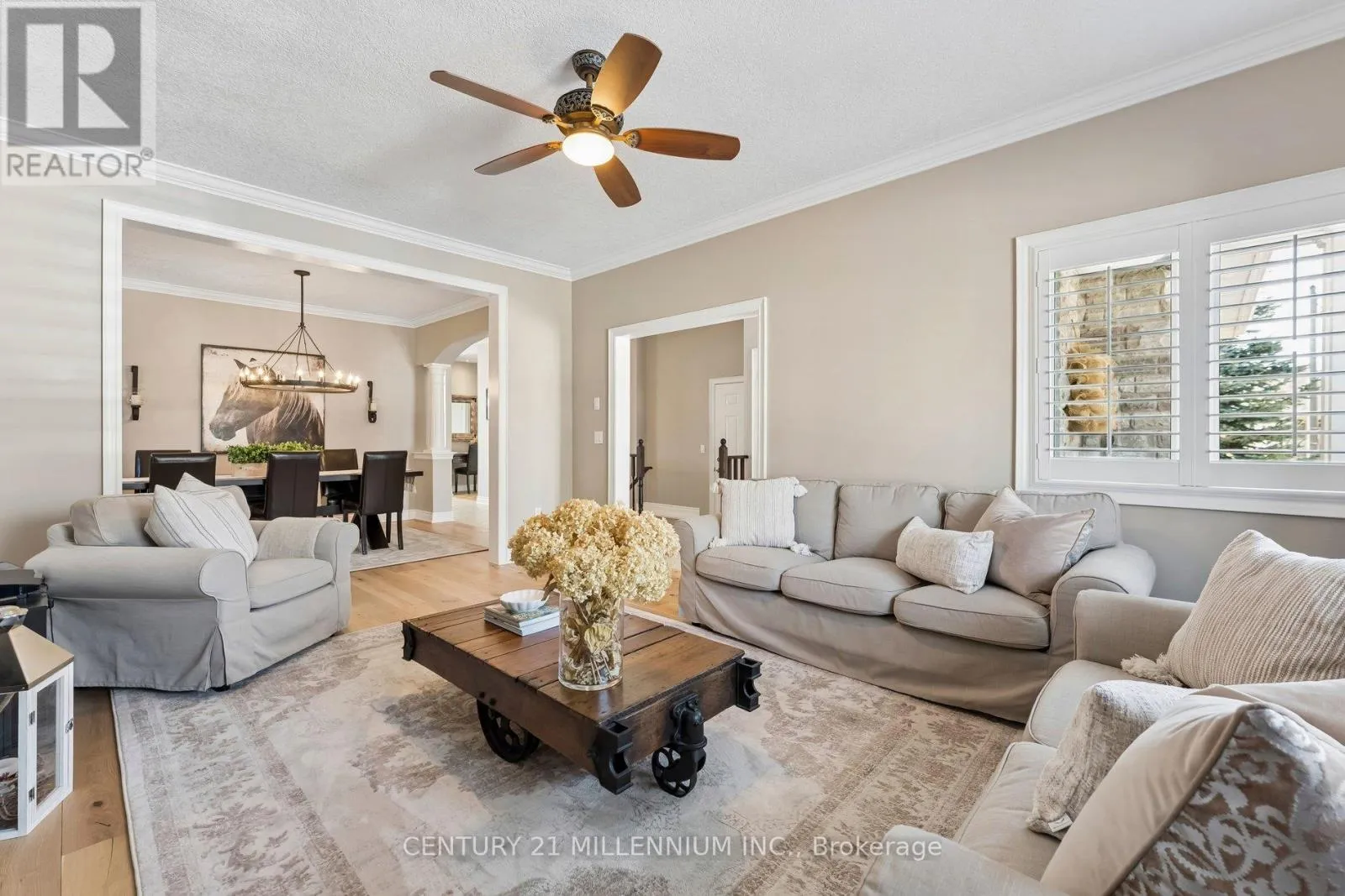 Cross Streets: AKA 123 Strathmore Way, Mono. ** Directions: Kingfisher Dr to Carolina to Strathmore Way #123. Welcome to this beautifully maintained 2+2 bedroom Strathmore Model bungalow located in the highly sought-after Watermark Adult Lifestyle Community in Mono and set on a premium ravine lot with breathtaking views over Monora Park. Offering approx. 1,983 sq ft on the main level plus a builder-finished walkout basement, this home delivers nearly 3,200 sq ft of finished living space. The main floor features 9-ft ceilings, wide-plank white oak engineered hardwood (2023), and elegant living and dining spaces with crown moulding and upgraded finishes. The stunning great room boasts vaulted ceilings, floor-to-ceiling windows with transoms, and a striking custom chandelier, creating a warm, resort-inspired feel. Two custom floor-to-ceiling gas fireplaces add both style and comfort. The upgraded kitchen offers oak cabinetry, granite counters, custom backsplash, and a functional layout. The primary suite features scenic park views and a spa-like 5-piece ensuite, while a second bedroom/office and 3-piece bath complete the main level. The bright walkout basement includes two additional bedrooms, a full bath, and a spacious open-concept living area with direct backyard access. Professionally landscaped grounds, featured in Living Spaces magazine, showcase a private backyard oasis with a water feature, stonework, and an extended deck with glass railing and retractable awning overlooking the ravine. Residents enjoy access to a private community centre with fitness, theatre, party room, and more, all steps to trails and just minutes to Orangeville amenities, Hockley Valley Resort, and Island Lake Conservation Area. (id:27476)
