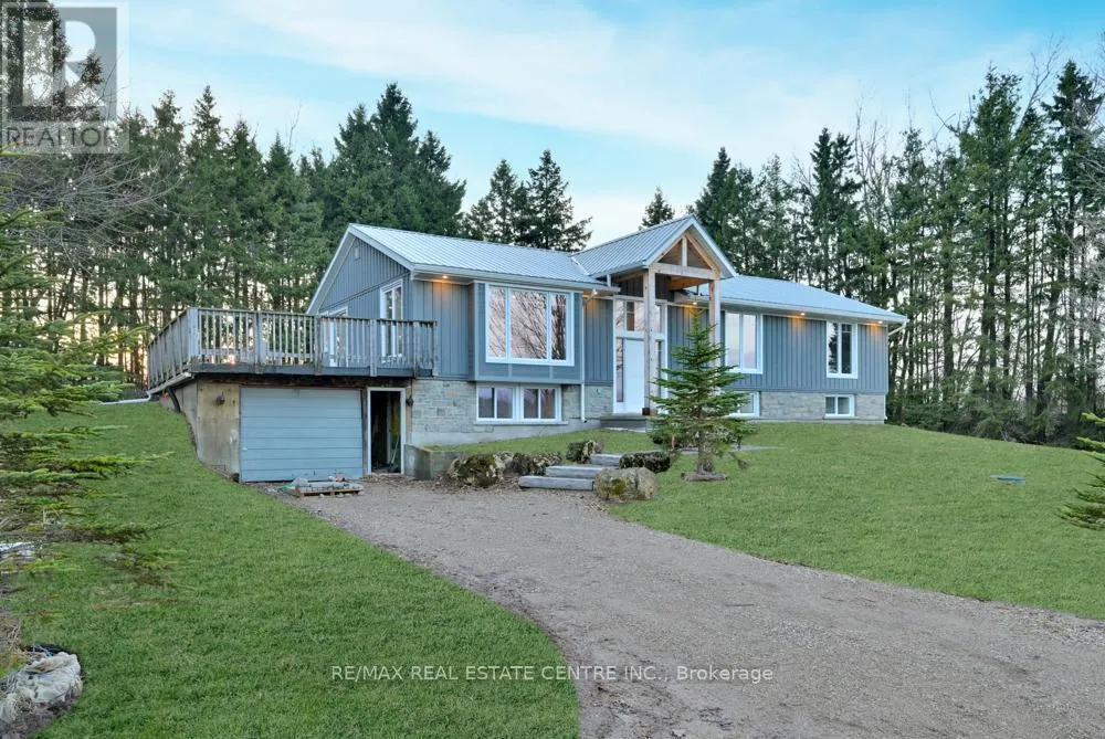 Cross Streets: Mono Centre Rd and 1st Line. ** Directions: Hwy 10 to Mono Centre Rd east to 1st Line Mono. Stunning 24.8 acre property in the hills of Mono. Great location just off paved road and minutes to Orangeville and major highways. All the benefits of of a peaceful lifestyle with easy access to all amenities. Unique raised bungalow offering a host of benefits with a country lifestyle. Home has been totally recreated with top quality and custom finishing. New siding and windows. New electrical service and wiring. New plumbing throughout. New furnace and ducting. Steel roof. Great new floor plan. Property rises to the rear and has amazing views over surrounding countryside. Property zoning allows for second dwelling on property making it the ideal property for the extended family. Quonset hut on site is easily adaptable to many uses and a great place to store life's treasures. Taxes are based on farm rate. Land survey attached. Private well and septic system. Septic pump out and risers added in 2024. Approval for secondary outbuilding approved (concept drawing attached). This is a property you won't want to miss seeing. Home sits well back from road for the ultimate in privacy. (id:27476)