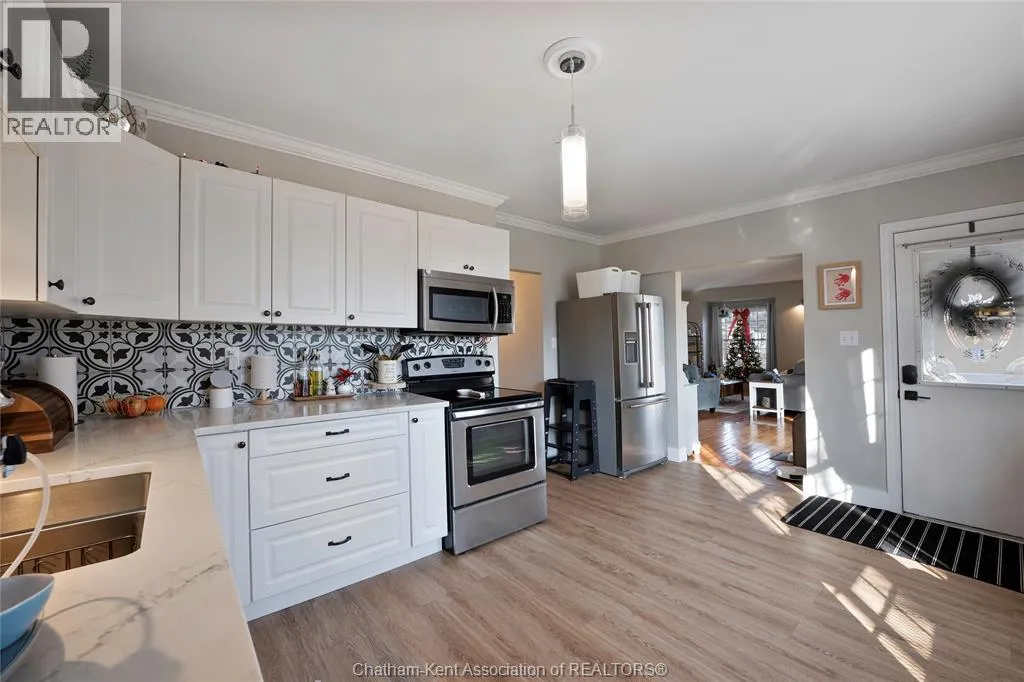 Welcome to 19120 Hill Road, Morpeth â a truly charming 1¾-storey home that has been lovingly updated from top to bottom and is ready for you to move right in. This cute and cozy 3-bedroom, 1.5-bathroom property perfectly blends character with modern upgrades, offering peace of mind and everyday comfort. The home features a newer drilled well and a thoughtfully insulated crawl space with spray foam insulation, housing the well tank, filtration system, and furnace. Major mechanical updates include a newer Square D 100-amp copper electrical panel and a newer hot water tank. The convenience continues with a main-floor laundry room, ideal for busy households. Inside, youâll love the stylish updates throughout. The kitchen boasts new vinyl flooring, a newer backsplash, and quartz countertops, while both the kitchen and bathrooms have been tastefully renovated within the last five years. Refinished hardwood floors add warmth and character, complemented by vinyl windows that enhance efficiency and natural light. Outdoor living is just as impressive. Relax on the newly replaced covered front porch or entertain on the new interlocking brick patio overlooking the fully fenced yard, completed three years ago with elegant iron gate. This property offers both beauty and functionality in every detail. Located in the welcoming community of Morpeth, residents enjoy small-town charm with big-hearted amenities. Fun fact: Morpeth is home to a well-loved community centre that hosts local events and activities, and nature lovers will appreciate nearby Greenview, perfect for enjoying the outdoors. Plus, youâre just a short drive to Blenheim and Ridgetown, giving you easy access to shopping, dining, schools, and healthcare. This home has truly been touched from top to bottom â and it does not disappoint. (id:27476)