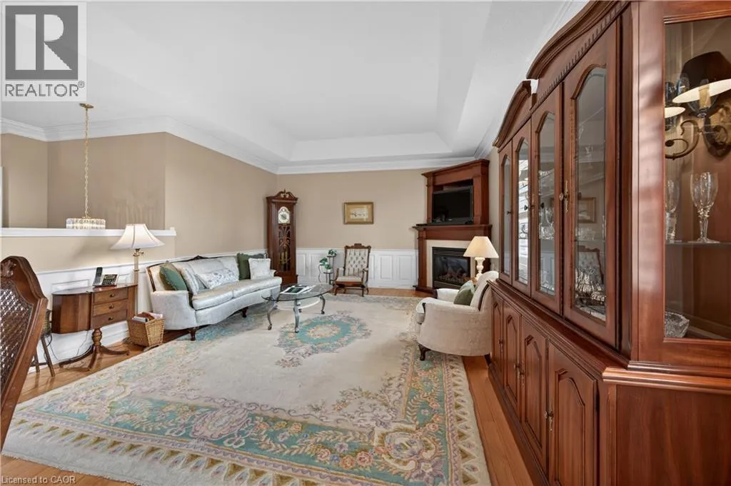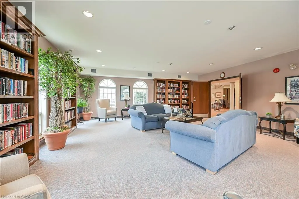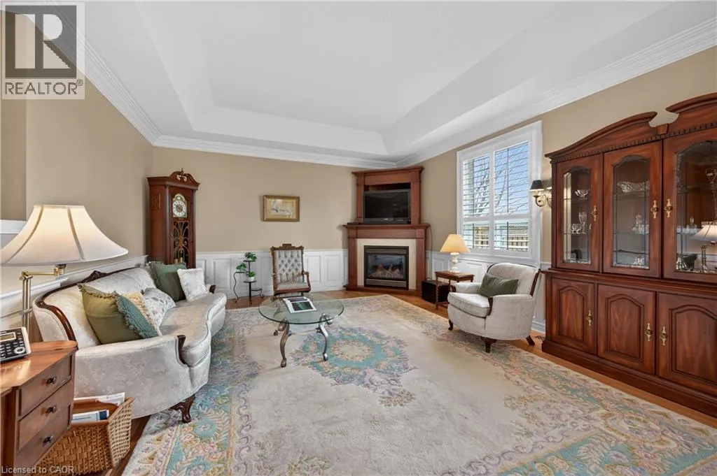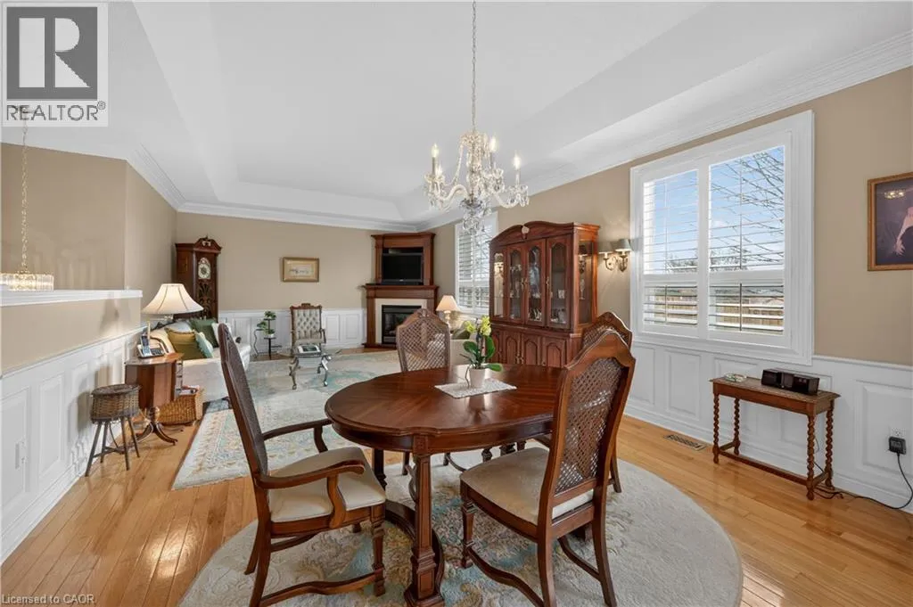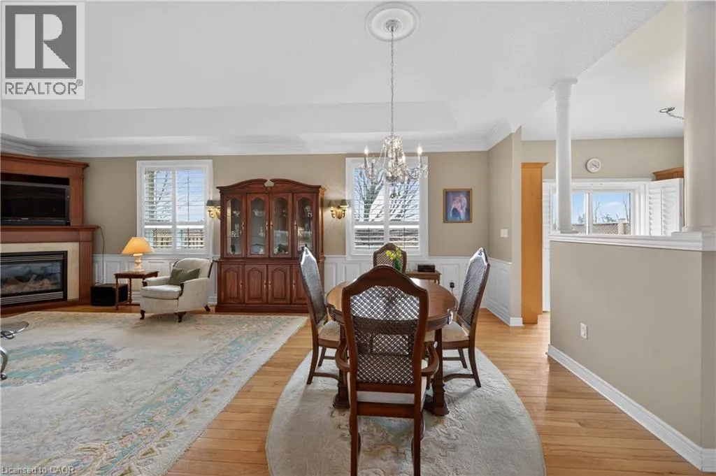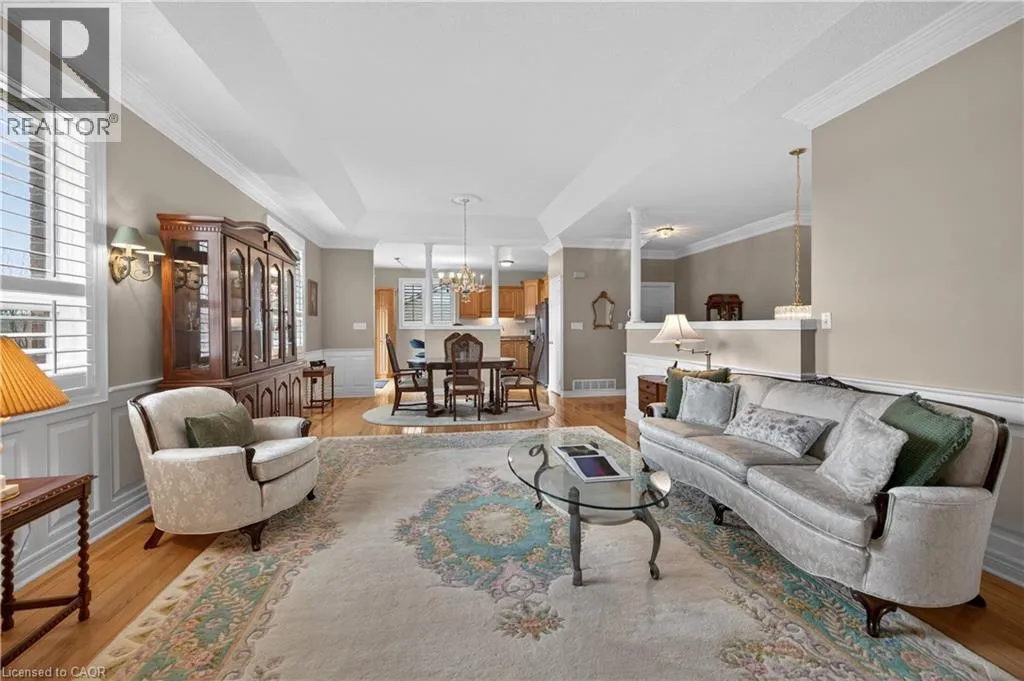 Highway 6 (Upper James) west on Twenty Road, Right at first entrance to Twenty place Rarely offered in the highly desirable Twenty Place; an adult lifestyle community, this fully detached home provides the perfect blend of comfort, space, and community living. Featuring a double car garage with inside entry, this well-maintained home is beautifully finished with an inviting open-concept main floor with a large living room with fireplace, a dining room, and a spacious eat-in kitchen. Enhanced by hardwood flooring, California shutters, and crown moulding throughout the main living areas. The functional layout includes 2 bedrooms, 2.5 bathrooms, and a fully finished lower level with abundant storage space. Step outside to enjoy a generous yard backing onto green space, offering a peaceful and private backdrop. Residents of Twenty Place enjoy access to exceptional amenities, including a pool, hot tub, sauna, exercise room, library, party room with kitchen, shuffleboard courts, and tennis/pickleball court. A wonderful opportunity to enjoy relaxed, low-maintenance living in a vibrant and well-established community. (id:27476)