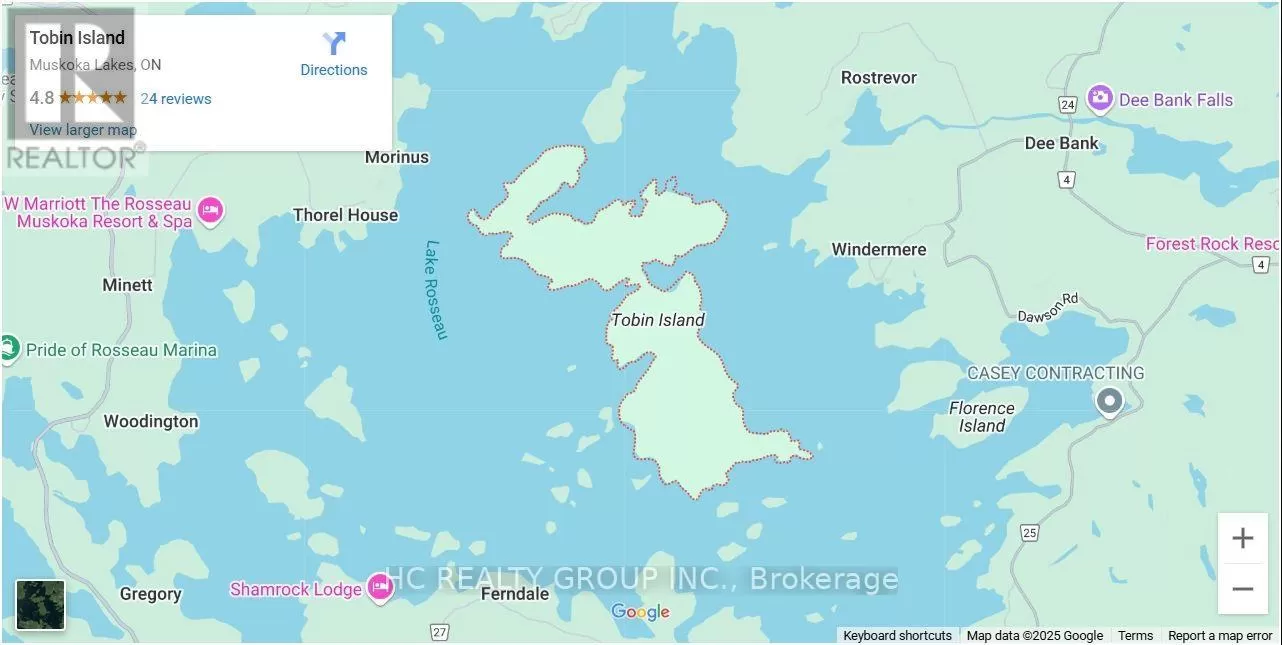 Cross Streets: Tobin Island/Lake Rosseau. ** Directions: Vacant residential/recreational land on water. This exceptional property offers a rare opportunity to own one of the finest land on the lake, situated on the prestigious and sought-after Tobin Island in Lake Rosseau, Muskoka. Live on the same island as Canada's most famous celebrities and wealthy people. Spanning 31 acres with 501 feet of pristine, deep-water shoreline, the property combines unparalleled privacy with convenient accessibility. The expansive lot features breathtaking panoramic views of the lake and surrounding islands, complemented by a mature forested landscape. Ideal for development, this site offers the perfect foundation for a luxury cottage or custom retreat. With ample space, you can design a unique waterfront mansion and boat house, cottages, and your private beach access, creating a genuinely exceptional lakeside escape. (id:27476)