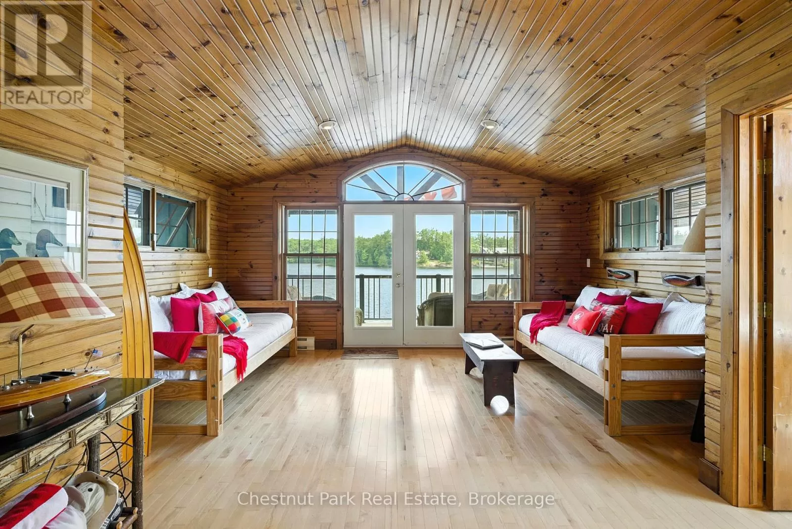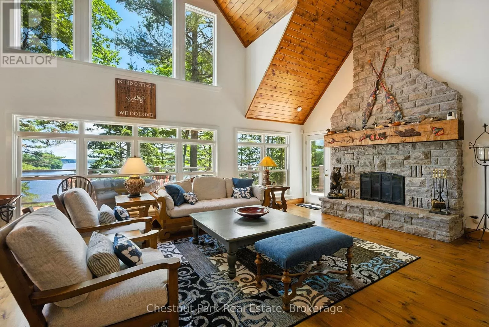 Cross Streets: N. Acton Island Road/Innisfree Road. ** Directions: Muskoka District Road 169 to N. Acton Island Road to Innisfree Road to #1341. A wonderful opportunity to own a rare piece of Muskoka's finest. Nestled on prestigious Acton Island and graced by the shimmering waters of Lake Muskoka, this stunning four Bedroom, two and a half Bathroom cottage offers an unparalleled blend of refined comfort, natural beauty and timeless elegance. The heart of this year round cottage is an expansive open-concept living, dining and kitchen area, anchored by a majestic full-height wood-burning fireplace. Expansive windows gift you with views of the lake and wood accents help bring nature in. The Chef's kitchen is ideal for entertaining, featuring a generous island, custom cabinetry and seamless flow to principal gathering spaces. The main floor Primary Bedroom acts as your own private sanctuary, complete with a recently renovated spa inspired ensuite and walkout to the deck. The upper level boasts three additional bedrooms and a 4 piece washroom each with stunning views and an abundance of natural light. Curated for both comfort and connection, this beautiful cottage includes a cozy additional sitting room and a light filled three season Muskoka Room-the perfect spot to enjoy morning coffee or evening cocktails. Step outside to the expansive deck, where a contemporary glass rail system enhances unobstructed views of lake Muskoka- an idyllic setting for dining, lounging and soaking in the scenery. Follow the gentle sloping pathway to the impressive two storey boathouse, nestled on 275 feet of shoreline where upper level living quarters boast two bedrooms and a four piece washroom making it the perfect place for guests or extended family. At the water's edge enjoy deep water and great sun with Eastern exposure. The boathouse offers 2 boat slips and an additional swim dock. Located just minutes from the charming hubs of Port Carling and Bala, this stunning cottage blends comfort, functionality and the Muskoka lifestyle you've been dreaming of. (id:27476)