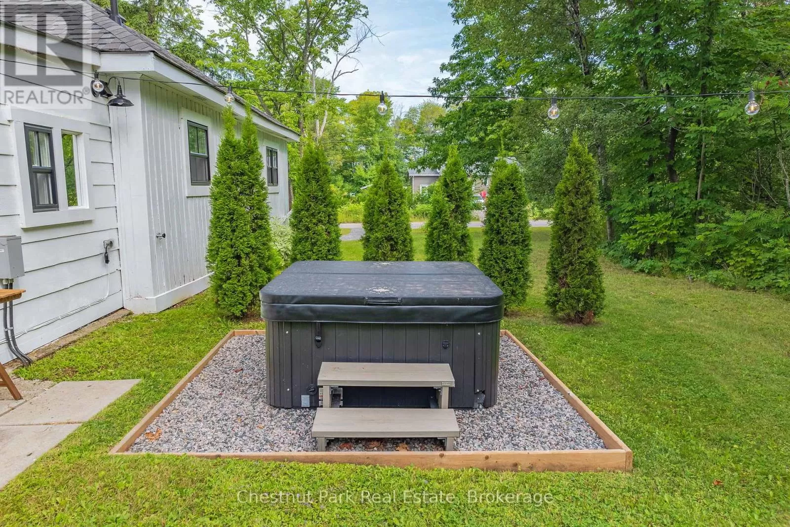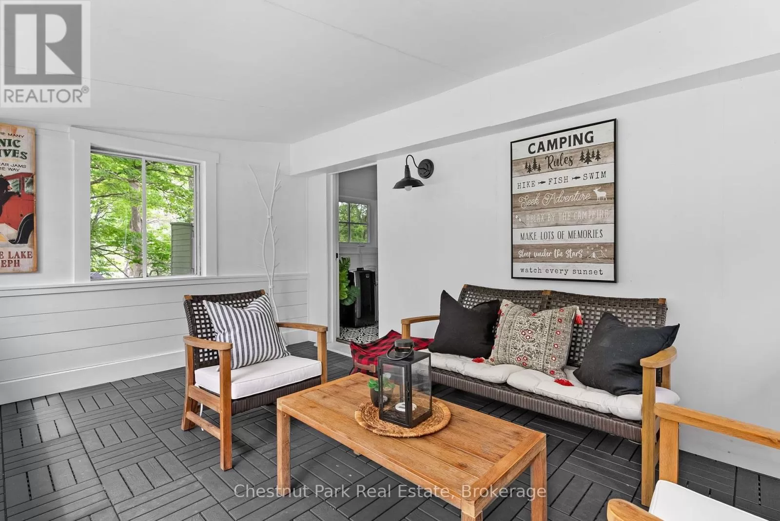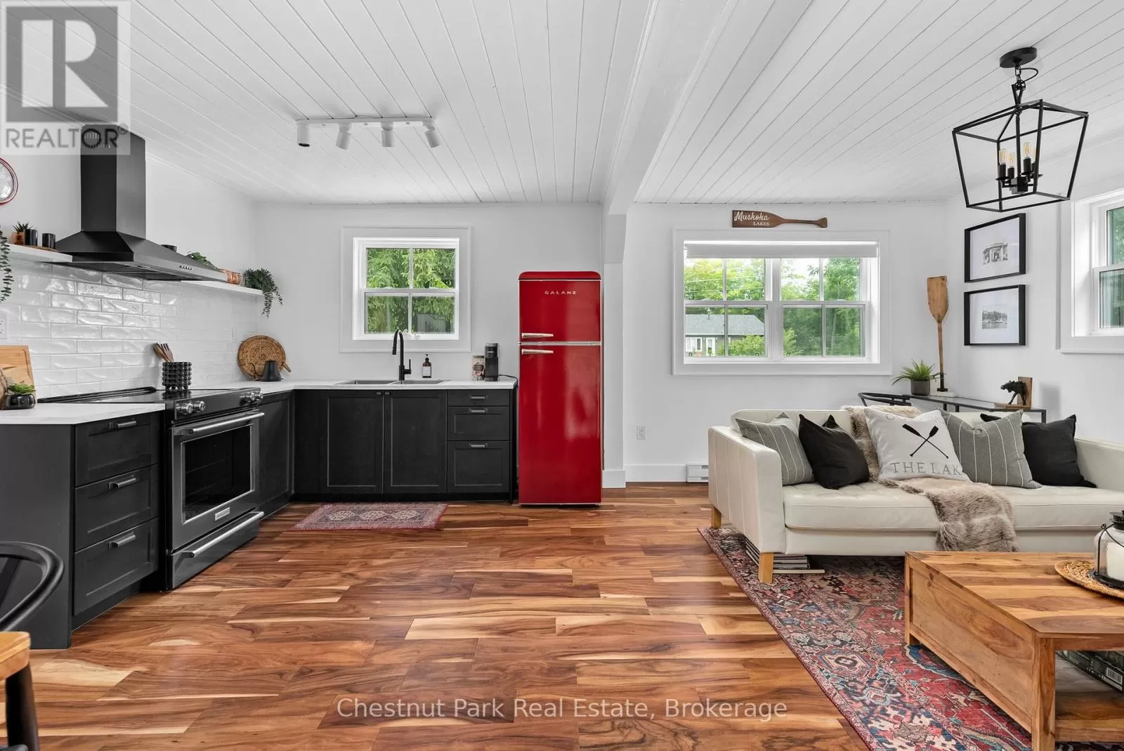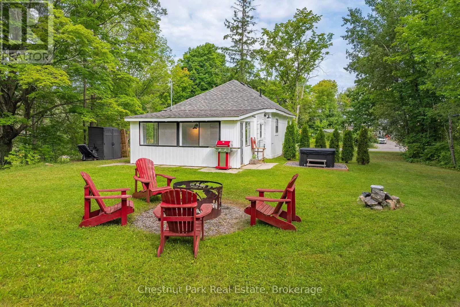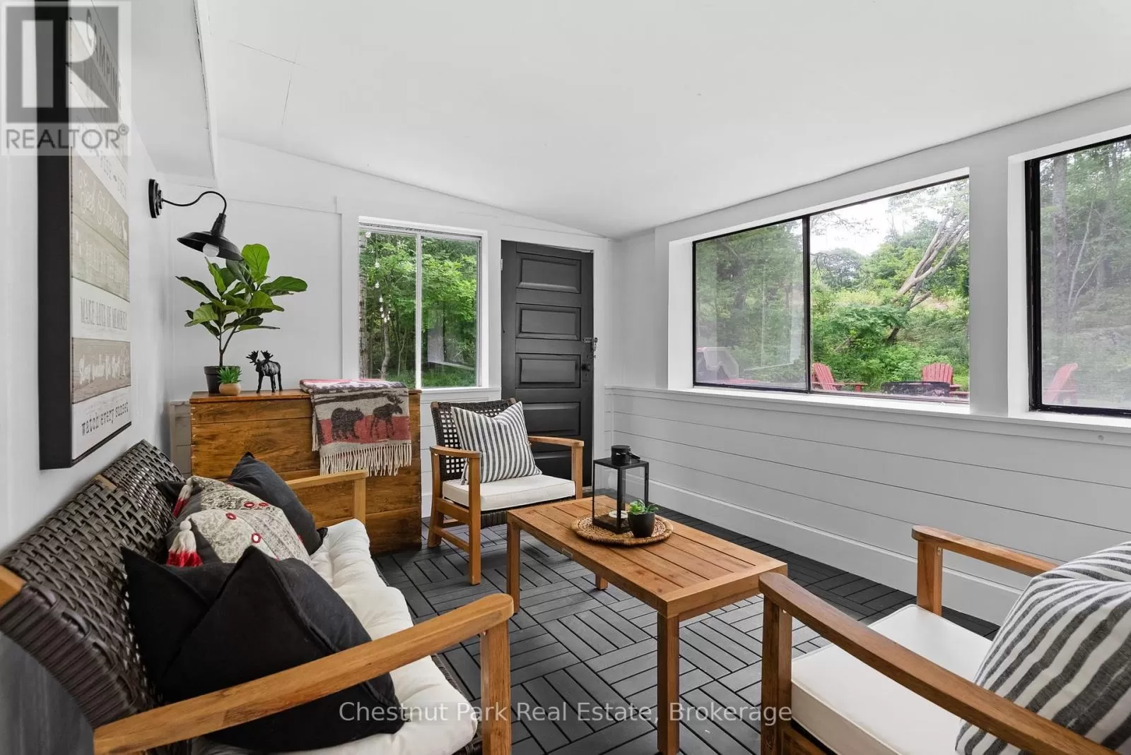 Cross Streets: LAKE JOSEPH ROAD TO MUSKOKA ROAD 169, RIGHT ONTO UNITED CHURCH ROAD, FIRST HOUSE ON THE LEFT. ** Directions: Lake Joseph Road to Muskoka Road 169, Right onto United Church Road. # 1011 - SOP. Welcome to 1011 United Church Rd, a charming 984 sq.ft., 2-bedroom, 1-bath home that beautifully blends modern comfort with rustic warmth, just steps from Lake Joseph and The Cove Marina. A welcoming foyer leads to a spacious, open-plan living area, perfect for entertaining. The modern kitchen is a dream, featuring a high-end stainless-steel range, a retro fridge, and a custom backsplash. Throughout the home, rich acacia hardwood floors, contemporary windows, and interior shiplap create a cozy atmosphere, complemented by a gorgeous bathroom updated in 2021 with a luxurious rain shower. You can also enjoy the outdoors from the inviting 3-season Muskoka room, which offers stunning views of the surrounding woods and granite outcroppings. The backyard is a private oasis, ideal for relaxing in the hot tub (2022) or gathering around the fire pit and barbecue area. The property is equipped for year-round living with baseboard heaters and smart thermostats, which, along with an electronic keypad lock, allow for remote monitoring of heat and access, providing peace of mind. Additional updates include the electrical system and roof shingles, both from 2020. This home is ideally situated across the road from The Cove Marina for easy boat access to Lake Joseph and is just minutes away from fine dining, shopping, golf, and spas. This home is best seen to be fully appreciated! (id:27476)