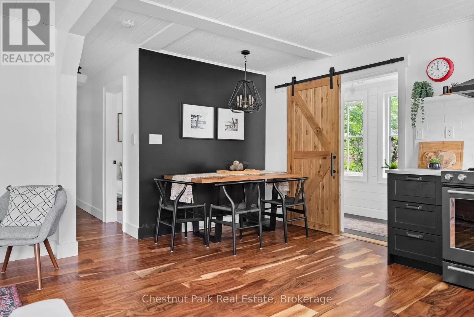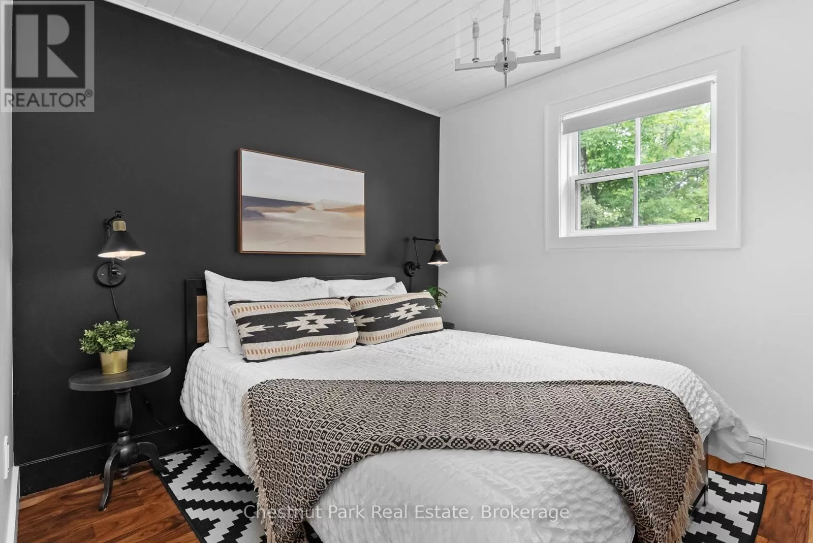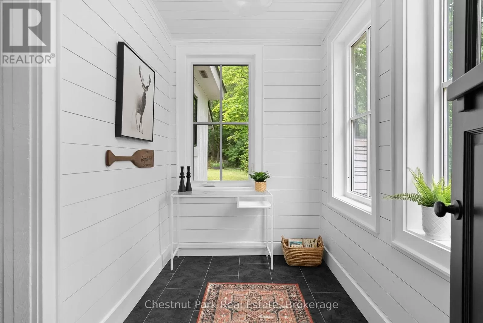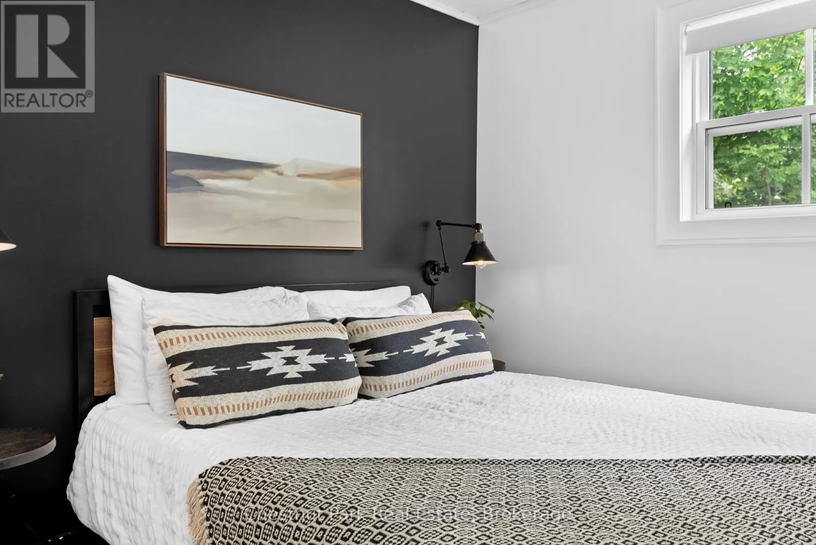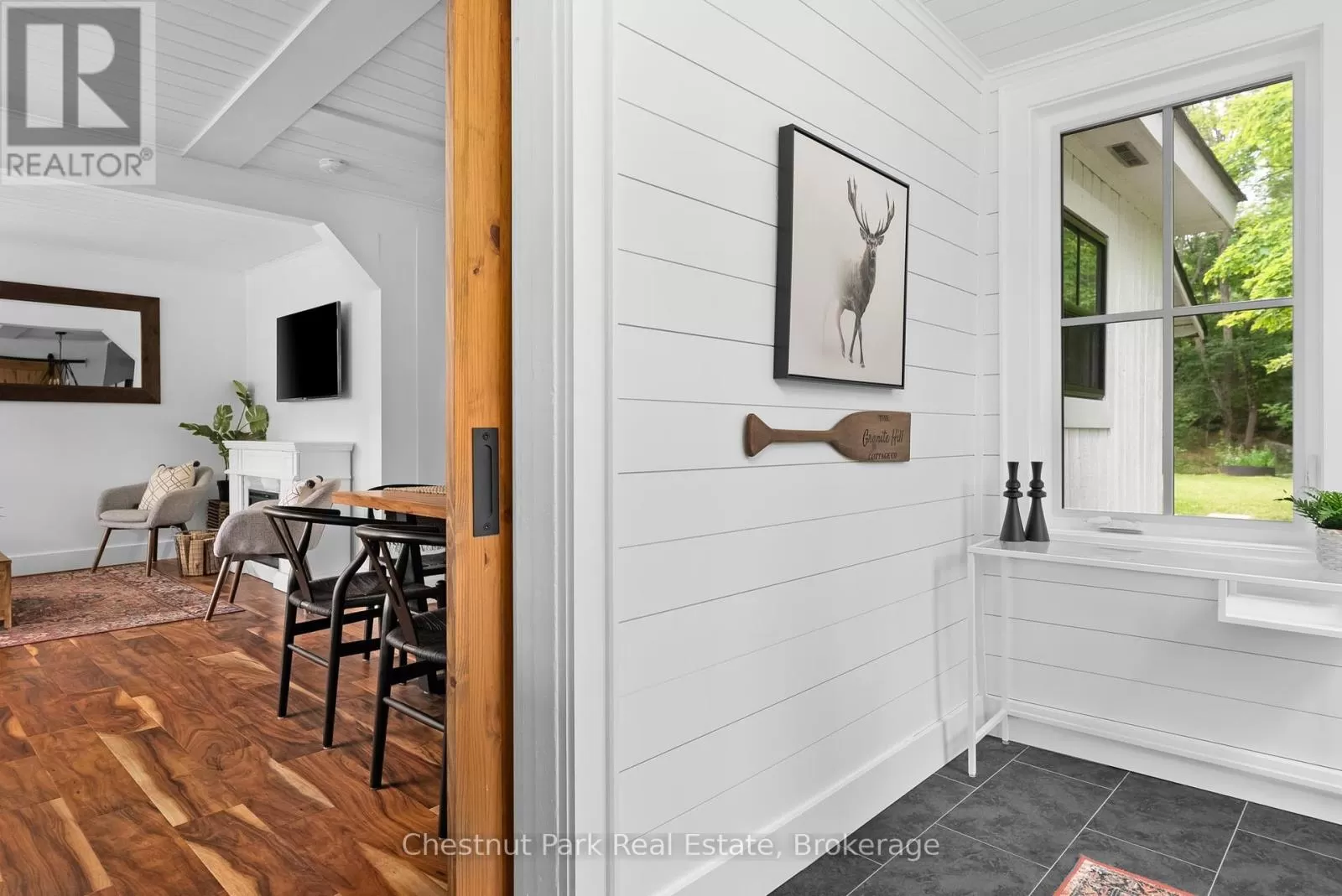 Cross Streets: LAKE JOSEPH ROAD TO MUSKOKA ROAD 169, RIGHT ONTO UNITED CHURCH ROAD, FIRST HOUSE ON THE LEFT. ** Directions: Lake Joseph Road to Muskoka Road 169, Right onto United Church Road. # 1011 - SOP. Welcome to 1011 United Church Rd, a charming 984 sq.ft., 2-bedroom, 1-bath home that beautifully blends modern comfort with rustic warmth, just steps from Lake Joseph and The Cove Marina. A welcoming foyer leads to a spacious, open-plan living area, perfect for entertaining. The modern kitchen is a dream, featuring a high-end stainless-steel range, a retro fridge, and a custom backsplash. Throughout the home, rich acacia hardwood floors, contemporary windows, and interior shiplap create a cozy atmosphere, complemented by a gorgeous bathroom updated in 2021 with a luxurious rain shower. You can also enjoy the outdoors from the inviting 3-season Muskoka room, which offers stunning views of the surrounding woods and granite outcroppings. The backyard is a private oasis, ideal for relaxing in the hot tub (2022) or gathering around the fire pit and barbecue area. The property is equipped for year-round living with baseboard heaters and smart thermostats, which, along with an electronic keypad lock, allow for remote monitoring of heat and access, providing peace of mind. Additional updates include the electrical system and roof shingles, both from 2020. This home is ideally situated across the road from The Cove Marina for easy boat access to Lake Joseph and is just minutes away from fine dining, shopping, golf, and spas. This home is best seen to be fully appreciated! (id:27476)