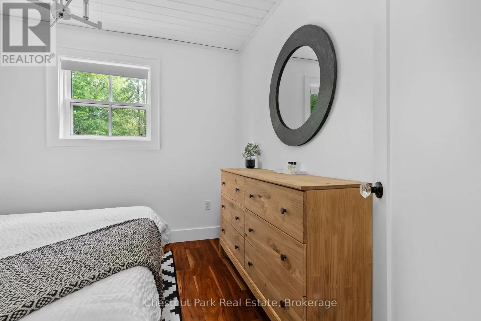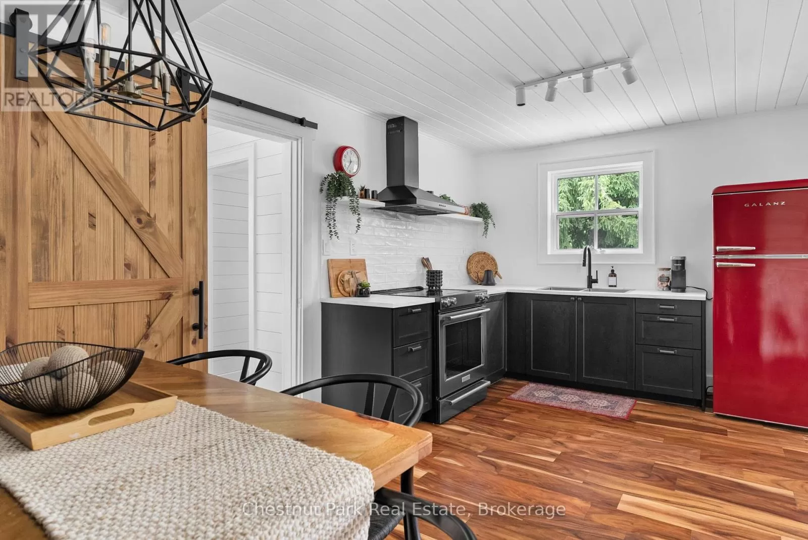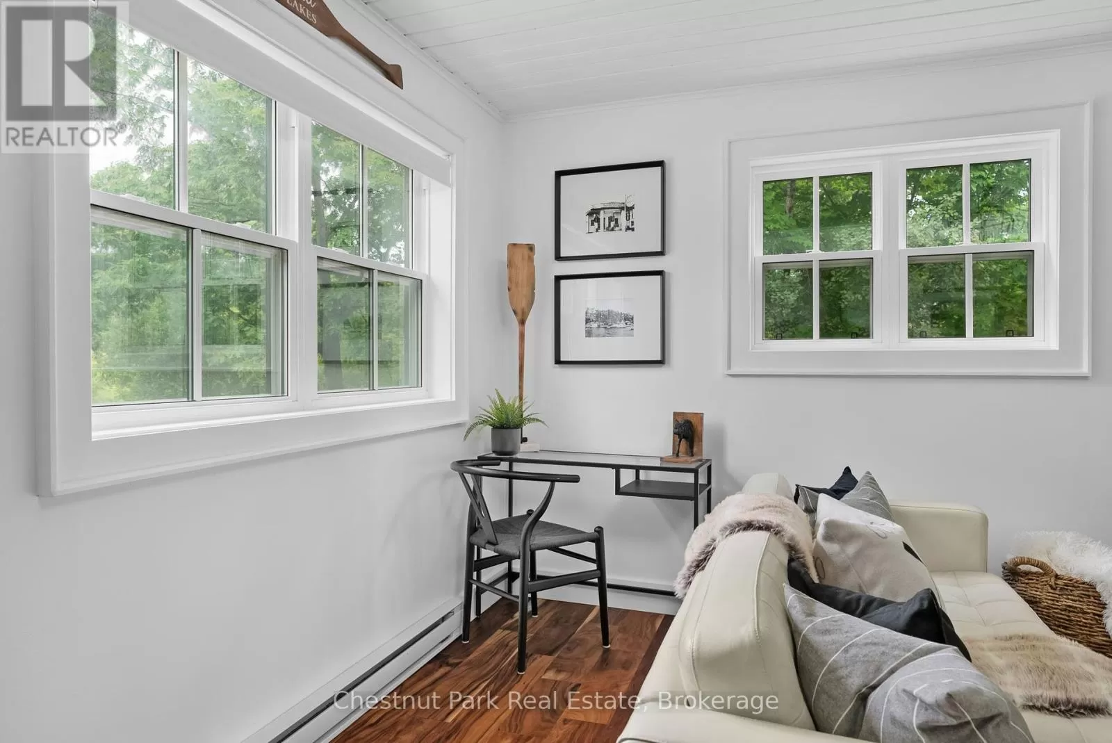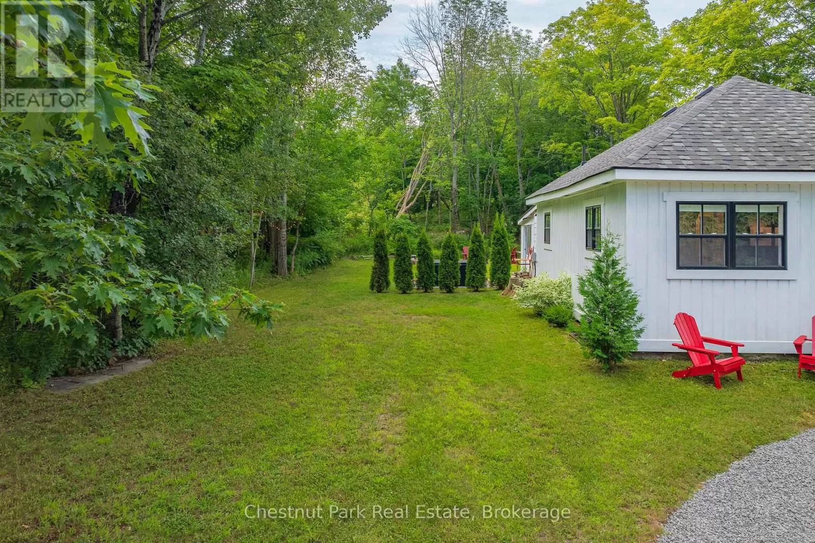 Cross Streets: LAKE JOSEPH ROAD TO MUSKOKA ROAD 169, RIGHT ONTO UNITED CHURCH ROAD, FIRST HOUSE ON THE LEFT. ** Directions: Lake Joseph Road to Muskoka Road 169, Right onto United Church Road. # 1011 - SOP. Welcome to 1011 United Church Rd, a charming 984 sq.ft., 2-bedroom, 1-bath home that beautifully blends modern comfort with rustic warmth, just steps from Lake Joseph and The Cove Marina. A welcoming foyer leads to a spacious, open-plan living area, perfect for entertaining. The modern kitchen is a dream, featuring a high-end stainless-steel range, a retro fridge, and a custom backsplash. Throughout the home, rich acacia hardwood floors, contemporary windows, and interior shiplap create a cozy atmosphere, complemented by a gorgeous bathroom updated in 2021 with a luxurious rain shower. You can also enjoy the outdoors from the inviting 3-season Muskoka room, which offers stunning views of the surrounding woods and granite outcroppings. The backyard is a private oasis, ideal for relaxing in the hot tub (2022) or gathering around the fire pit and barbecue area. The property is equipped for year-round living with baseboard heaters and smart thermostats, which, along with an electronic keypad lock, allow for remote monitoring of heat and access, providing peace of mind. Additional updates include the electrical system and roof shingles, both from 2020. This home is ideally situated across the road from The Cove Marina for easy boat access to Lake Joseph and is just minutes away from fine dining, shopping, golf, and spas. This home is best seen to be fully appreciated! (id:27476)