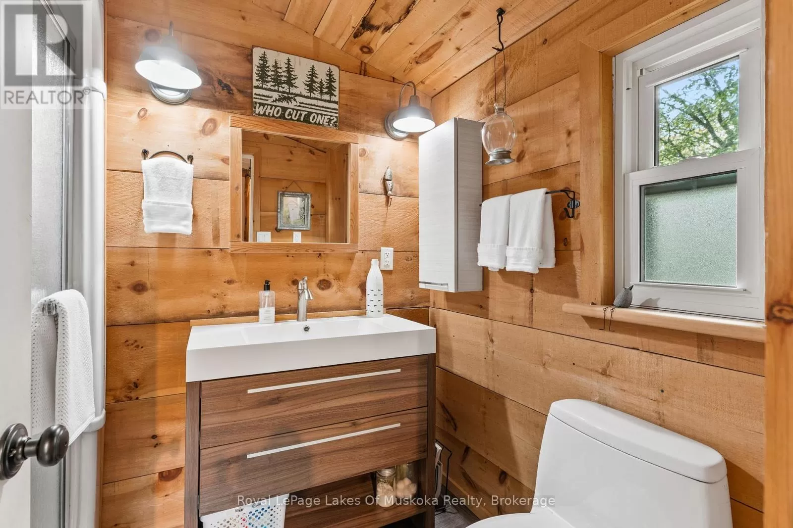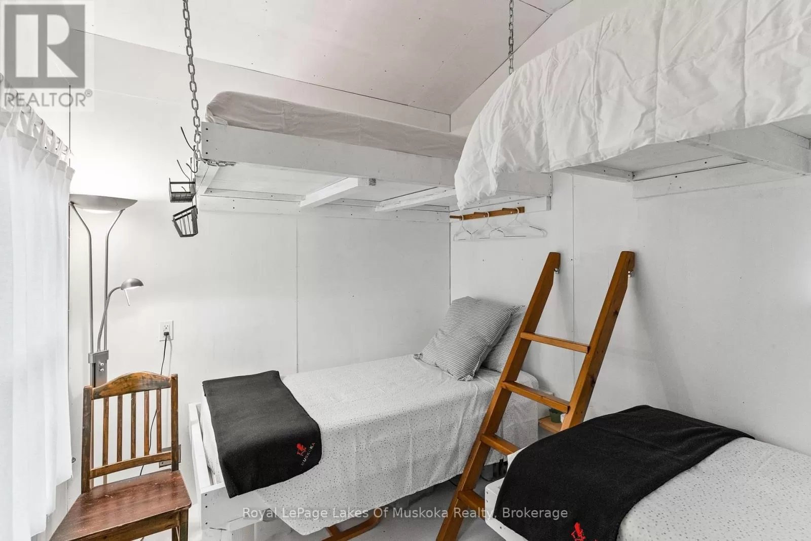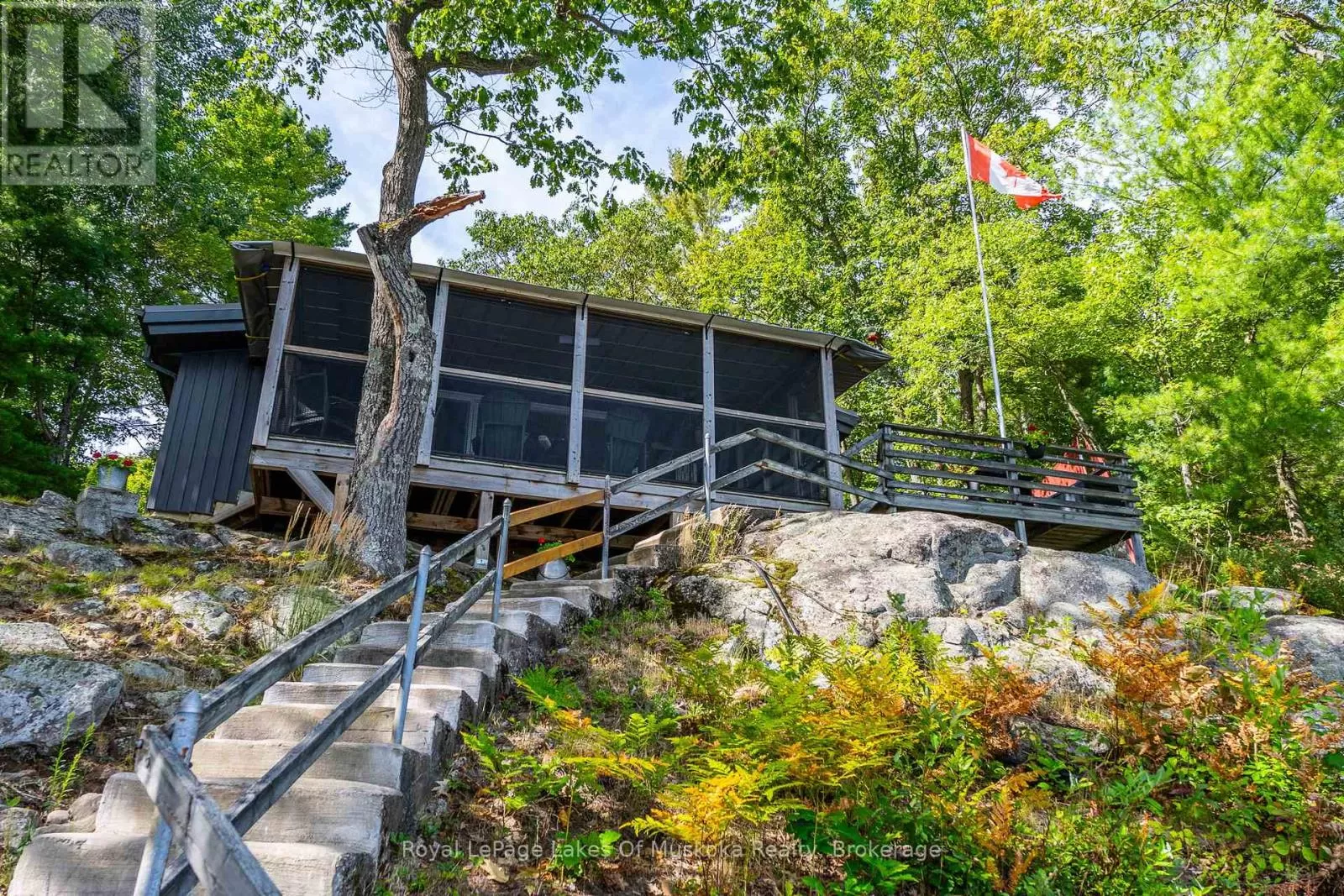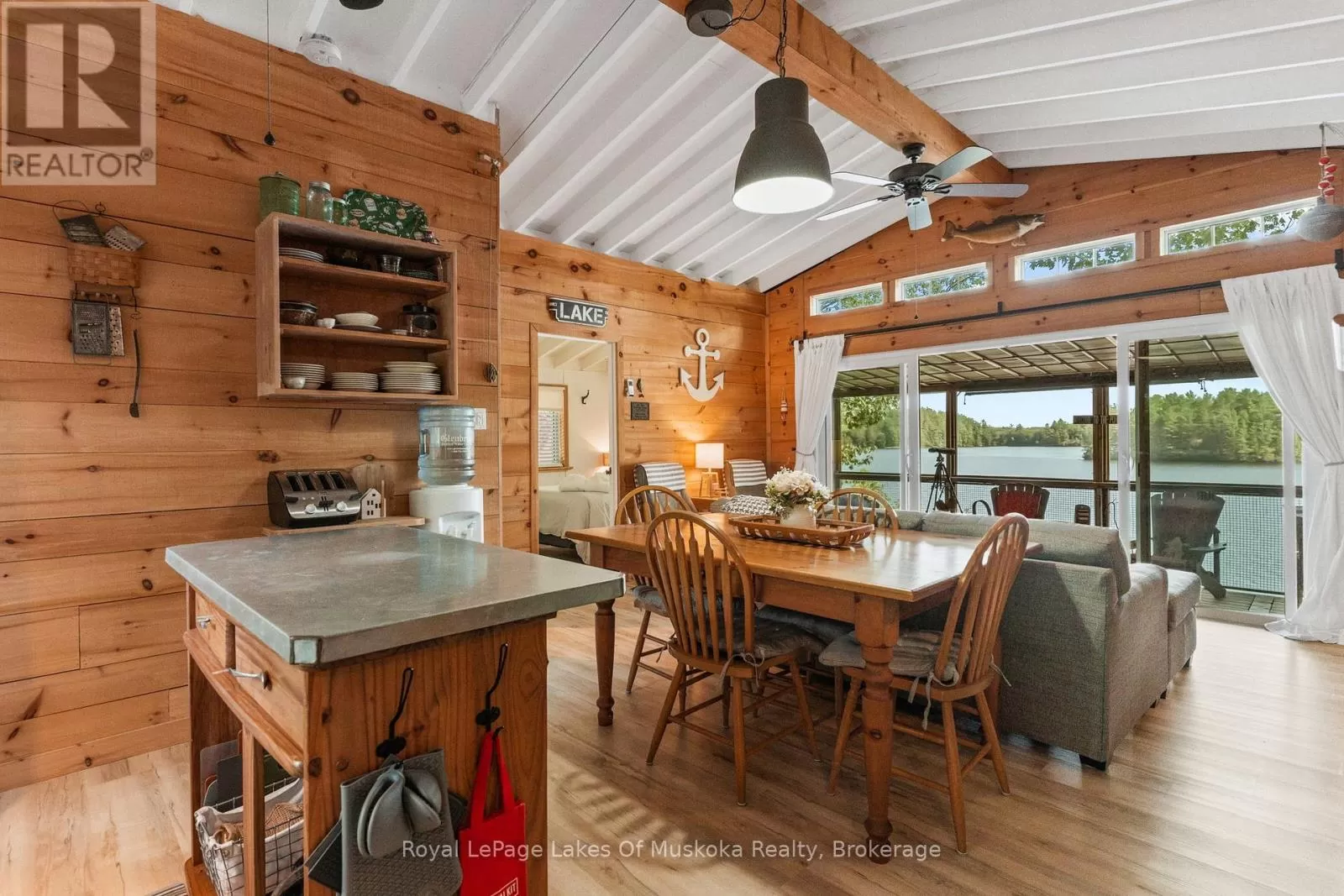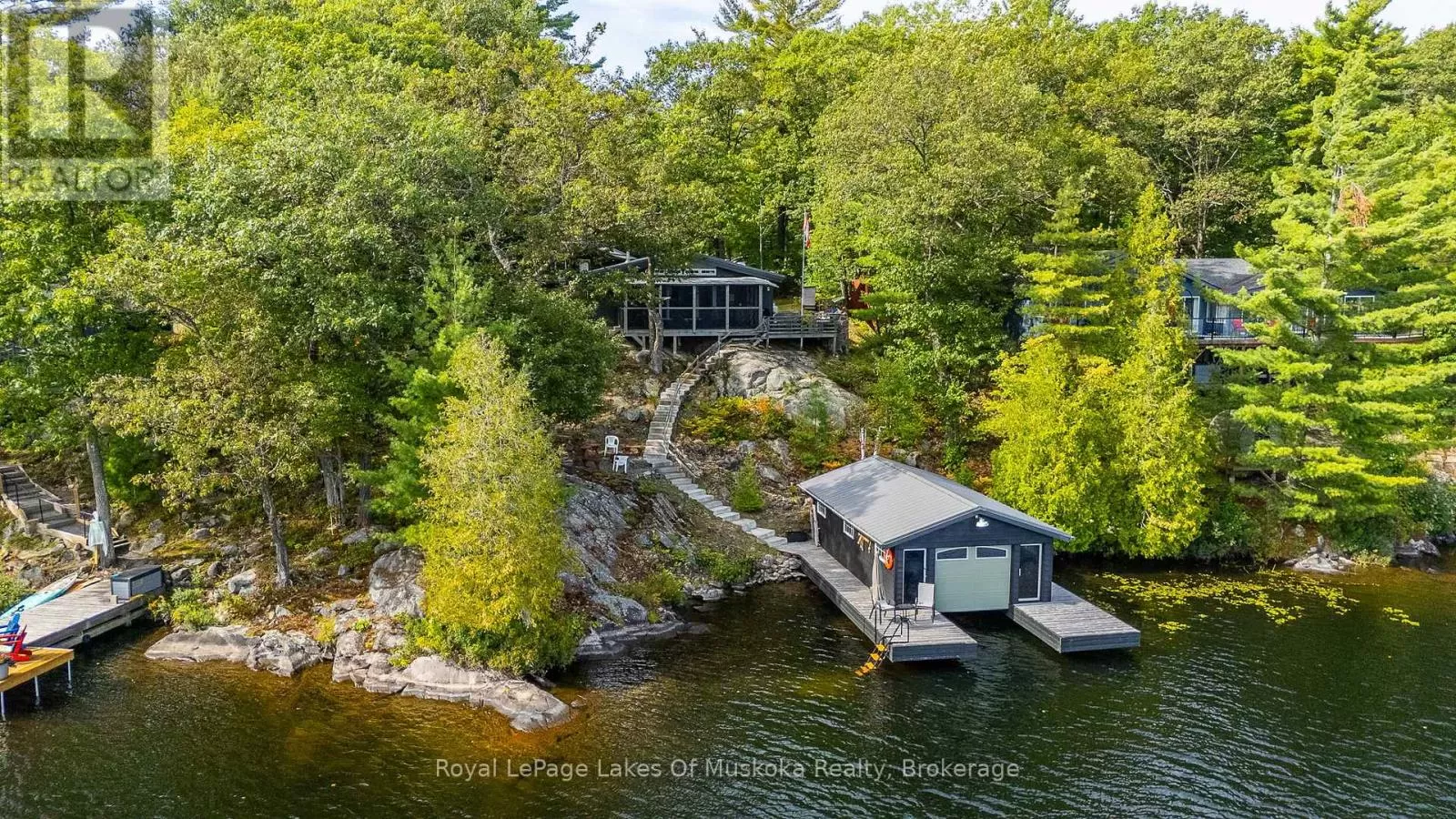 Cross Streets: 141 and Fish Hatchery Road. ** Directions: Hwy 141 to Fish Hatchery Road to sign on property. Welcome to the gem you've been waiting for. Situated on spring-fed High Lake, this charming property blends traditional cottage character with the modern comforts of year-round living. Enjoy your morning coffee or tea as you watch the mist rise off the lake from the expansive screened Muskoka room, which spans the full width of the cottage. A wide-open lake view greets you the moment you step inside whether you're preparing meals in the kitchen or relaxing in the great room, that breathtaking view is always with you. As the evenings grow cooler, the Jotul fireplace warms this fully winterized retreat, inviting you to enjoy all four seasons in comfort. Follow the path/stairs to the waterfront and unwind by the cozy fire pit seating area. Continue down to a rare find for a smaller lake a single-slip boathouse with an 8' x 24' slip to keep your boat protected and ready for the water. The shoreline is clean and deep, perfect for swimming, with a gorgeous southern exposure. For gardening enthusiasts, a charming potting shed provides space to tend your plants to your hearts content. A cozy bunkie offers additional sleeping quarters and its own front deck with lake views ideal for guests or a quiet escape. Rounding out this picturesque one acre property is a triple-car log garage featuring three hydraulic doors and a hydraulic lift in the center bay perfect for the mechanically inclined. Truly a turnkey property. Come and experience it for yourself especially during the spectacular fall season Muskoka is so well known for. (id:27476)