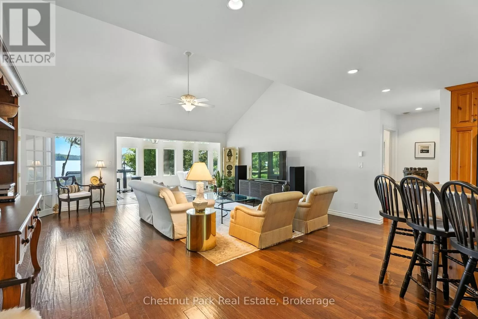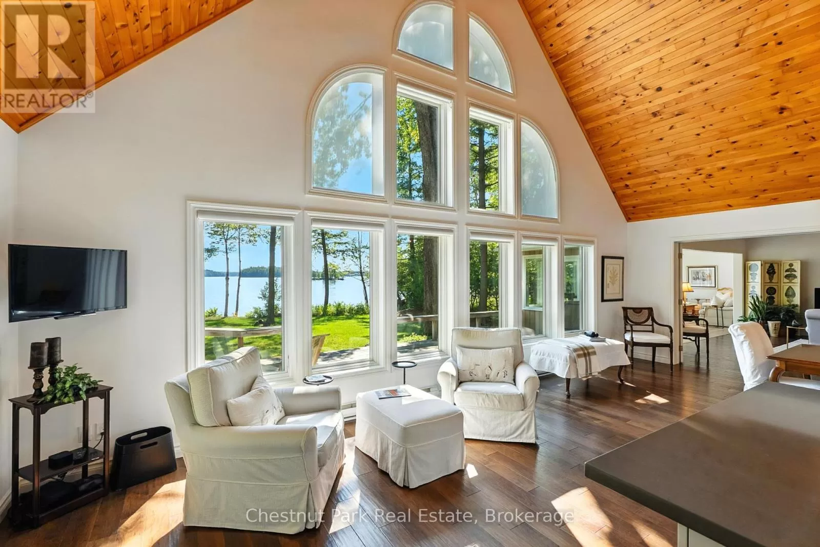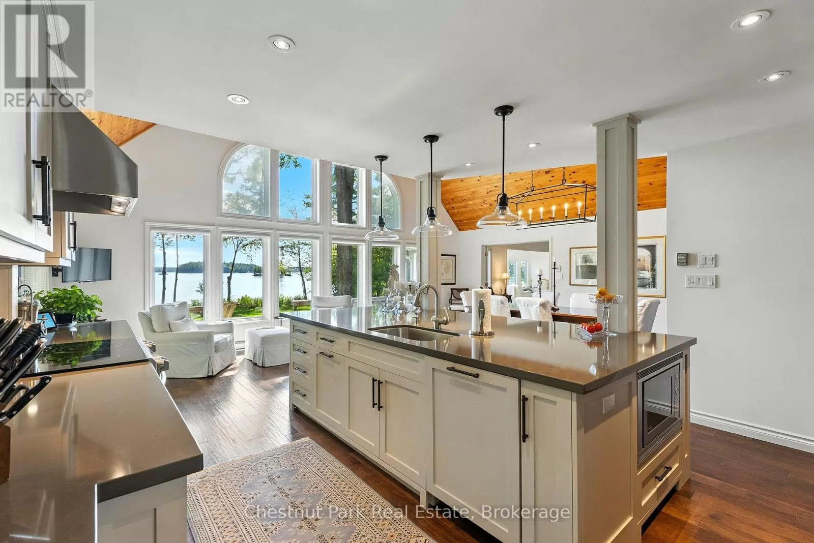 Cross Streets: Peninsula Road & Juddhaven Road. ** Directions: Minett to Juddhaven Road to Morinus Road, to 1166-2 (no signs at road). Set on the coveted shores of Lake Rosseau, this exceptional 1.7-acre family retreat offers everything you envision in a Muskoka cottage southwest exposure, a level lot, and long, protected lake views that feel like your own private paradise. With year-round access and a location just minutes from Port Sandfield and the JW Marriotts spa and dining, this property effortlessly combines seclusion with convenience. Enjoy pristine waterfront complete with a sand beach and spacious dock ideal for sun-soaked afternoons, water sports, and gathering by the lake. Mature gardens and a generous wrap-around porch frame the cottage, creating idyllic outdoor living spaces perfect for family connection and relaxed entertaining. Inside, the 4-bedroom, 3-bathroom cottage impresses with soaring vaulted ceilings and a full wall of windows that draw Lake Rosseau's beauty right into the heart of the home. An open-concept layout enhances the sense of space, anchored by a stunning chefs kitchen with quartz island and backsplash, stainless steel appliances, and a walk-in pantry. A wood-burning fireplace adds warmth and charm to the dining area, while the sunroom offers a peaceful spot to unwind. Thoughtfully designed with year-round comfort in mind and function, the home features hydronic in-floor heating, a main-floor guest suite with 3-piece bath, a versatile office or overflow bedroom, and an upper-level primary suite with a lofted office nook overlooking the living space. Engineered hardwood throughout, beautifully tiled bathrooms, and ductless AC units provide modern ease, while a paved driveway, two-car garage, and carport ensure ample parking for guests. This Lake Rosseau gem is the ultimate Muskoka escape private, picturesque, and perfectly suited for generations of family memories. (id:27476)
