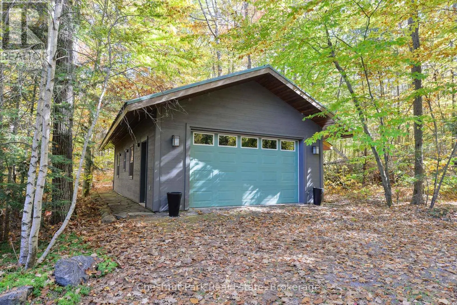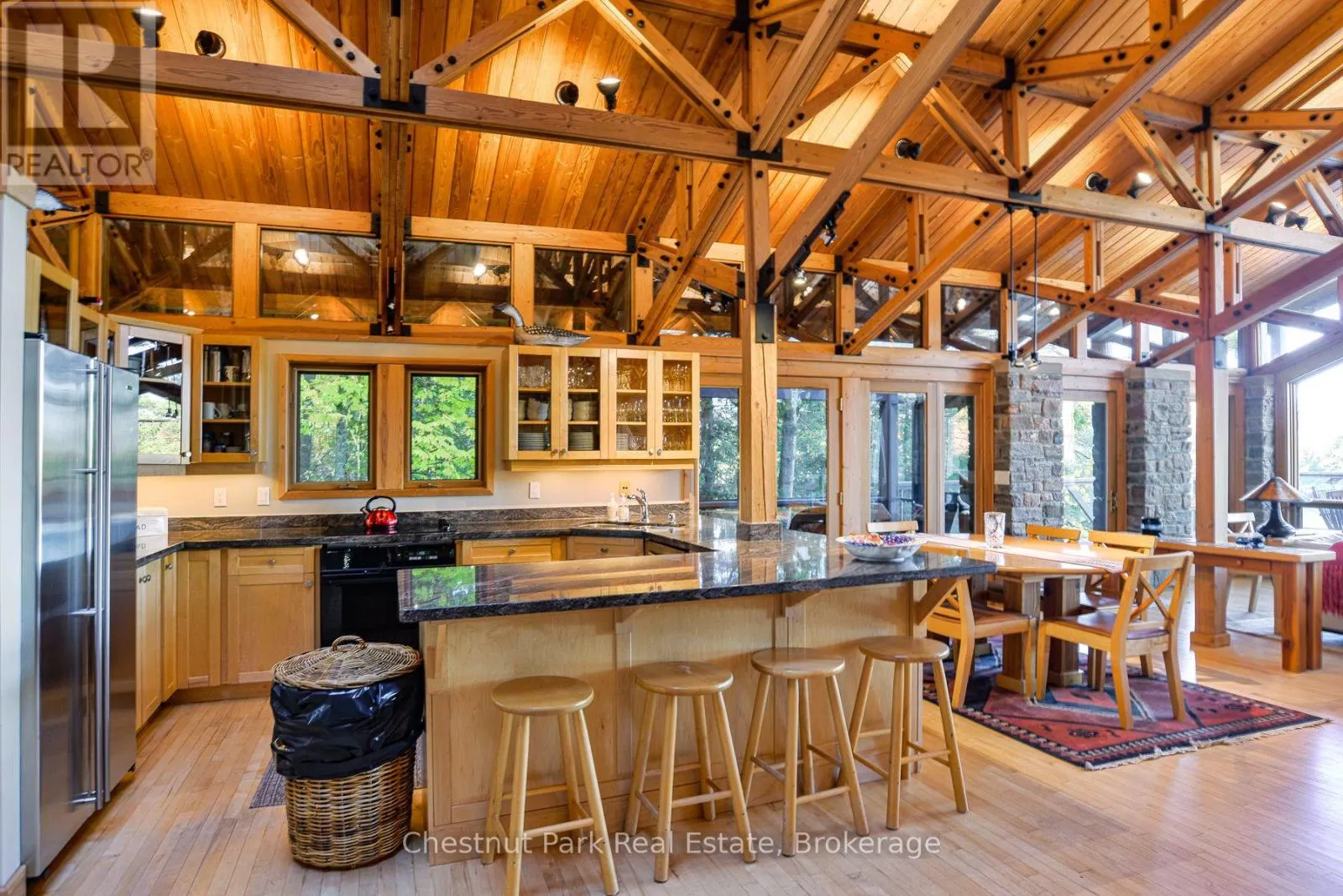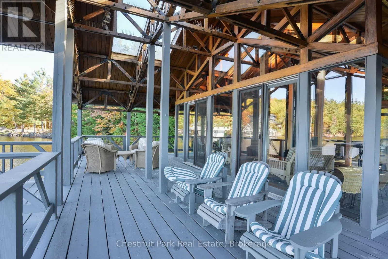Cross Streets: East Bay/Neals. ** Directions: East Bay Road to Neals Road. A rare opportunity to own an extraordinary Muskoka estate offering 635 feet of pristine lake frontage and 12.65 acres of forested privacy, just minutes from Bala. The main cottage is a stunning architectural masterpiece where rustic granite meets warm wood and walls of glass, framed by striking crosshatched beams inside and out. The gently sloped, landscaped lot leads to deep water with a gorgeous sandy beach, surrounded by towering pines and cedars. The architecturally designed double-slip boathouse mirrors the cottages elegance with expansive glass, resin plank decking, an open-concept interior with bathroom, and generous outdoor sitting areas. A two-bay garage with a private studio suite provides space for guests, while the adjoining vacant lot features 310 of clean granite shoreline and multiple building sites to capture long lake views and northwest sunsets. Together, these properties create a private Muskoka compound of unparalleled beauty and potential. (id:27476)