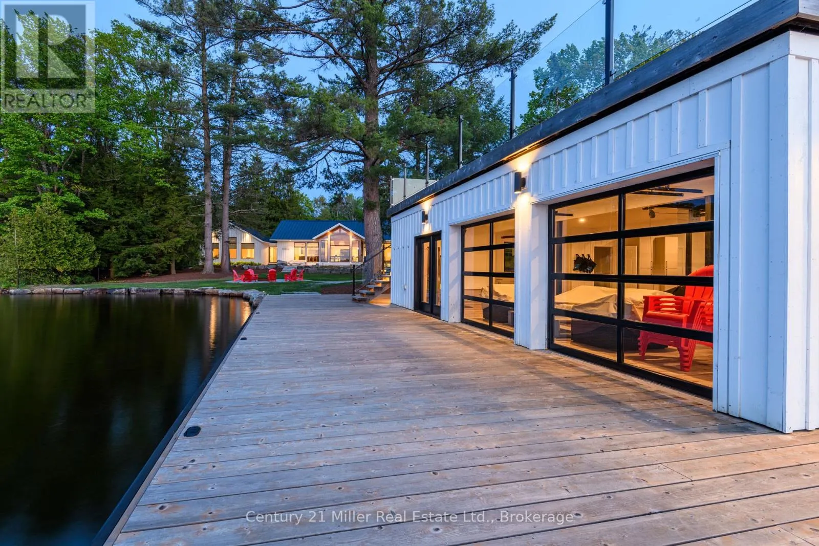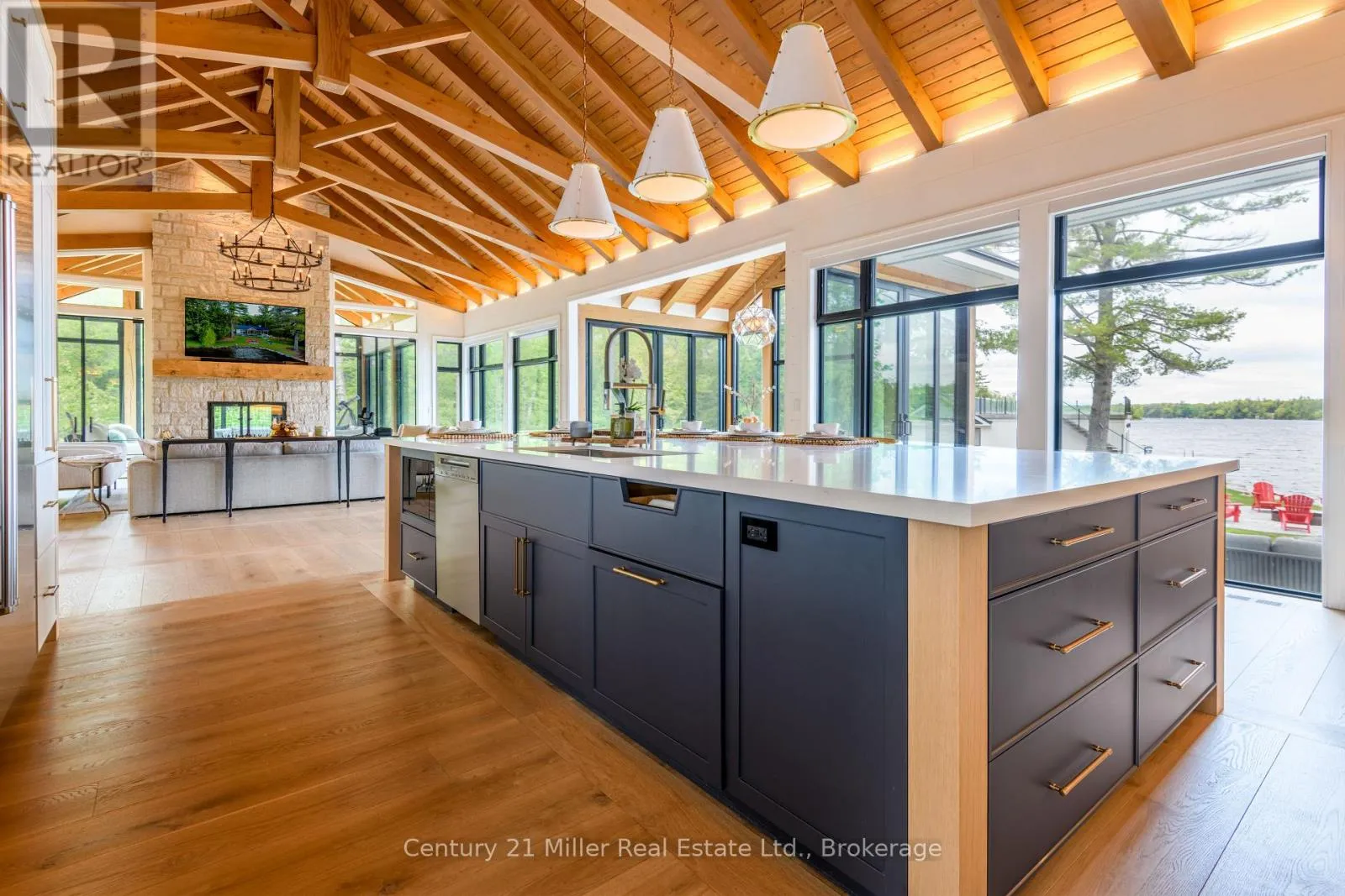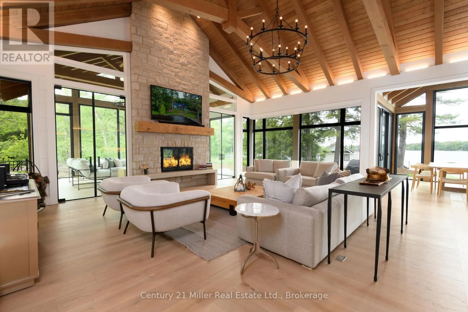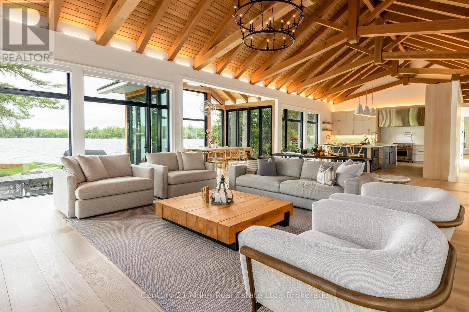 Cross Streets: Hwy 169 / Torrance Road. ** Directions: Hwy 169 to Torrance to Queens Walk to Keeler. This luxuriously appointed custom-built retreat sits on a spectacular level lot with 500+ feet of pristine shoreline, offering exceptional privacy, breathtaking sunset views, and the quintessential Muskoka lifestyle. Built by the renowned Cobalt Custom Homes, the property showcases outstanding craftsmanship and thoughtful design. The main cottage is a masterclass in refined lakeside living, highlighted by soaring vaulted open-beam ceilings, a striking double-sided limestone fireplace, and dramatic floor-to-ceiling windows that fill the interior with natural light while framing panoramic lake views. The gourmet kitchen is a chef's dream, fully equipped with Wolf and Sub-Zero appliances, butler pantry, and flows seamlessly into an expansive dining space anchored by an impressive harvest table-an ideal setting for gathering family and friends and truly the heart of cottage living. The cottage features six spacious bedrooms accommodating 20+ guests, including a private primary wing with a luxurious ensuite, oversized walk-in closet, and sliding doors leading to a tranquil patio. An inviting all-season Muskoka room allows you to enjoy the surrounding landscape comfortably all year. Additional guest accommodations include a two-bedroom bunkie, offering visitors their own relaxing retreat. The three-car garage is topped by a beautifully finished loft complete with a gym and extra sleeping quarters-perfect for overflow guests or a quiet escape after a day on the water. A two-slip boathouse with glass roll-up doors opens onto a generous dock ideal for swimming, sunbathing, and launching lake adventures. The elevated sundeck with glass railings provides sweeping views across the bay, an exceptional place to enjoy Muskoka's famous sunsets with a beverage. A short boat ride to Bala for shopping and dining-or a summer evening at The Kee. A year-round municipal road access, a drilled well, and a sandy lake bottom perfect for kids, creating a truly turn-key four-season sanctuary. (id:27476)