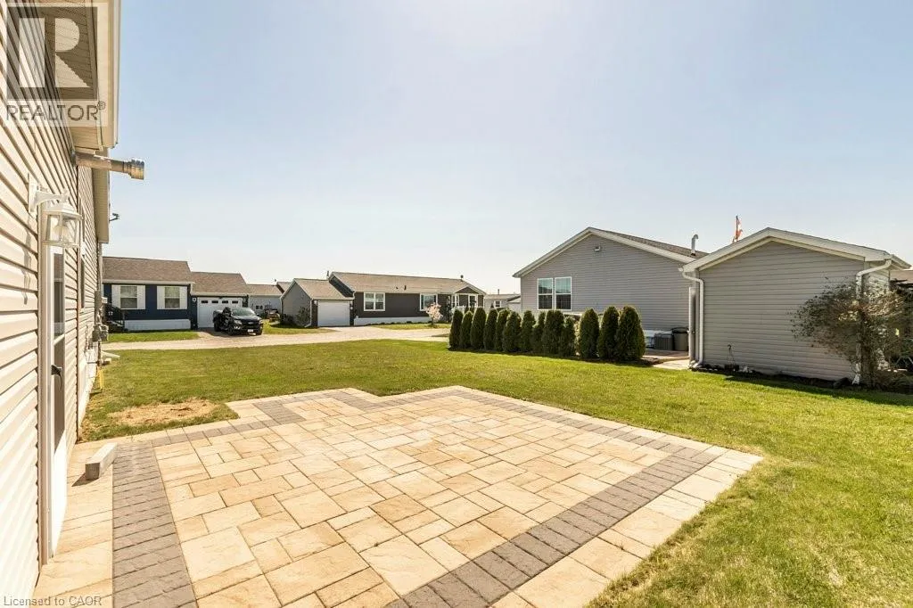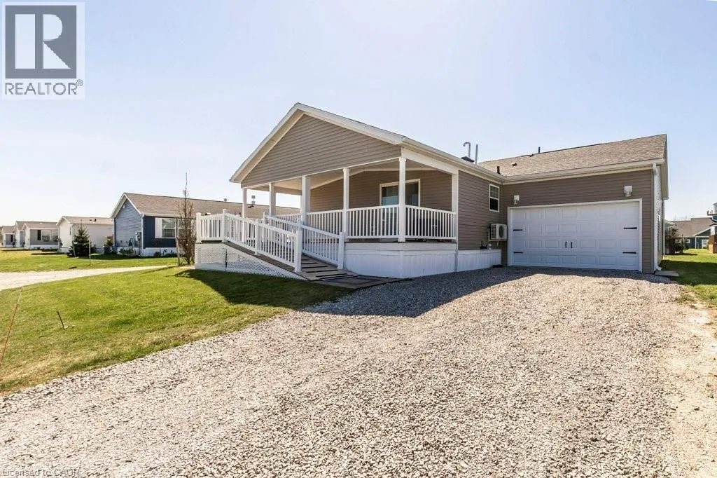 Welcome to this beautifully maintained corner-lot bungalow in a desirable land lease waterfront community, offering affordable living with a true sense of connection. This 1,066 sq. ft. home features 3 bedrooms and 2 bathrooms and is thoughtfully designed to be wheelchair accessible, making it both functional and inclusive. The open-concept layout is bright and welcoming, with a patio door just off the kitchen leading to a covered porch complete with a natural gas BBQ hookup, perfect for easy outdoor entertaining. The home is also equipped with a standby generator, providing peace of mind year-round. A standout feature is the spacious double-car garage, which is insulated and heated, making it ideal for a hobbyist, workshop, or man cave. The garage offers convenient interior access to the home as well as a second door leading directly to the backyard patio. A double-wide driveway provides parking for up to four vehicles. Residents enjoy a welcoming community atmosphere with organized social events, an outdoor pool, an optional dog park, and waterfront access with beautifully maintained common areas, perfect for evening strolls and relaxing by the water. This home is ideal for those seeking low-maintenance, affordable living in a friendly waterfront community. The seller will include 3 months of maintenance fees for the buyer. (id:27476)