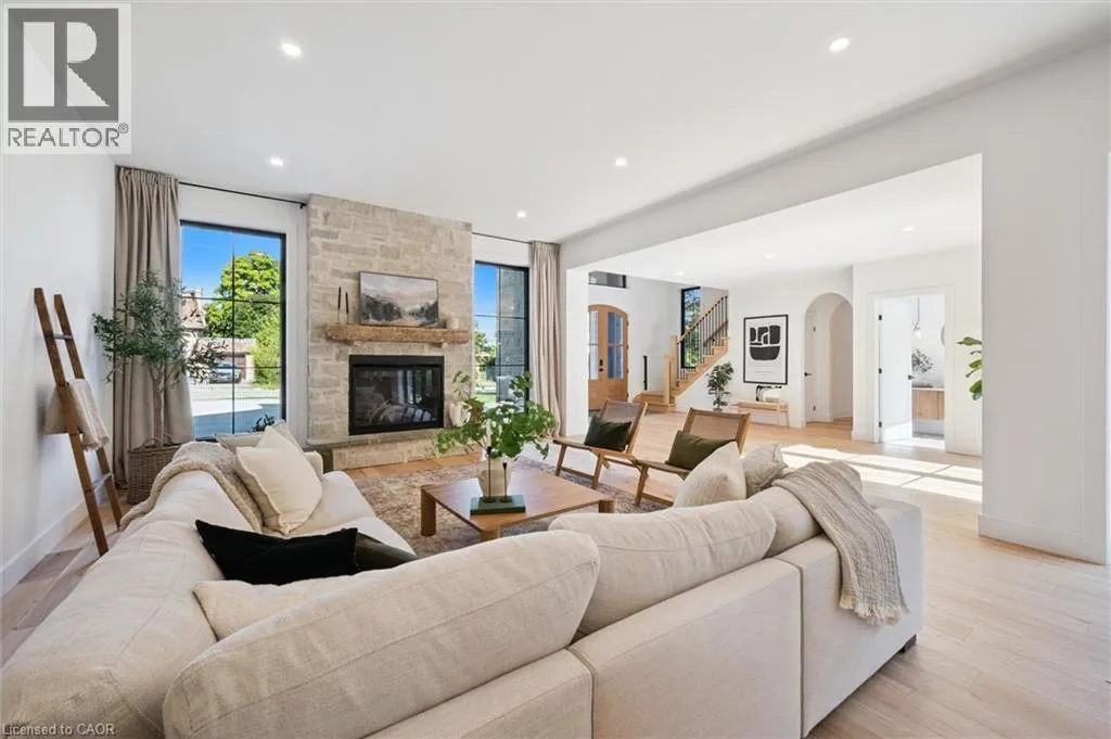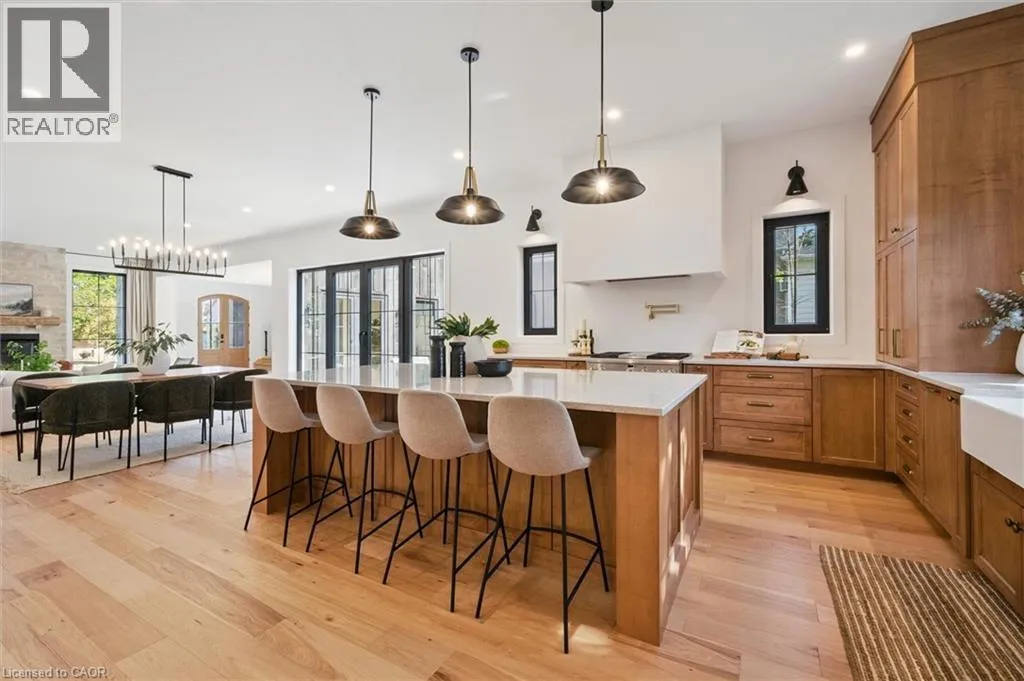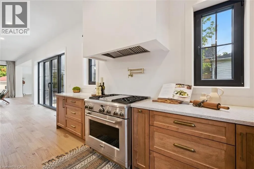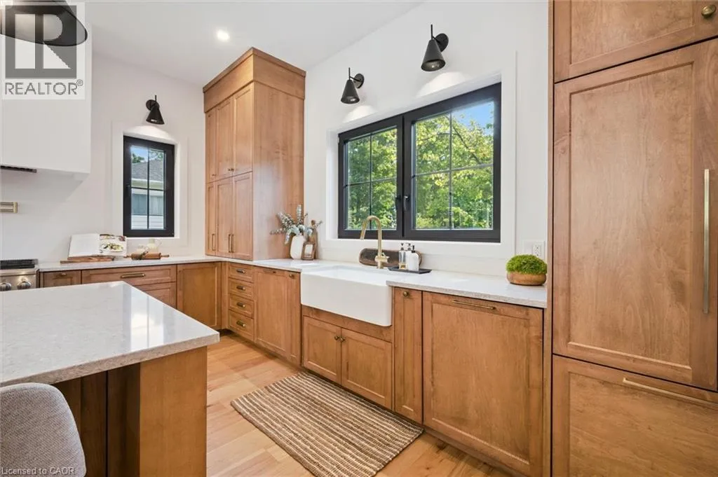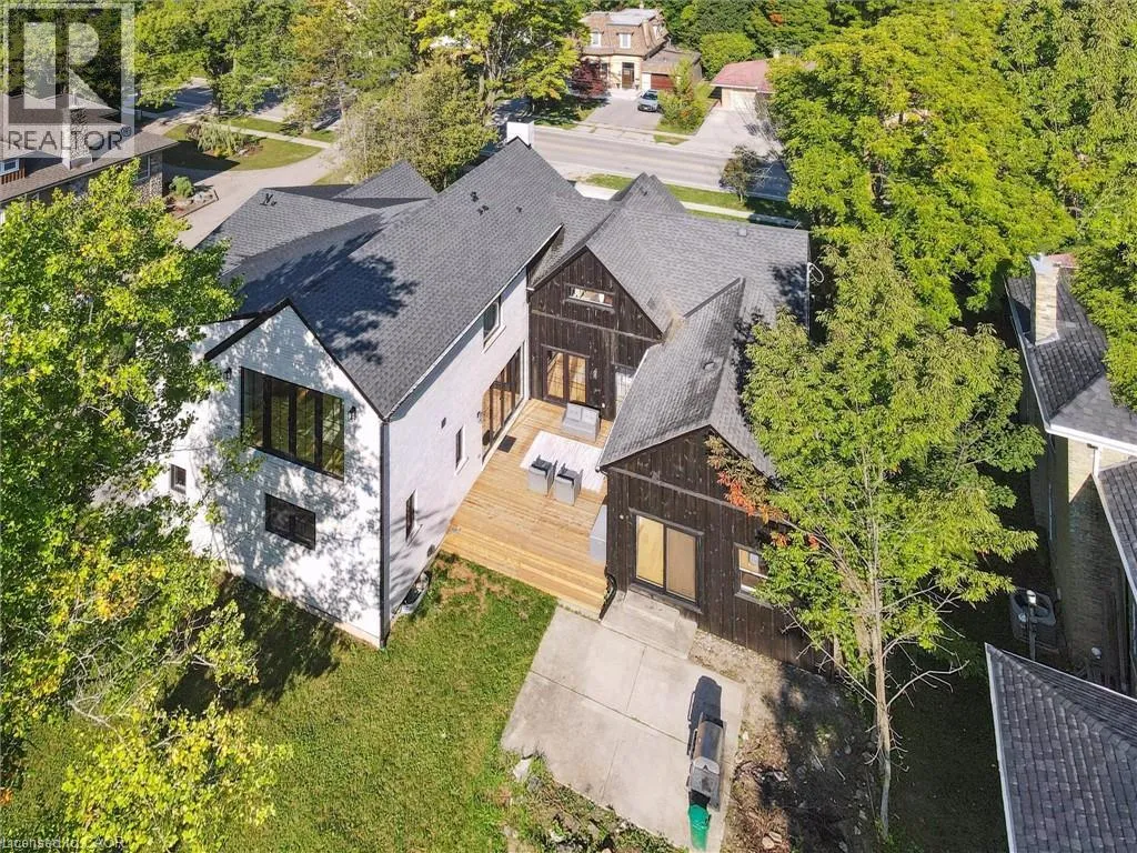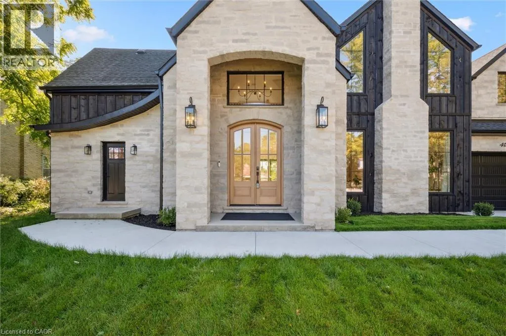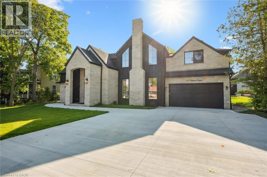 Wilmont left onto Huron Welcome to 413 Huron Road in charming New Hamburg! A truly exceptional 5-bedroom, 4-bathroom home offering over 4,400 sq. ft. of finished living space, where thoughtful design meets high-end finishes and timeless craftsmanship. The exterior blends timeless materials like stone, brick, and barn board for a striking curb appeal, complemented by a concrete driveway with integrated drainage and underground downspout management. Inside, the home is flooded with natural light thanks to oversized Raven European tilt/turn windows, which beautifully highlight the neutral tones, organic finishes, and natural hickory engineered hardwood throughout. The heart of the home is the handcrafted maple kitchen and adjoining butlerâs pantry, featuring a Monogram gas oven/range, built-in 36â Fisher & Paykel fridge and dishwasher, an apron sink, and ample storage, ideal for everyday living and entertaining alike. A separate entrance leads to a private granny flat, perfect for multi-generational living or guests. Comfort is maximized with multi-zone climate control, a hot water recirculation line for instant hot water to the second-floor bathrooms, and a large Lennox natural gas fireplace for cozy evenings. Additional features include a custom vanity in the foyer bath, VIGO faucets, Red Oak stairs, and a master suite boasting oversized windows and Italian tile finishes. The home is equipped with a 200 AMP electrical panel, water softener, and plenty of storage including a large shed. Outside, enjoy an incredible entertaining space with a wood deck and an expansive grass area set on 3/4 acre in town perfect for relaxing or hosting gatherings. This is a rare blend of luxury, functionality, and thoughtful design in a peaceful, sought-after location. (id:27476)