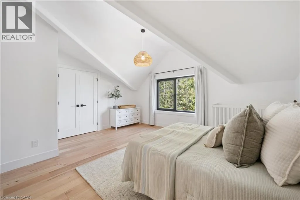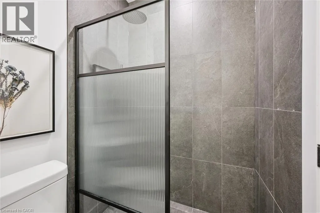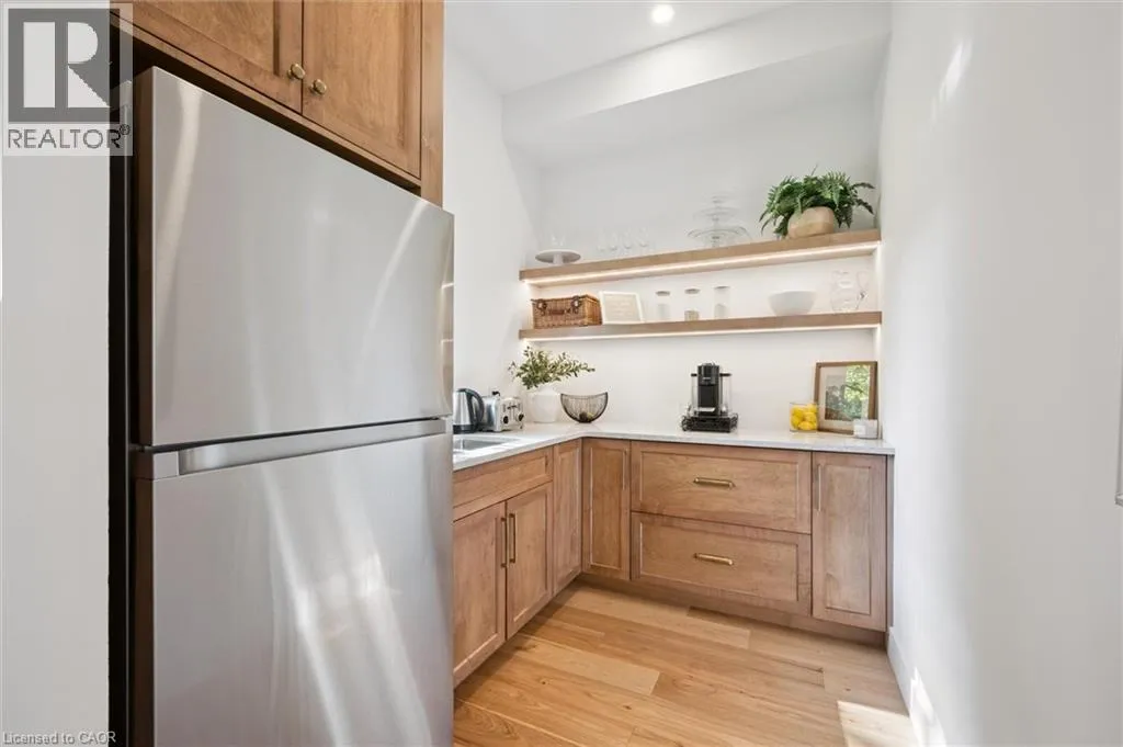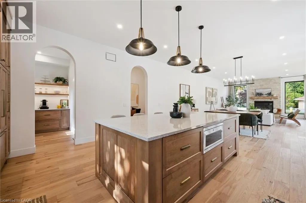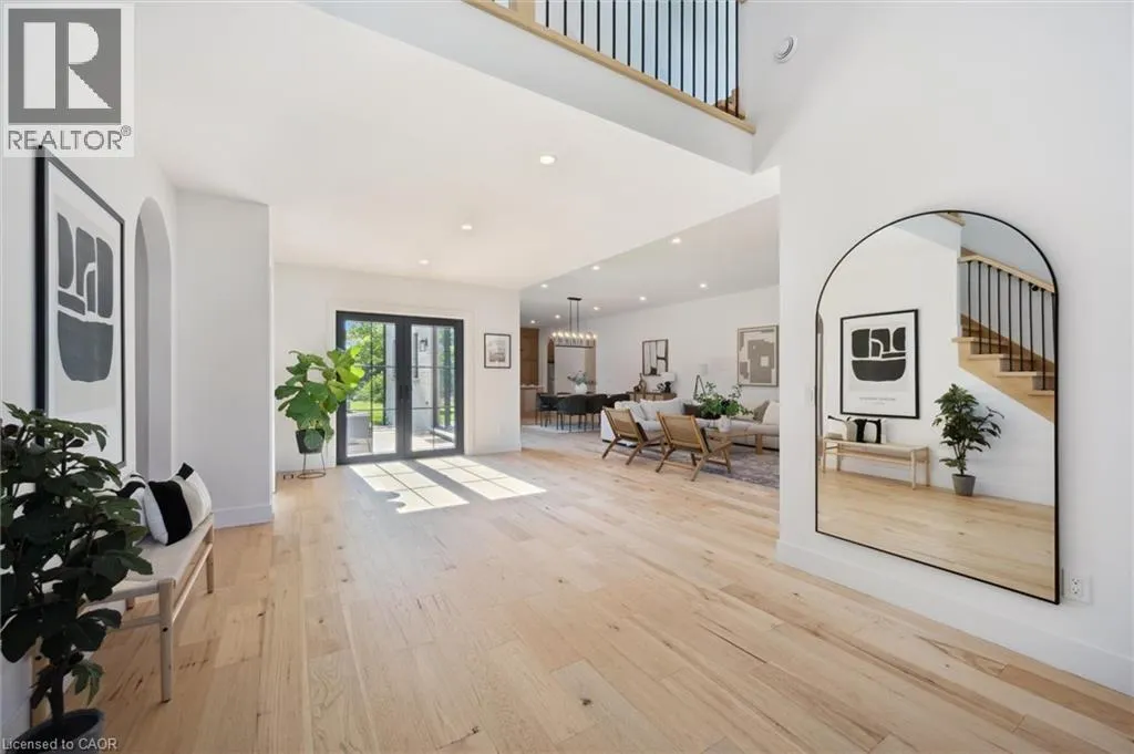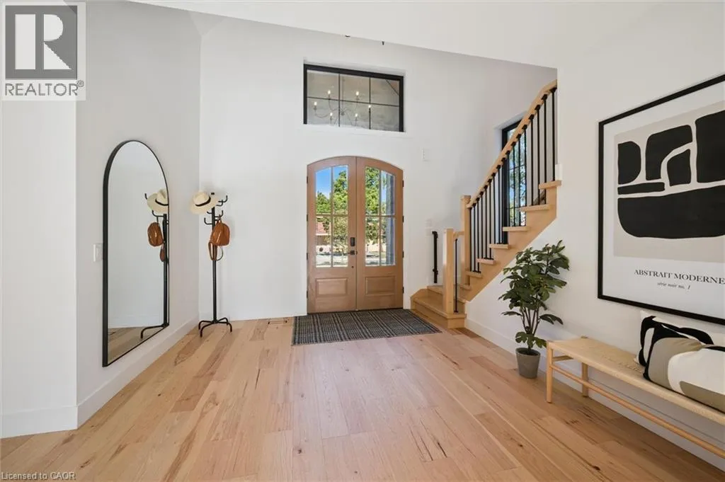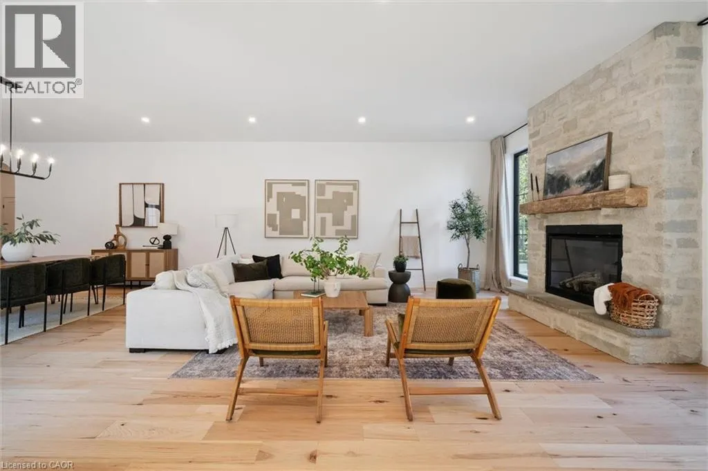 Wilmont left onto Huron Welcome to 413 Huron Road in charming New Hamburg! A truly exceptional 5-bedroom, 4-bathroom home offering over 4,400 sq. ft. of finished living space, where thoughtful design meets high-end finishes and timeless craftsmanship. The exterior blends timeless materials like stone, brick, and barn board for a striking curb appeal, complemented by a concrete driveway with integrated drainage and underground downspout management. Inside, the home is flooded with natural light thanks to oversized Raven European tilt/turn windows, which beautifully highlight the neutral tones, organic finishes, and natural hickory engineered hardwood throughout. The heart of the home is the handcrafted maple kitchen and adjoining butlerâs pantry, featuring a Monogram gas oven/range, built-in 36â Fisher & Paykel fridge and dishwasher, an apron sink, and ample storage, ideal for everyday living and entertaining alike. A separate entrance leads to a private granny flat, perfect for multi-generational living or guests. Comfort is maximized with multi-zone climate control, a hot water recirculation line for instant hot water to the second-floor bathrooms, and a large Lennox natural gas fireplace for cozy evenings. Additional features include a custom vanity in the foyer bath, VIGO faucets, Red Oak stairs, and a master suite boasting oversized windows and Italian tile finishes. The home is equipped with a 200 AMP electrical panel, water softener, and plenty of storage including a large shed. Outside, enjoy an incredible entertaining space with a wood deck and an expansive grass area set on 3/4 acre in town perfect for relaxing or hosting gatherings. This is a rare blend of luxury, functionality, and thoughtful design in a peaceful, sought-after location. (id:27476)