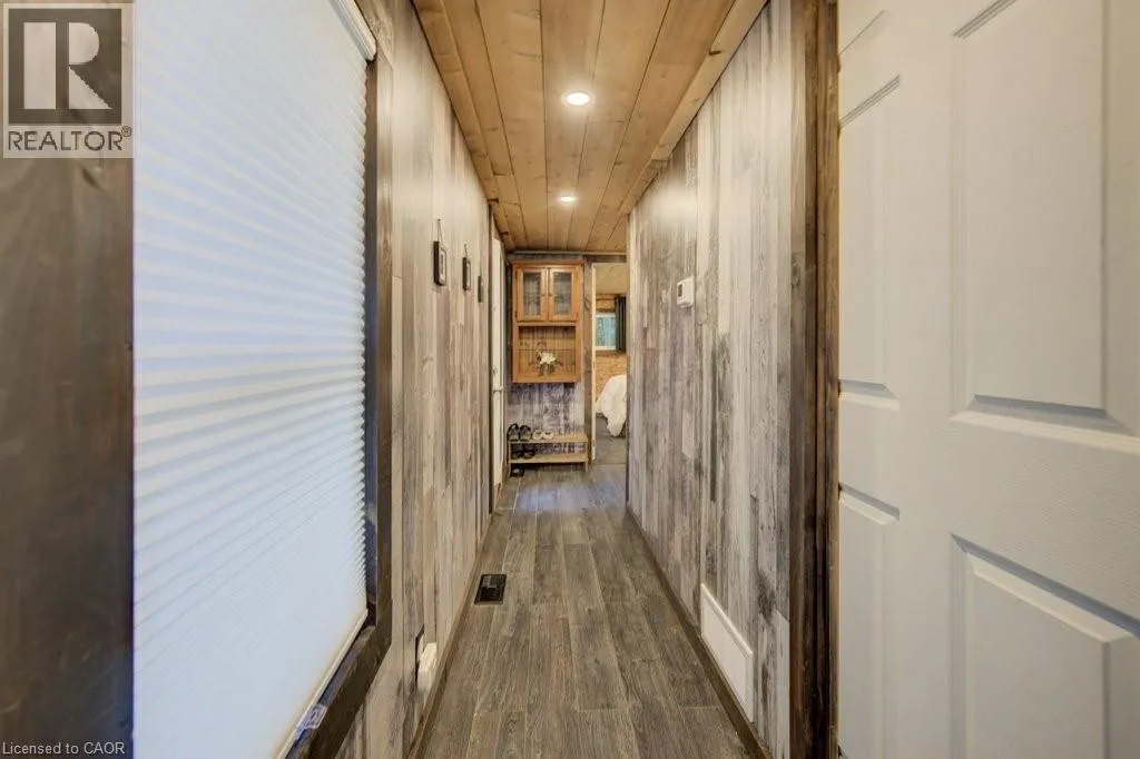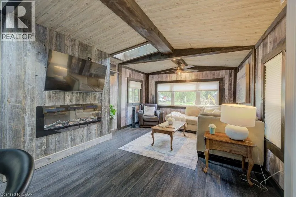 PUDDICOMBE ROAD Ideal for snowbirds or mature adults seeking affordable seasonal living, this 60-foot trailer with a 12â x 12â addition is nestled in the exclusive seasonal section of a quiet, family-friendly parkâjust 10 minutes from New Hamburg and 30 minutes from Kitchener. Enjoy a spacious deck with water views, mature trees, and close proximity to the community centre. Inside, the open-concept layout features a kitchen with island, rustic barn board accents, stylish lighting, and an electric linear fireplace. Oversized skylights, new blinds, and abundant windows fill the space with natural light. The primary bedroom includes a sitting room or den, separated by mirrored French doors and opening directly onto the deck. The bathroom features a tiled shower, and the unit is roughed in for both laundry and a dishwasher. WiFi is available. Set in a park offering a 45-acre spring-fed lake, beach, pool, and hot tub. Seasonal occupancy permitted up to 9 months per year. (id:27476)