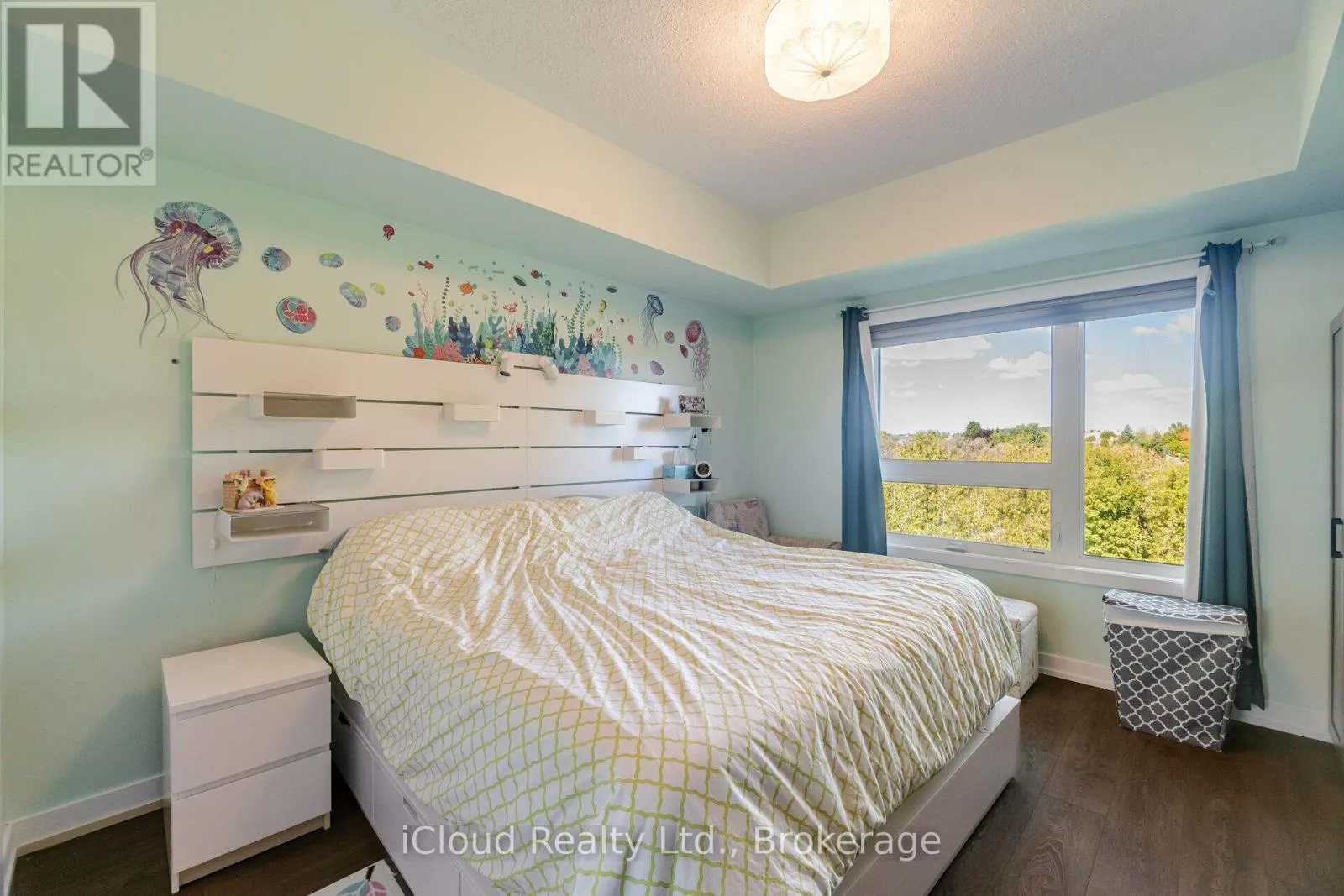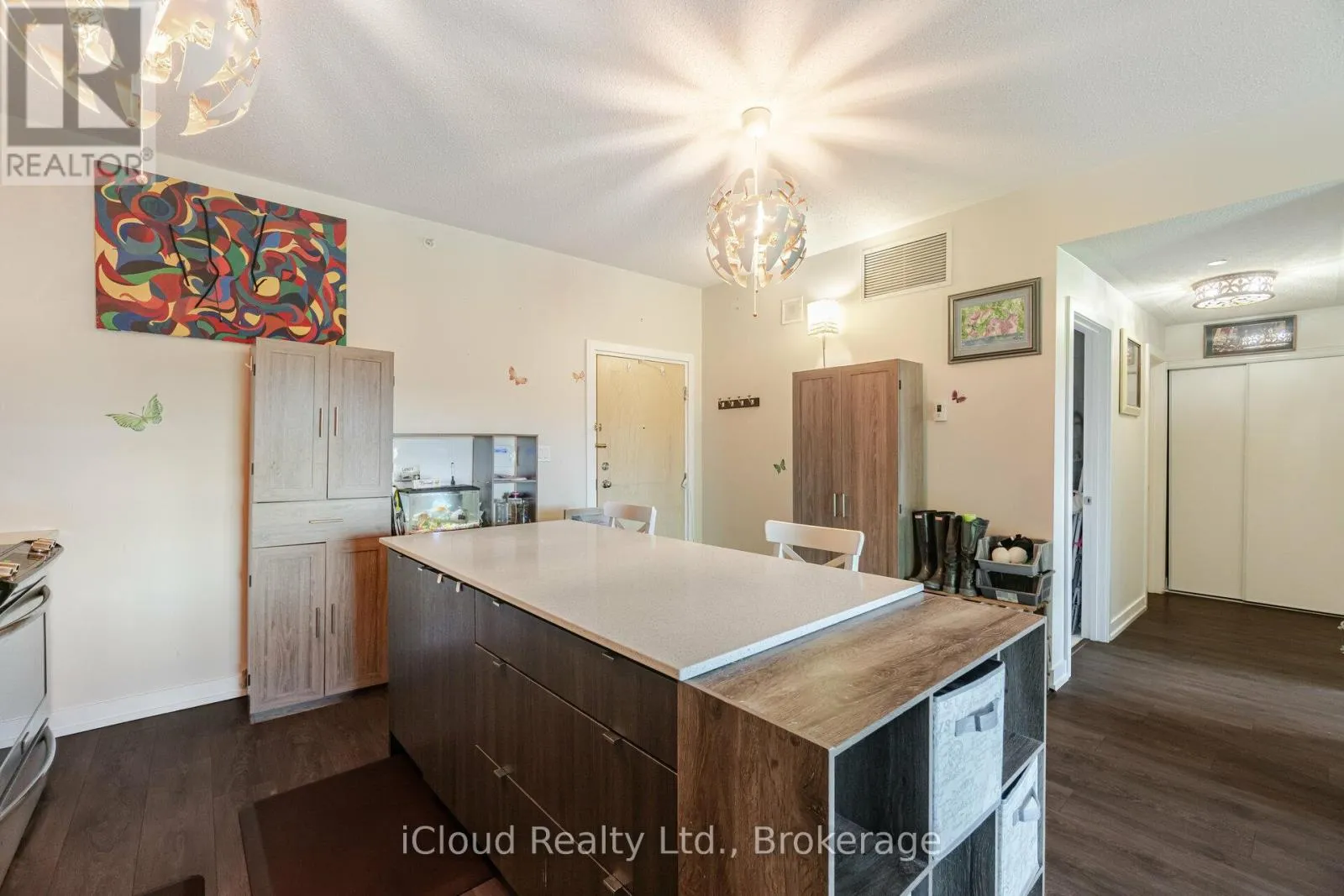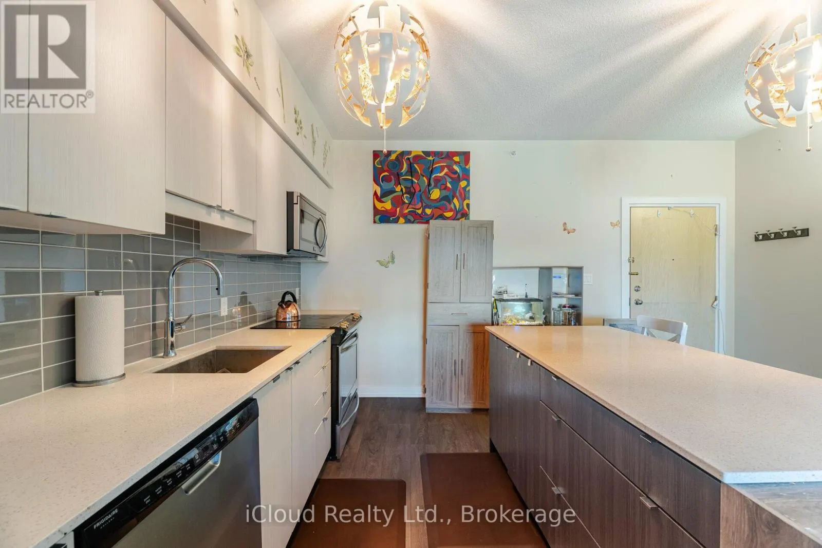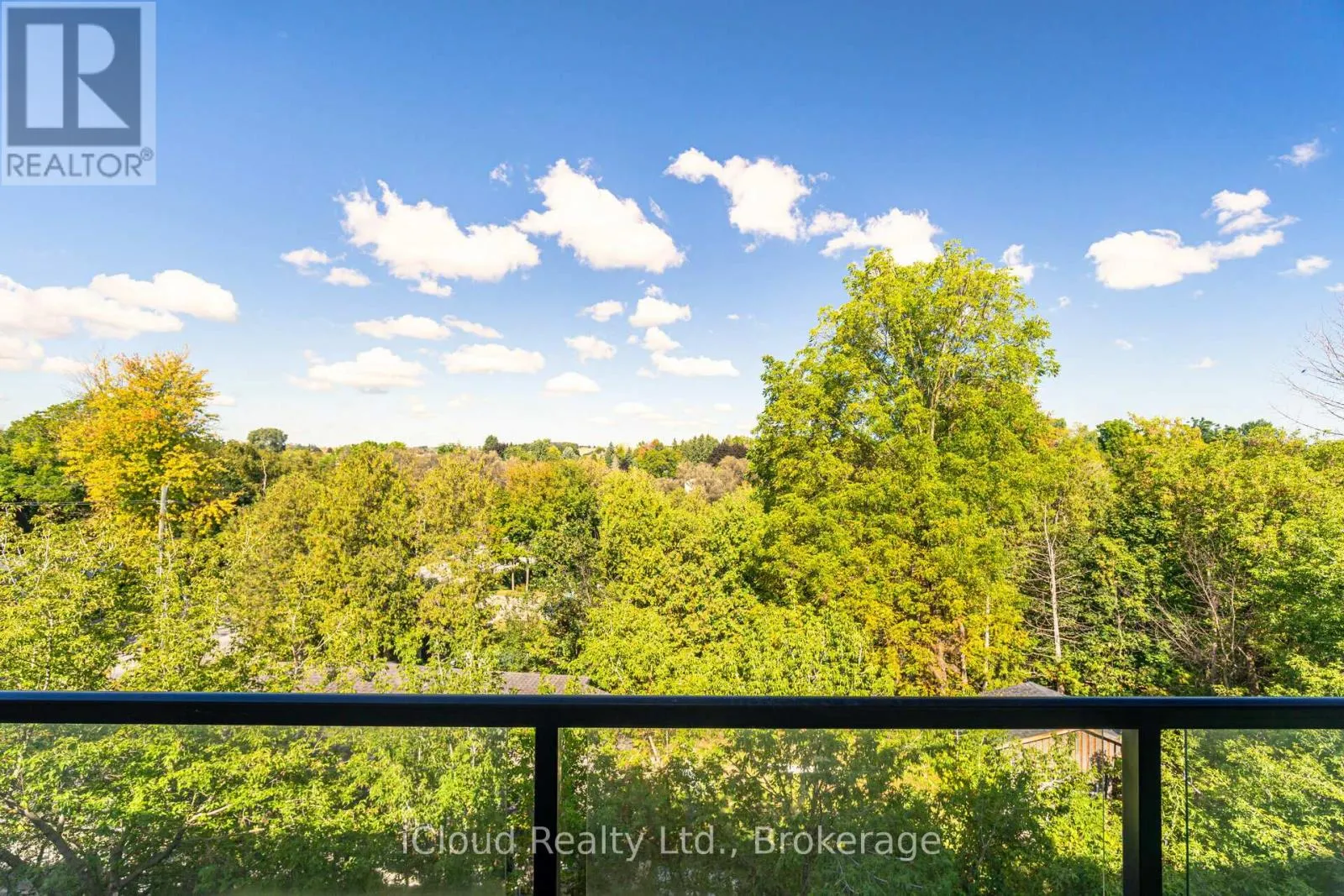 Boyne & Victoria Generously Sized, Over 800 sqft Open Concept 1 Bedroom unit on the TOP Floor. No One Above! From the Living Room, Primary Bedroom and the Covered Balcony, Enjoy the Beautiful Tranquill View of the Trees and Beyond. The kitchen has, plenty of Cupboards, a Backsplash, Quartz Countertops and an Oversized Island with Breakfast Bar. Includes Stainless Steel Kitchen Appliances and White Washer & Dryer! High Ceilings Throughout. Convenient Full In Suite Laundry Facilities. Carpet Free with Laminate Flooring. Air Conditioning. Quite Sought After Building Located so Close to Amenities. Just a Convenient Walk or Short Drive Away. Honda is about a 5 minute drive and approx. a 15 min drive to the 400. A few photos have been virtually staged. (id:27476)