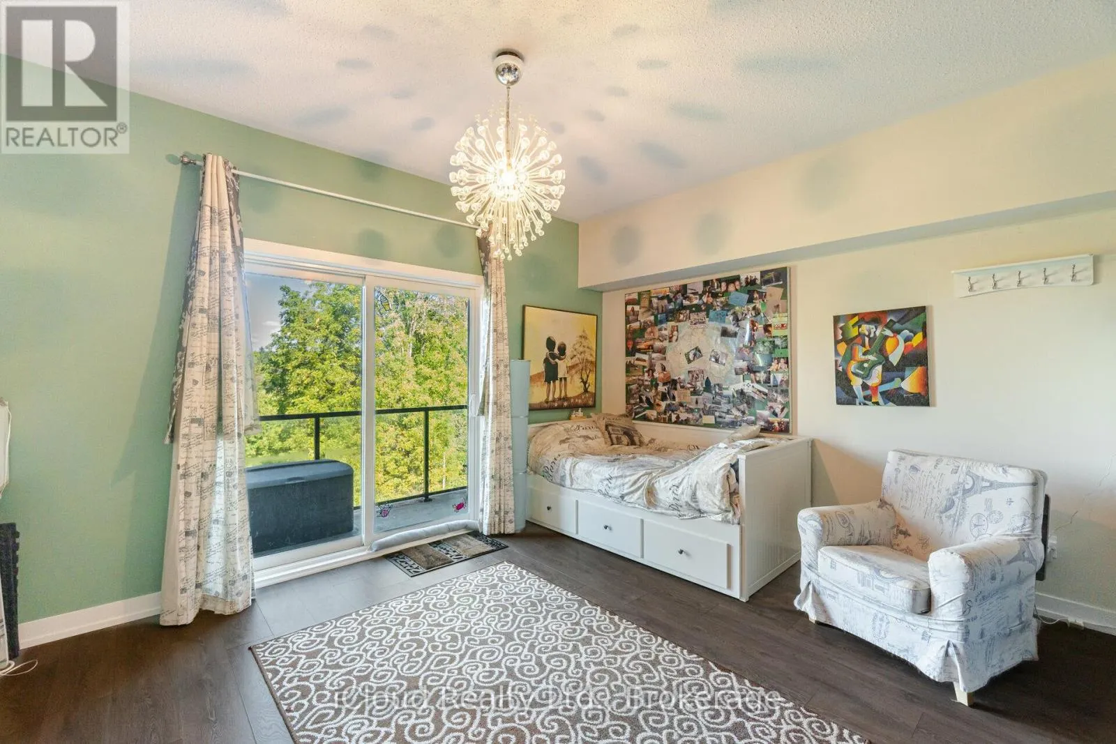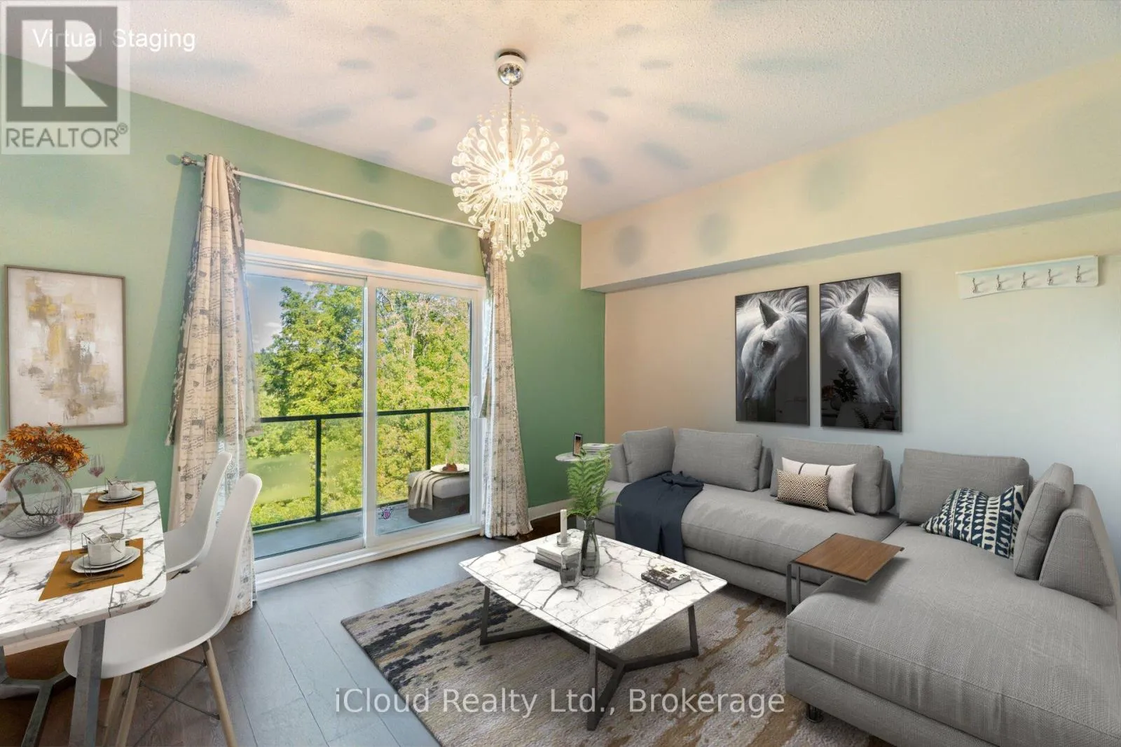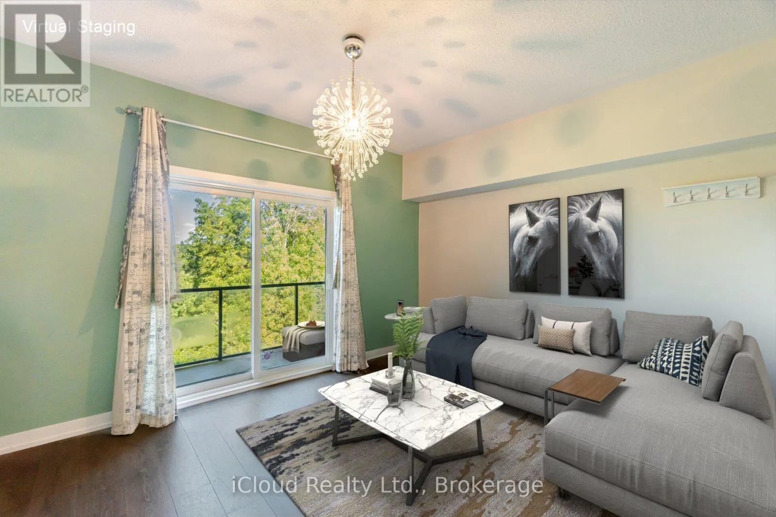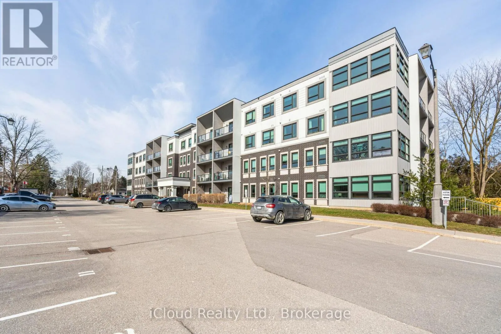 Boyne & Victoria Generously Sized, Over 800 sqft Open Concept 1 Bedroom unit on the TOP Floor. No One Above! From the Living Room, Primary Bedroom and the Covered Balcony, Enjoy the Beautiful Tranquill View of the Trees and Beyond. The kitchen has, plenty of Cupboards, a Backsplash, Quartz Countertops and an Oversized Island with Breakfast Bar. Includes Stainless Steel Kitchen Appliances and White Washer & Dryer! High Ceilings Throughout. Convenient Full In Suite Laundry Facilities. Carpet Free with Laminate Flooring. Air Conditioning. Quite Sought After Building Located so Close to Amenities. Just a Convenient Walk or Short Drive Away. Honda is about a 5 minute drive and approx. a 15 min drive to the 400. A few photos have been virtually staged. (id:27476)