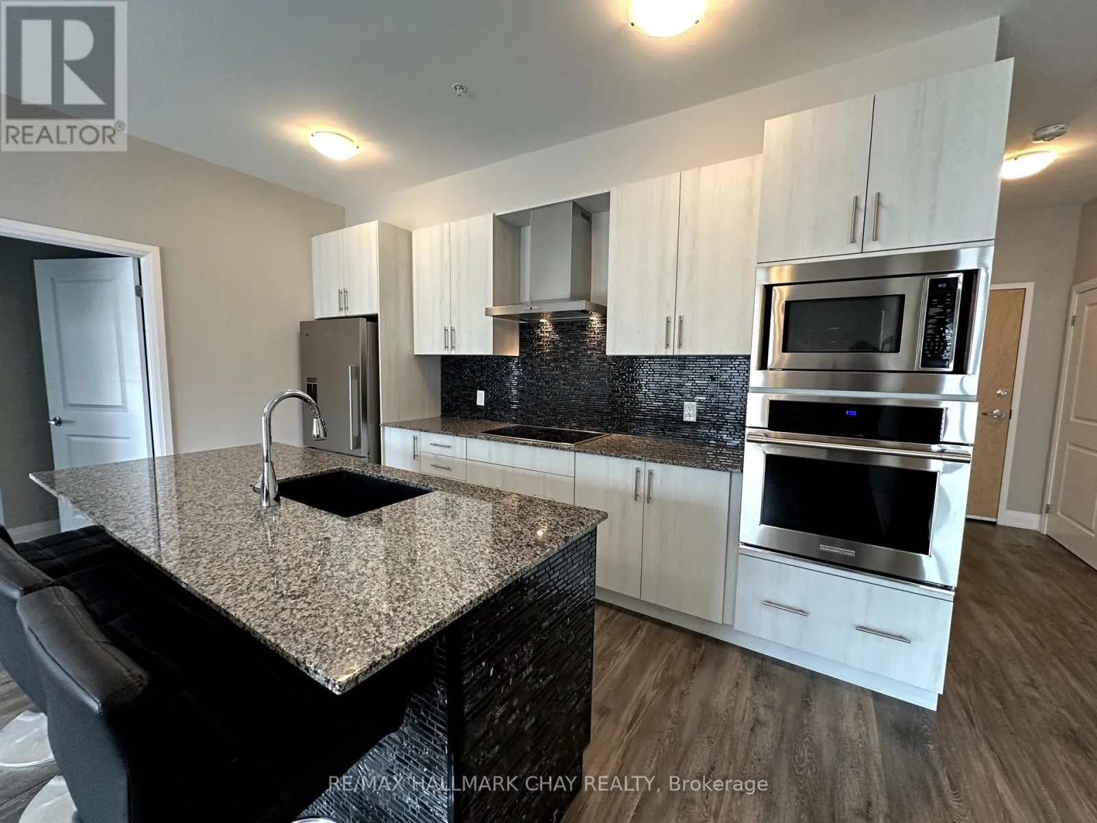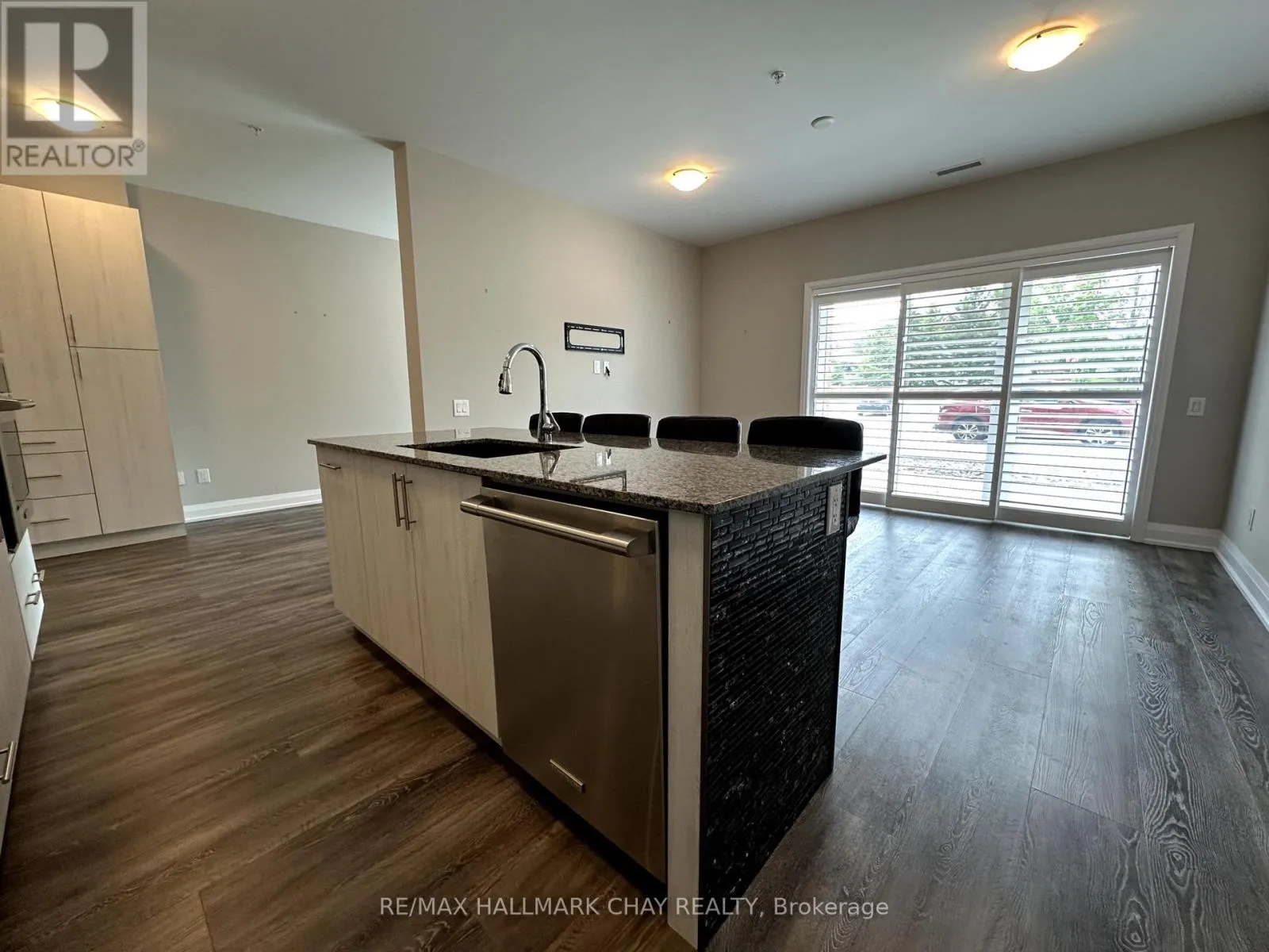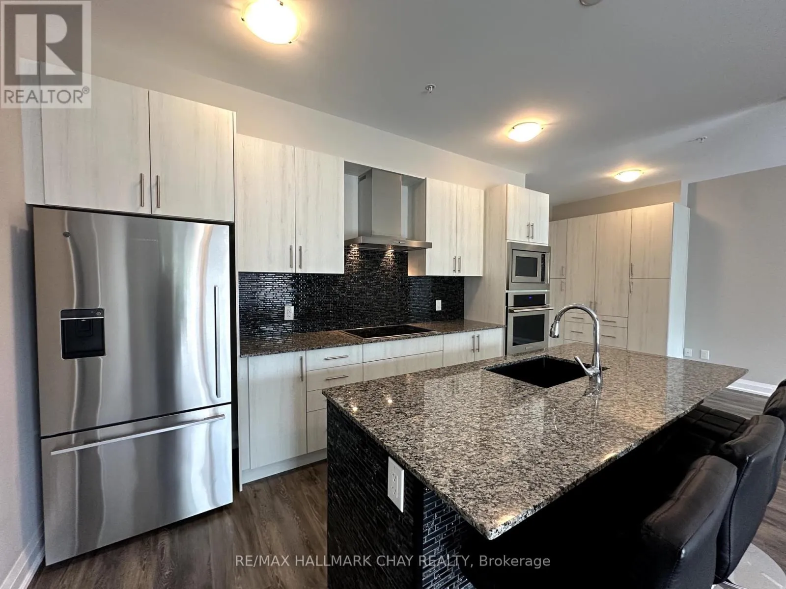 Cross Streets: Queen St S & Dillane St W. ** Directions: Queen St S. Step into the perfect blend of convenience and comfort with this impressive first floor one bedroom plus den condo. Enjoy the ease of bringing in groceries or taking pets for a walk with no need for elevator use. The large 12X27 ft terrace offers direct access to outdoor spaces unique to ground floor living. Vista Blue Condo Building built in 2020 is perfectly situated steps away from shopping, dining and everyday conveniences. Admire the beauty of the Trans Canada Trail and the Conservation area just outside your door. Designed to impress, the kitchen features tasteful upgrades and is equipped with professional grade appliances (barely used), granite counter tops and an upgraded centre island. The primary bedroom includes a 4 pc ensuite bath with double sinks and an oversized walk in shower. This south facing suite is also enhanced by an open concept design, 9 foot ceilings, a 2 pc guest washroom, in suite laundry and California Shutters. The underground parking brings an extra level of comfort while keeping your car protected from the elements. This unit and the entire building exemplify clean, well kept spaces. Host gatherings in the spacious party/games room, featuring a well appointed kitchen and views of the conservation area. The building also offers guest parking and front entry handicapped accessible spaces for added convenience. (id:27476)