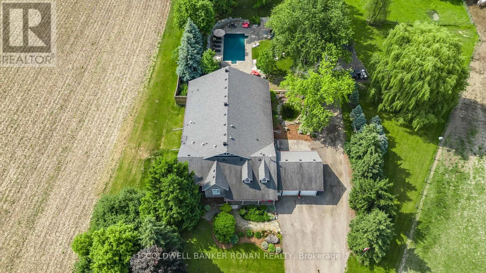 Tottenham Rd & 3rd Line This stunning 6-bedroom, 6-bathroom bungalow on 10 acres just north of King offers luxurious living with the convenience of nearby amenities. The property is a rare find, featuring a barn with paddocks for animals, a spacious 35x60 ft shop, a 40x60 ft coverall, and an expansive gravel yard space. Inside, the beautifully designed home boasts a grand open-concept kitchen and family room, perfect for entertaining. Four of the five main-floor bedrooms include private en suites, while the primary suite offers a large ensuite, walk-in closet, and in-room laundry. The partially finished basement features heated floors, a bedroom and bathroom, a large gym area, and a reinforced concrete/rebar room designed for secure storage. Step outside to a fully landscaped backyard oasis, complete with an inground pool and hot tub, creating the perfect retreat. Extras: Hot Water Tank (Owned), Septic Tank Pumped (October 2024), In-Floor Heating In Basement. (id:27476)