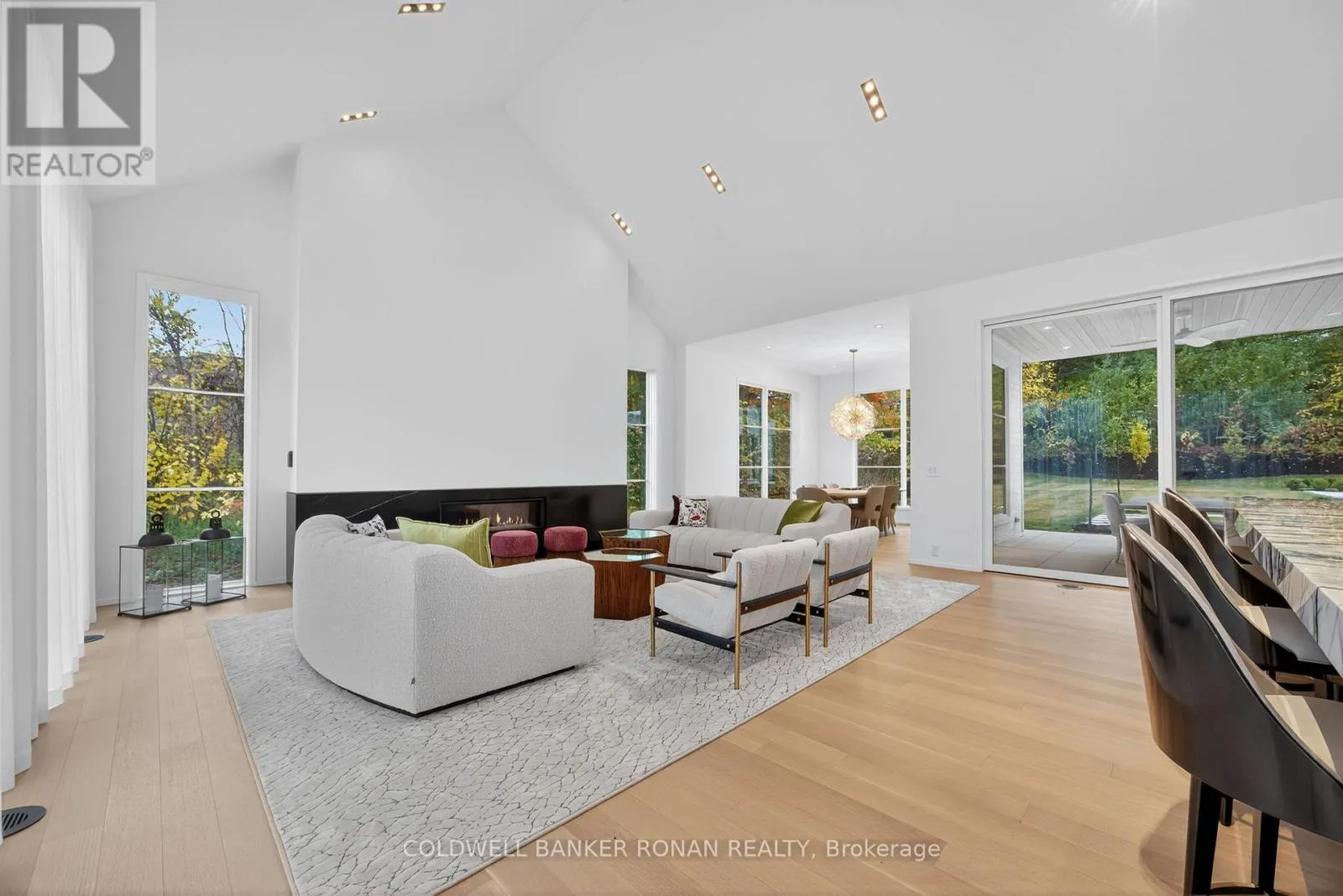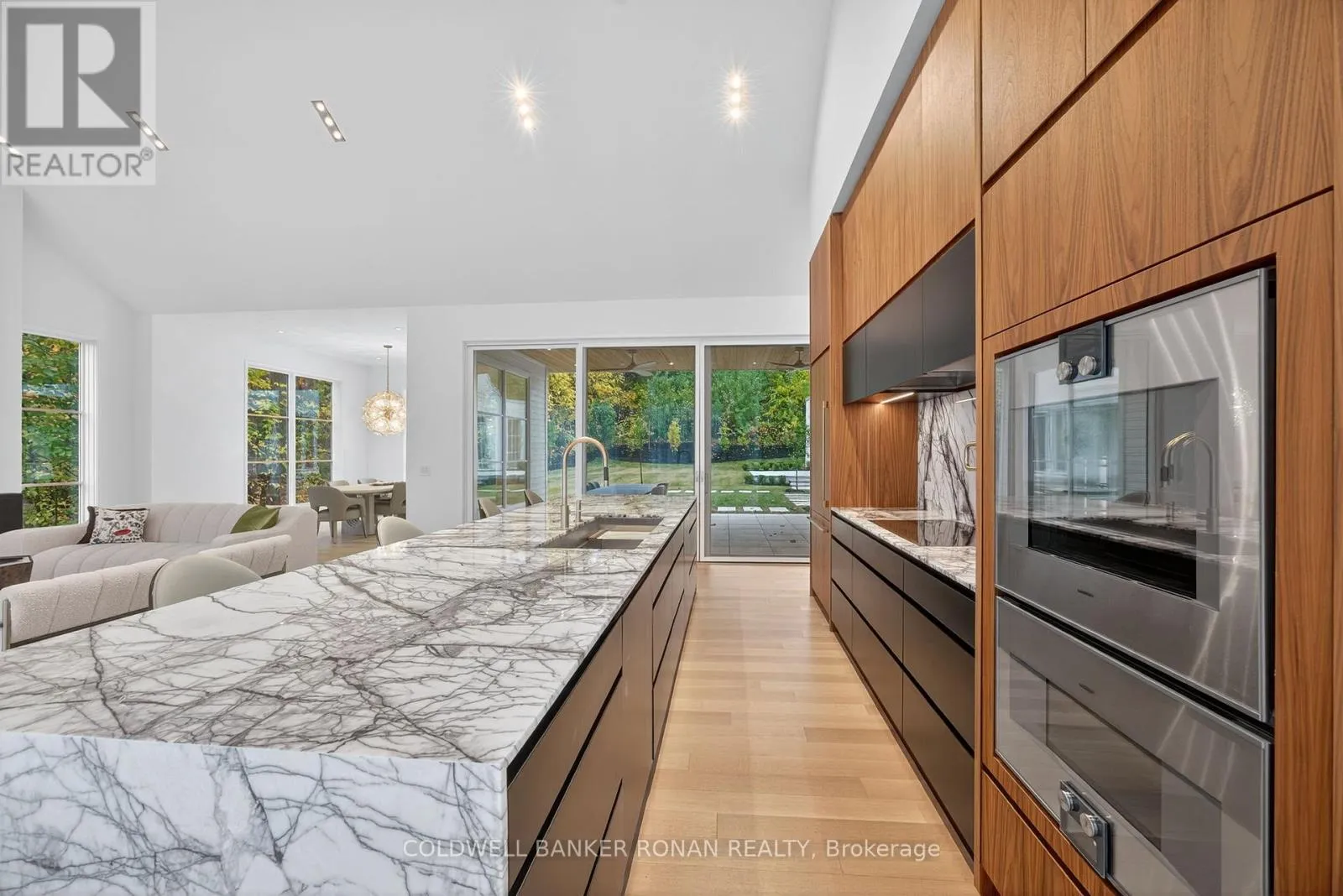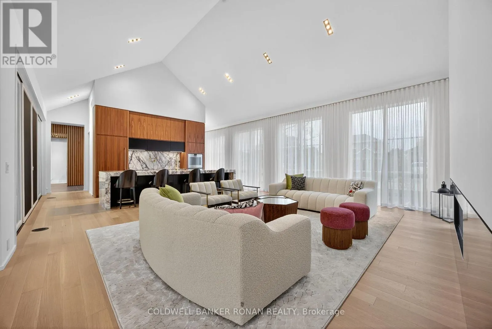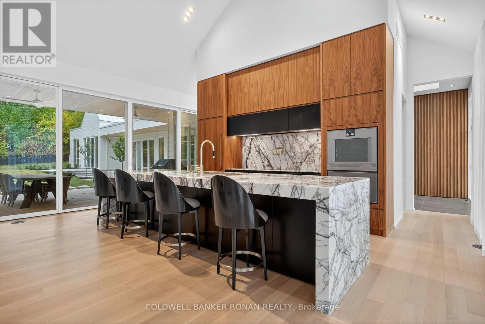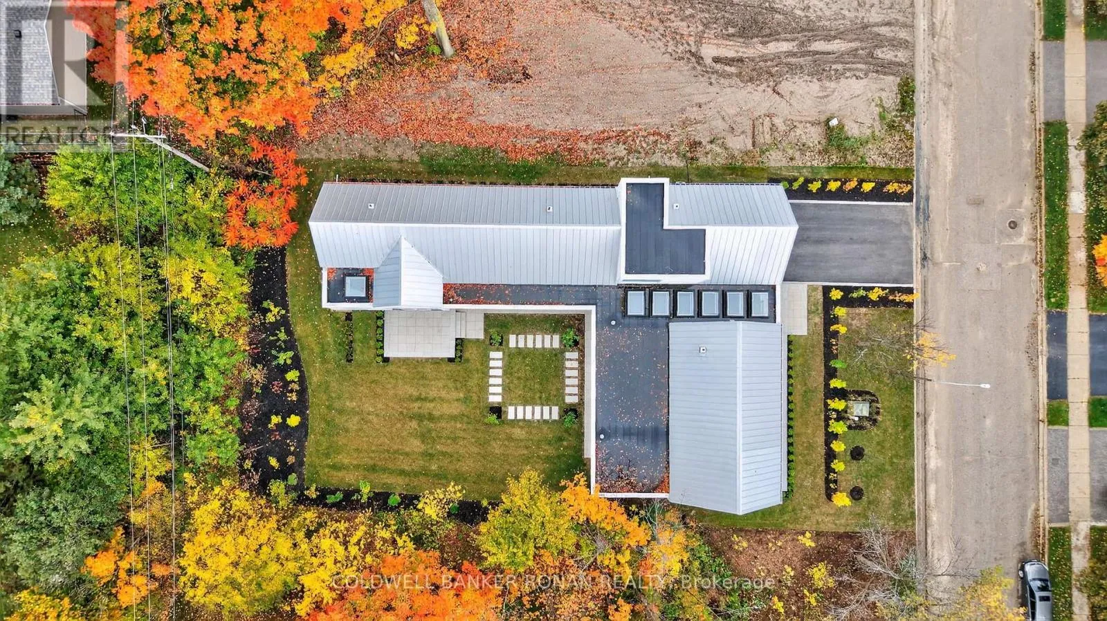 Banting Dr - Gray Ave Modern luxury living in this breathtaking Forest View Home, crafted by Georgio Lolos Designs w/ interiors curated by ABella Design Inc. This stunning property is built with an eye for elegance & functionality. Step into the home through a custom wood slatted wall foyer. Six skylights flood the space with natural light. Open riser, Hollywood stairs w/ sleek glass railings lead to a private bedroom retreat over the garage. Specialty lighting highlights the grandeur of the 18-foot A-frame vaulted ceiling in the main living area, creating an inviting ambiance around the 50" gas fireplace clad in black soapstone. The home showcases 6' White Oak flooring throughout for a seamless & warm finish. The powder room impresses w/ a Starck wall-hung toilet, integrated marble sink & an exquisite book-matched Bianco Lasa marble wall. The heart of the home features a dream kitchen, equipped w/ walnut cabinetry, an impressive 14-foot waterfall island & a handcrafted 50' Julien sink. Grey Lilac marble adorns the kitchen & pantry, complemented by full-slab backsplashes. Cooking is elevated w/ a 36' Gaggenau induction cooktop, 30' Gaggenau wall oven, fully integrated 36' Thermidor fridge & Bosch dishwasher. The custom range hood & gold fixtures adds an elegant touch while a wine fridge in the pantry & a wall mounted pot filler over the stove round out the space's luxury. The TV lounge features a built-in Gaggenau coffee maker & beverage fridge, elegantly integrated into custom cabinetry & a sophisticated walnut accent wall. Each bedroom offers an ensuite bathroom & custom closets. Primary ensuite is a private oasis w/ custom wall hung vanity, a luxurious Knief, K-Stone tub, a wall-mounted AeT DOT 20 Italia toilet, an oversized shower towel warmer. Laundry room is carefully designed, with beautiful cabinetry, clothes drying area & a custom dog wash station. A must see property for those seeking a refined yet comfortable living experience. (id:27476)