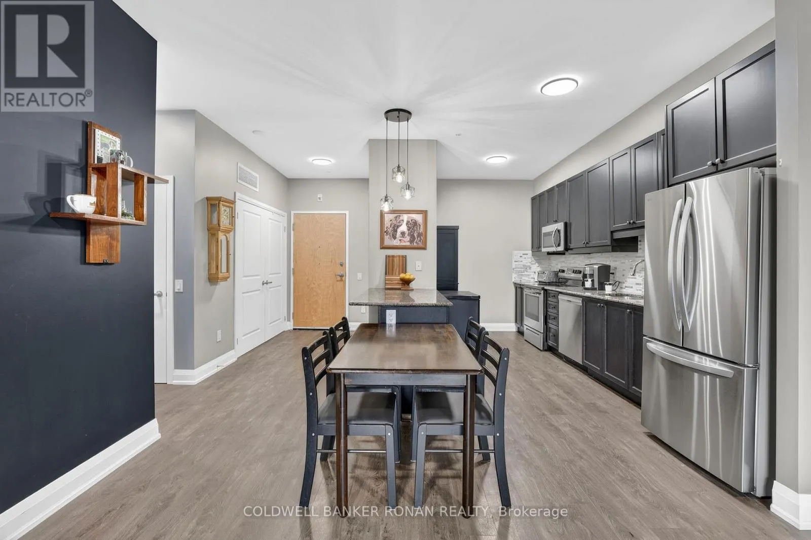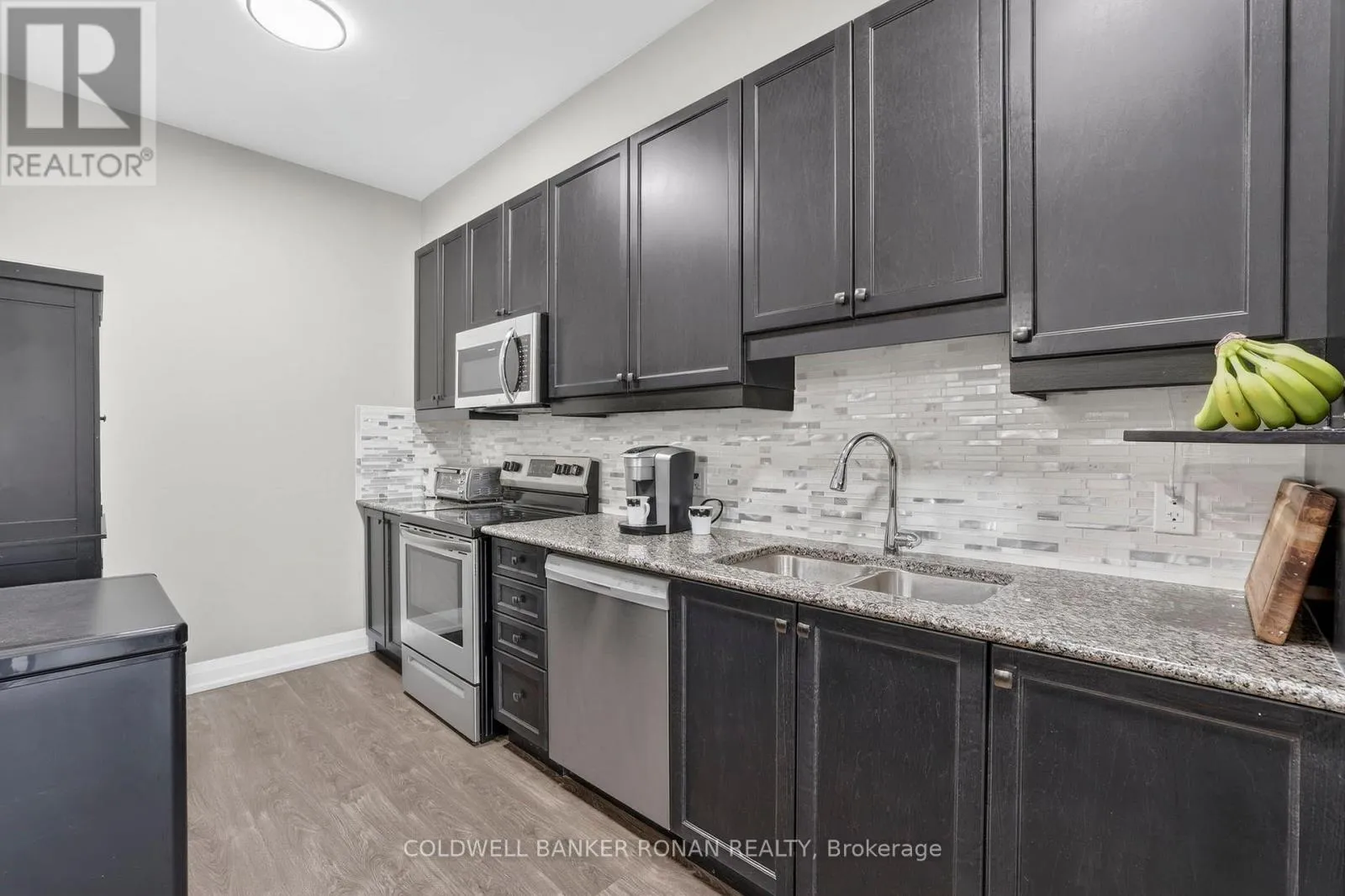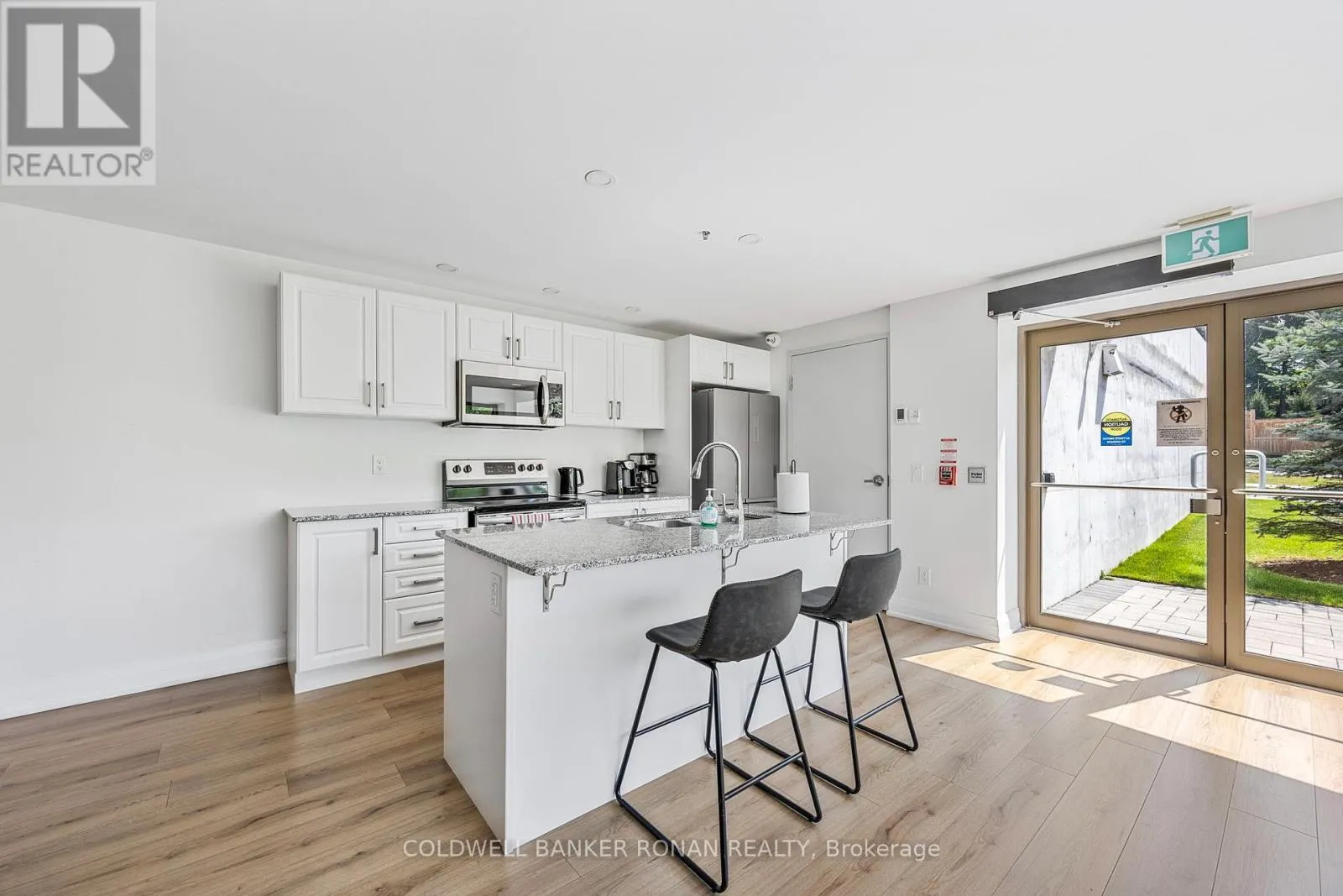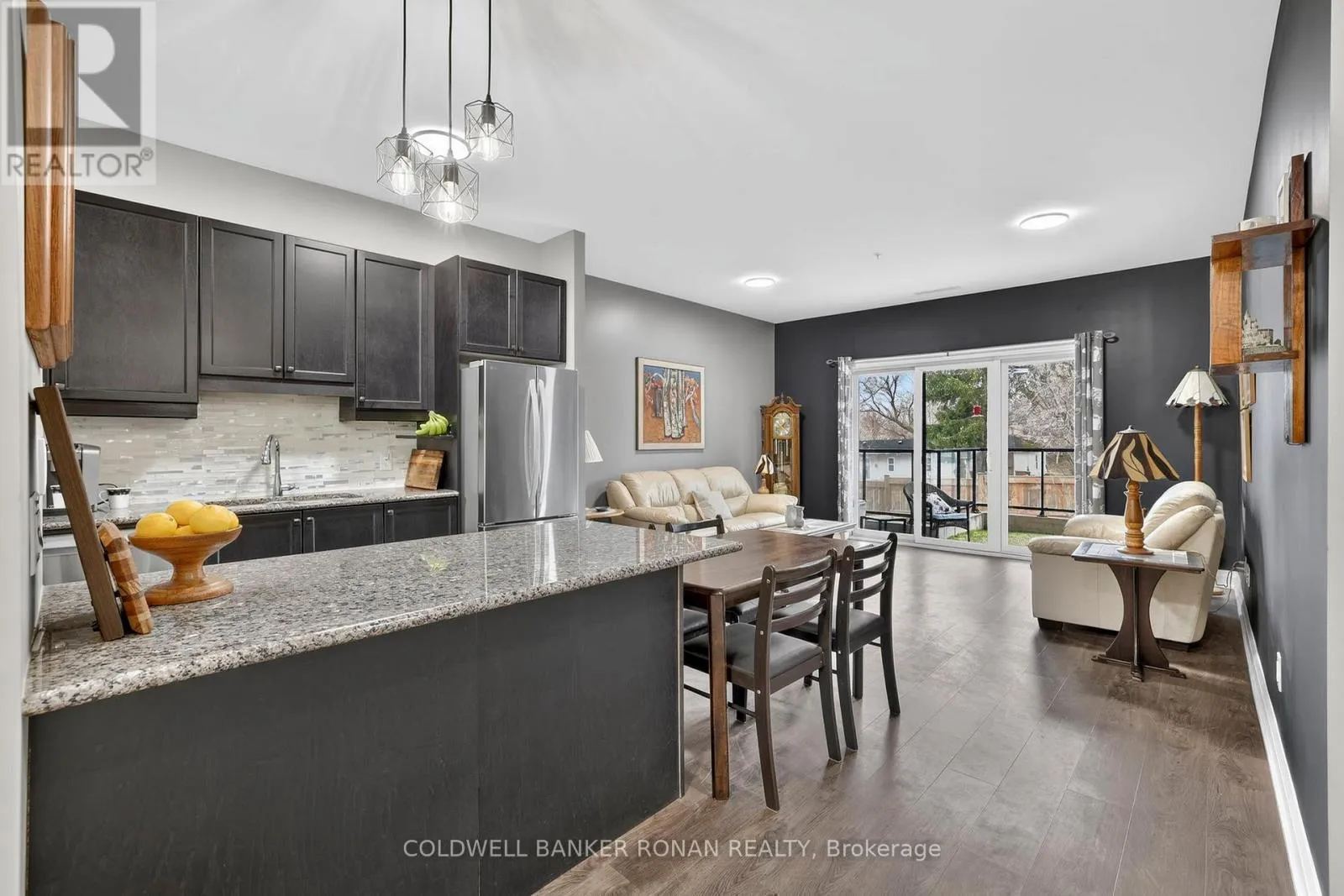 Queen St S & Dillane St W Welcome to easy, low-maintenance living in this beautiful ground-floor, 2-bedroom condo, offering the perfect blend of comfort and convenience. Enjoy direct walkout access to your private terrace, ideal for morning coffee, or quick access for pets and everyday living-no elevators required. Located in the sought-after Vista Blue building, this suite is steps from shopping, dining, and essential amenities. It is also surrounded by nature with the Trans Canada Trail and a nearby conservation area right at your doorstep. Inside, the thoughtfully designed open-concept layout is enhanced by 9-foot ceilings. The upgraded kitchen is both stylish and functional. The primary bedroom offers a walk-in closet and a 4-piece ensuite with double sinks and an oversized glass shower. A second bedroom provides flexibility for guests, a home office, or additional living space. Additional features include in-suite laundry, a convenient powder room, and underground parking for year-round comfort and security. Residents enjoy access to a well-maintained building featuring a welcoming party/games room with kitchen facilities and scenic views, ample visitor parking and accessible entry options. Move-in ready unit in a prime location. (id:27476)