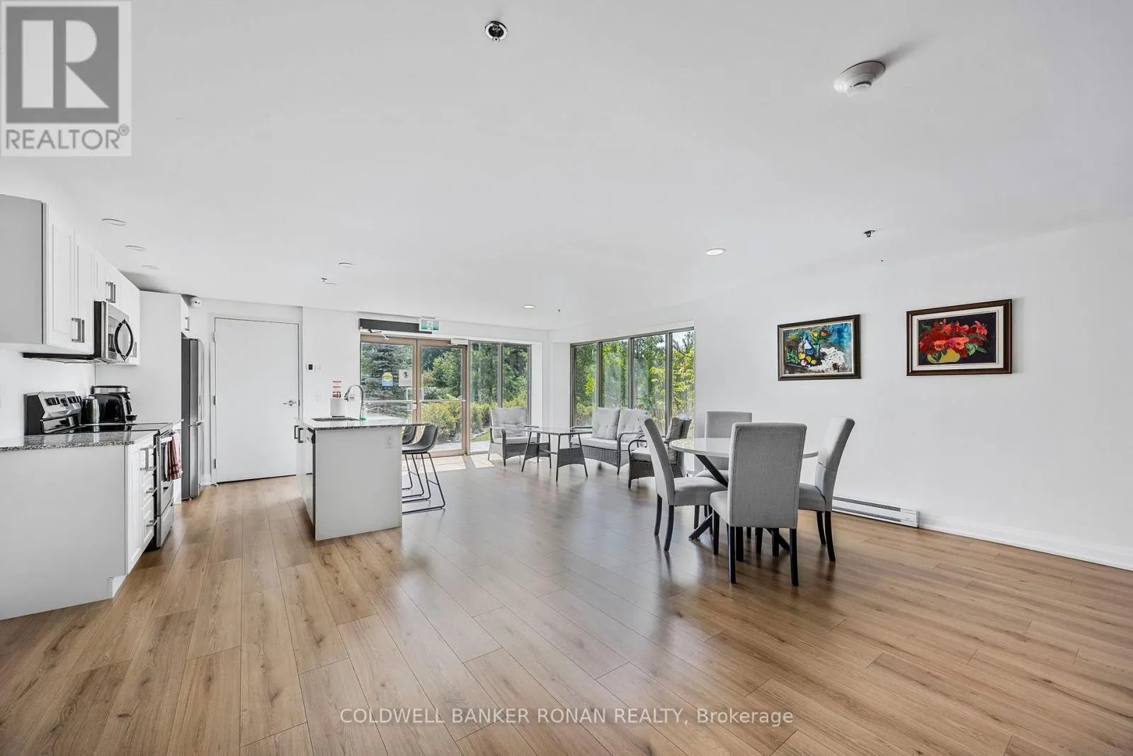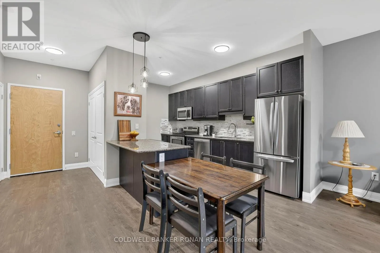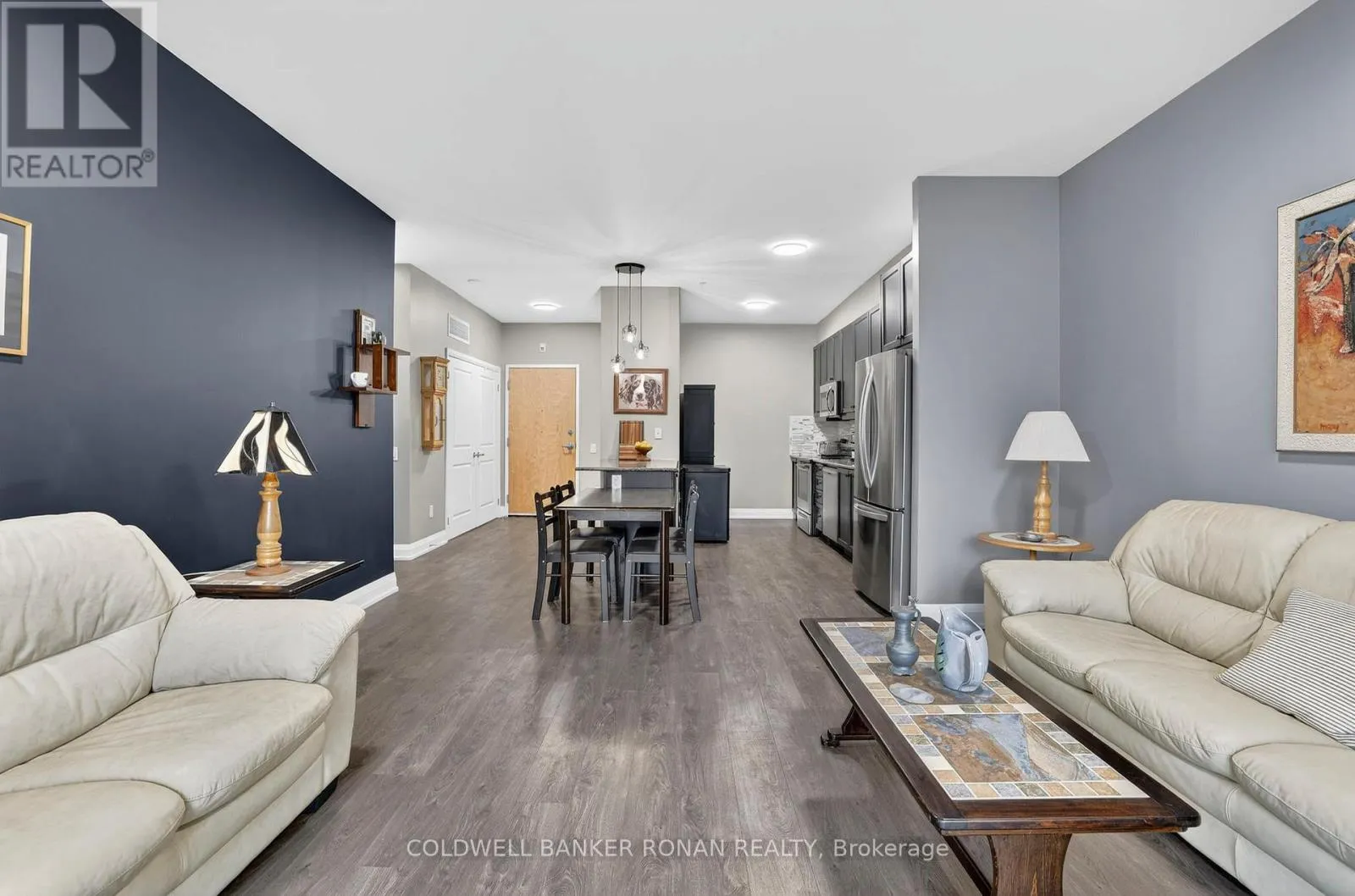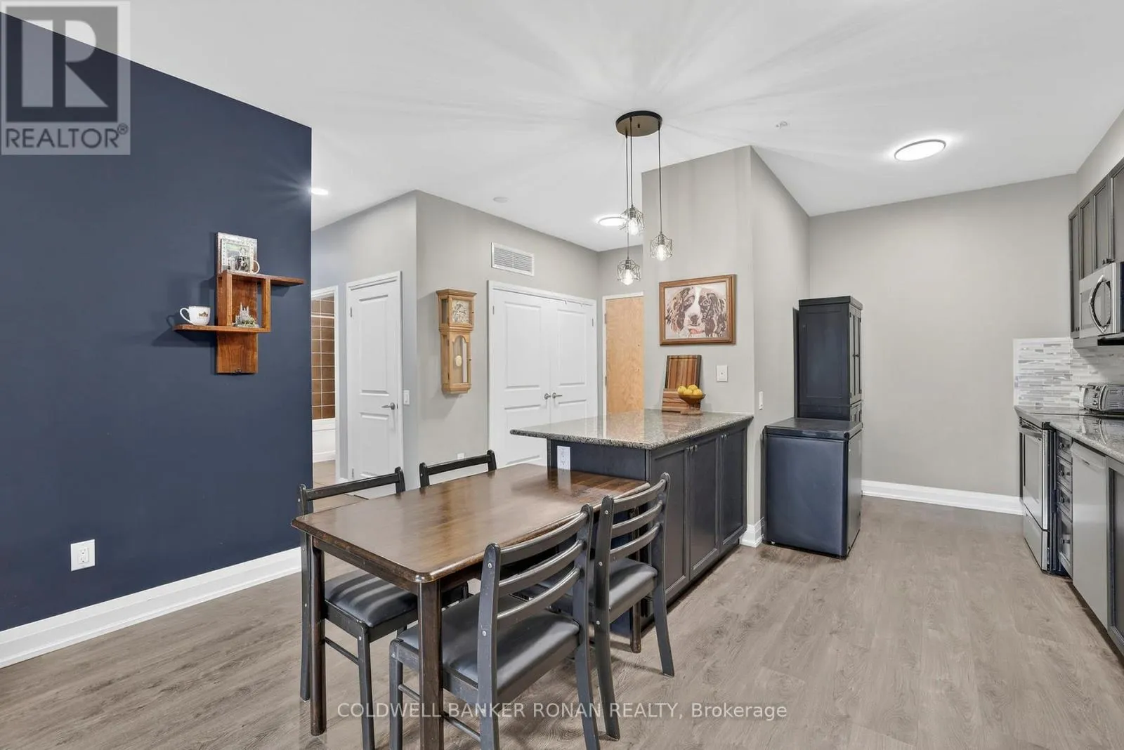Queen St S & Dillane St W Welcome to easy, low-maintenance living in this beautiful ground-floor, 2-bedroom condo, offering the perfect blend of comfort and convenience. Enjoy direct walkout access to your private terrace, ideal for morning coffee, or quick access for pets and everyday living-no elevators required. Located in the sought-after Vista Blue building, this suite is steps from shopping, dining, and essential amenities. It is also surrounded by nature with the Trans Canada Trail and a nearby conservation area right at your doorstep. Inside, the thoughtfully designed open-concept layout is enhanced by 9-foot ceilings. The upgraded kitchen is both stylish and functional. The primary bedroom offers a walk-in closet and a 4-piece ensuite with double sinks and an oversized glass shower. A second bedroom provides flexibility for guests, a home office, or additional living space. Additional features include in-suite laundry, a convenient powder room, and underground parking for year-round comfort and security. Residents enjoy access to a well-maintained building featuring a welcoming party/games room with kitchen facilities and scenic views, ample visitor parking and accessible entry options. Move-in ready unit in a prime location. (id:27476)