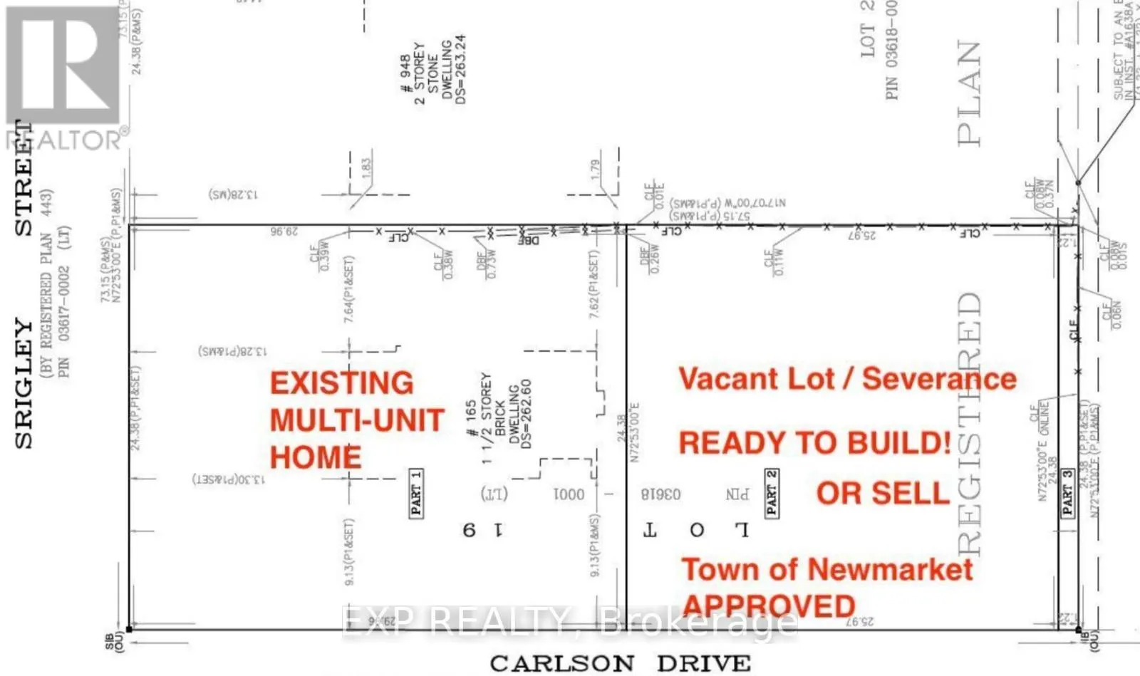 Cross Streets: Leslie St & Srigley St. ** Directions: Near Gorham. RARE FIND! **187.5 x 80 Ft** Oversized Corner Double Lot At 165 Carlson Drive - Two Parcels With Granted City-Approved Severance And Development Plans For An Additional Modern 2-Storey, 2750+ Sqft Detached Home On Additional Vacant Lot. Builder / Investors Special! This Home Located In The Heart Of Newmarkets Highly Sought-After Gorham-College Manor Community. Surveys, Minor Variance & Consent Applications Approval, Draft R-Plan Are Available Upon Request. Endless Investment Possibilities: (1) Retain The Original MULTI-UNIT Home, Sever And Sell Or Build On The Vacant Lot. (2) Renovate The Existing Home, Live On The Upper Floors And Rent The Basement Apartment With Separate Entrance While Landbanking The Second Parcel. (3) Sever The Lot And Build Two Brand-New Detached Homes. (4) Keep The Double Lot Intact And Construct A 5000+ Sqft Estate Mansion. Surrounded By NEW Luxury Multi-Million Dollar Mansions. Prime Location: Steps From Top-Rated Schools (Sacred Heart) Parks, Major Amenities, Minutes To Highway 404. 2 Lots In 1. Request A Copy Of Site-Plans And Book Your Tour Today! (id:27476)