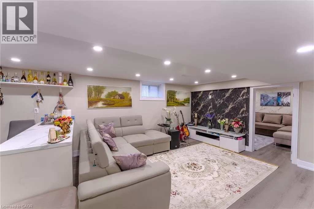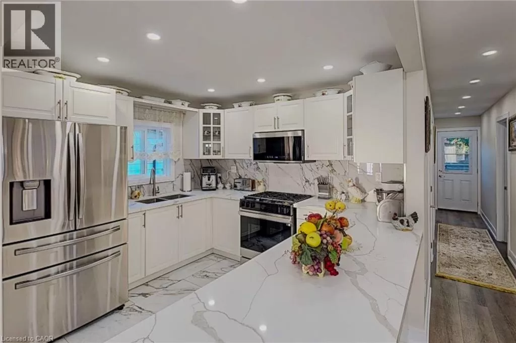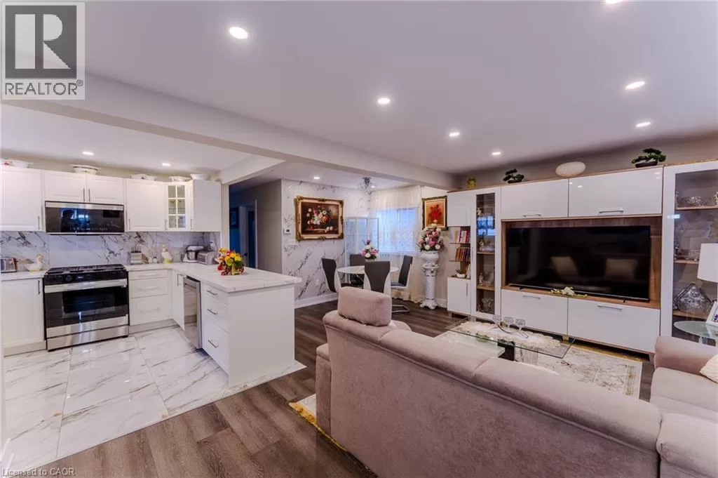 From the QEW, take the 420 exit, Turn left on Stanley Ave, Right on Bridges St, left on Sixth. House is on the right. Step inside this fully renovated Niagara Falls bungalow and experience a perfect blend of modern style and comfort. The open-concept main level boasts bright living and dining space highlighted by a showpiece high-gloss media wall and smart LED lighting. Entertain with ease in the designer kitchen featuring polished marble-look tile flooring, quartz countertops, sleek cabinetry, and stainless steel appliances. The main bathroom feels like a spa with its contemporary fixtures and smart mirror, serving the two beautifully remodeled bedrooms on this level. The main level transitions seamlessly into a fully finished lower level â an entertainerâs dream space. The expansive rec room invites movie nights and game days with its custom bar. A private guest suite (third bedroom) and a stylish second bathroom make this floor ideal for visitors or extended family. Outside, unwind or entertain in the large fenced backyard, complete with a patio area perfect for BBQs and summer gatherings. A private driveway provides convenient off-street parking. Situated on a quiet dead-end street, this home is minutes from schools, parks, shopping, and transit. Enjoy the best of both worlds â a tranquil neighbourhood setting with quick access to all the amenities and attractions Niagara Falls has to offer. This turn-key home delivers smart features, designer finishes, and an unbeatable lifestyle location! (id:27476)
