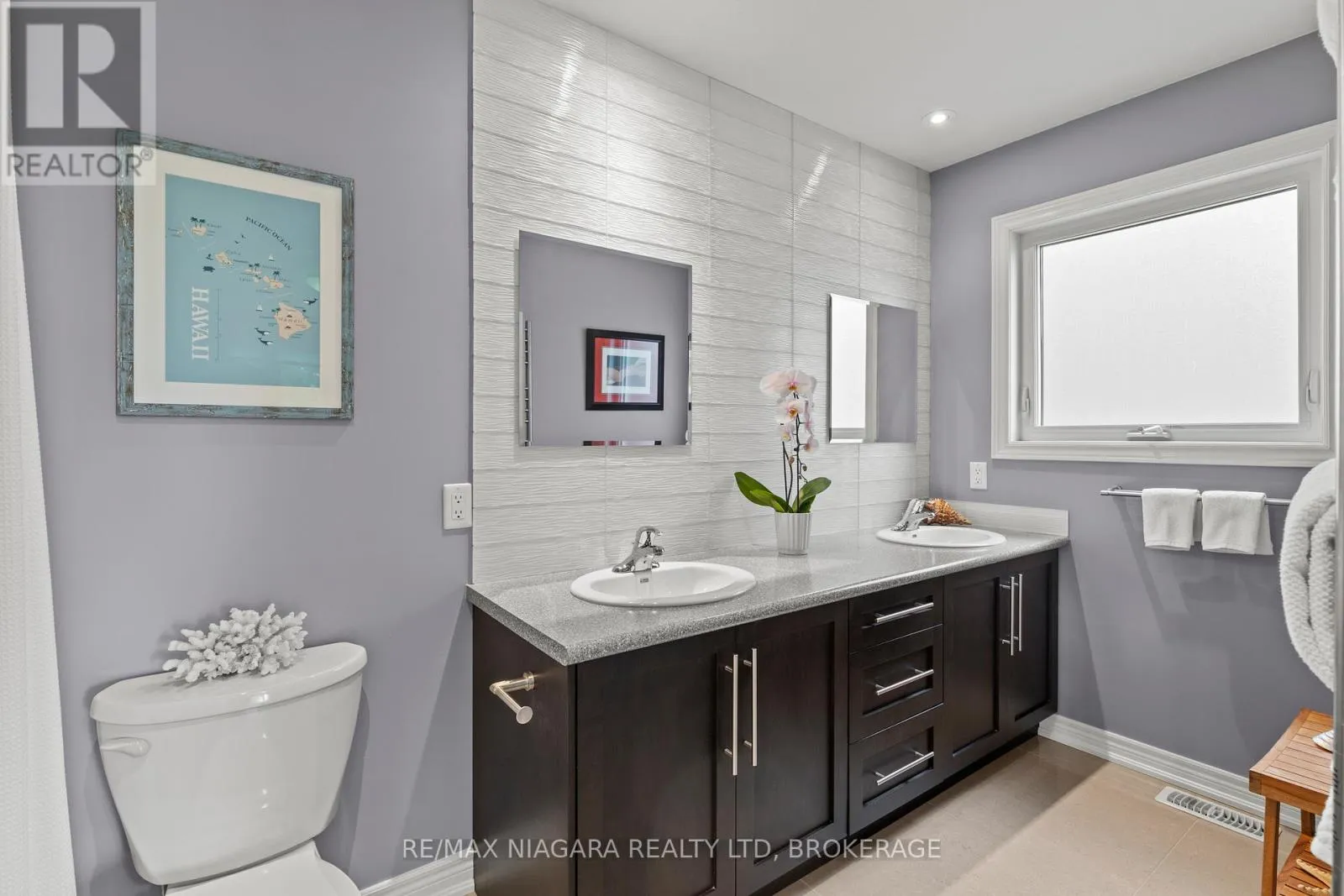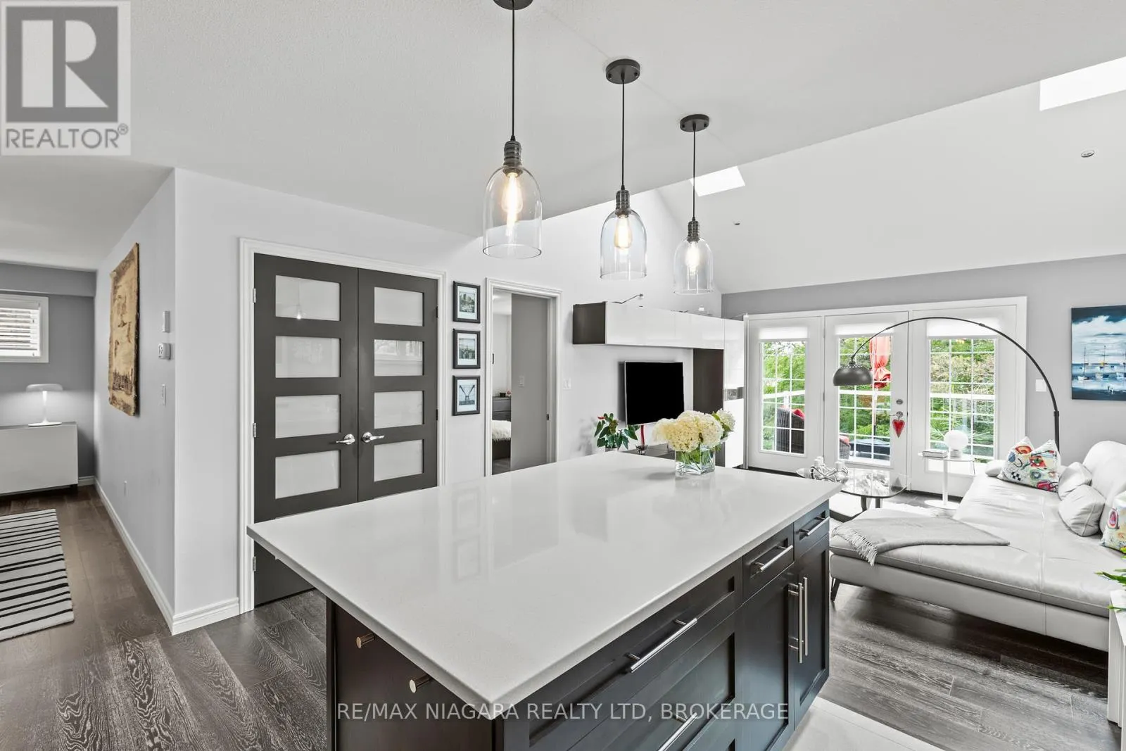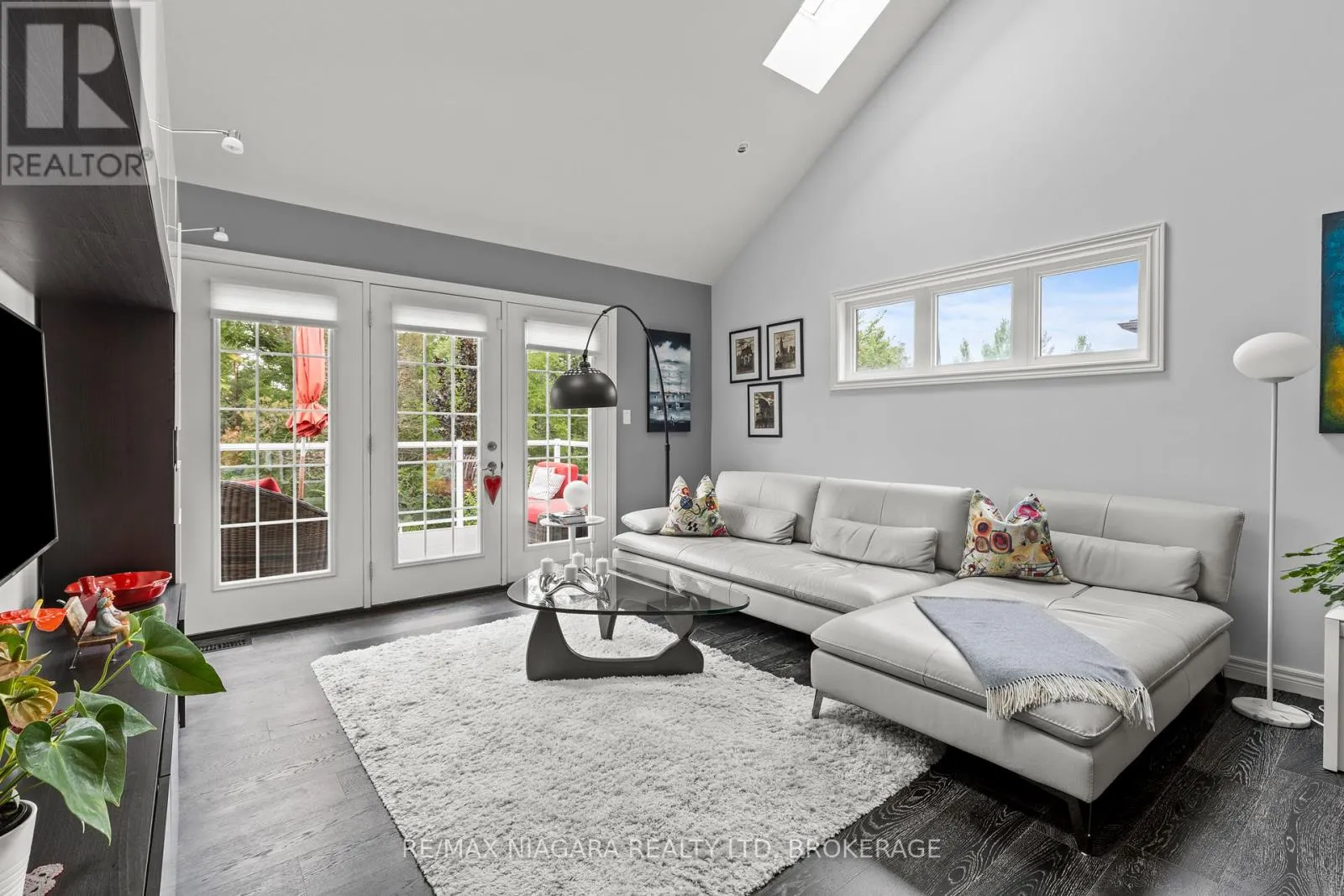 Lundy's Lane and Kalar Rd. BEAUTIFUL BUNGALOFT BACKING ONTO FOREST WITH 2400 SQ FT OF TOTAL LIVABLE SPACE! Located in a quiet and desirable neighbourhood of Niagara Falls, this home is filled with natural light, thanks to five skylights and large windows throughout. The well-designed floor plan features 2 spacious bedrooms, 3.5 bathrooms, and a thoughtfully laid-out open-concept living space. The heart of the home is the kitchen, which boasts a large island, perfect for meal prep or casual gatherings. It seamlessly flows into the living and dining areas, making this home an entertainer's dream. The main floor primary bedroom offers a peaceful retreat and is complemented by a luxurious 4-piece ensuite, providing a spa-like experience. Upstairs, you'll find a loft area with an office that overlooks the main floor, offering a quiet space to work or unwind while enjoying the view of the open living area below. The living room offers a garden door walkout to a composite deck terrace, complete with sleek glass aluminum handrails, perfect for outdoor dining or relaxing. Step outside and enjoy the beautifully landscaped gardens that surround the home, adding vibrant colour and curb appeal. The backyard offers serene wooden views, creating a peaceful and private retreat. The professionally finished basement includes a cozy gas fireplace stove and walkout access to a patio, ideal for entertaining or quiet evenings at home. Additional highlights include vaulted ceilings, an east-west orientation that provides ideal sun exposure, and a forest-facing backyard that adds privacy and tranquillity. This home is move-in ready and perfect for those seeking peace, space, and comfort, all within close proximity to amenities, parks, and highway access. (id:27476)