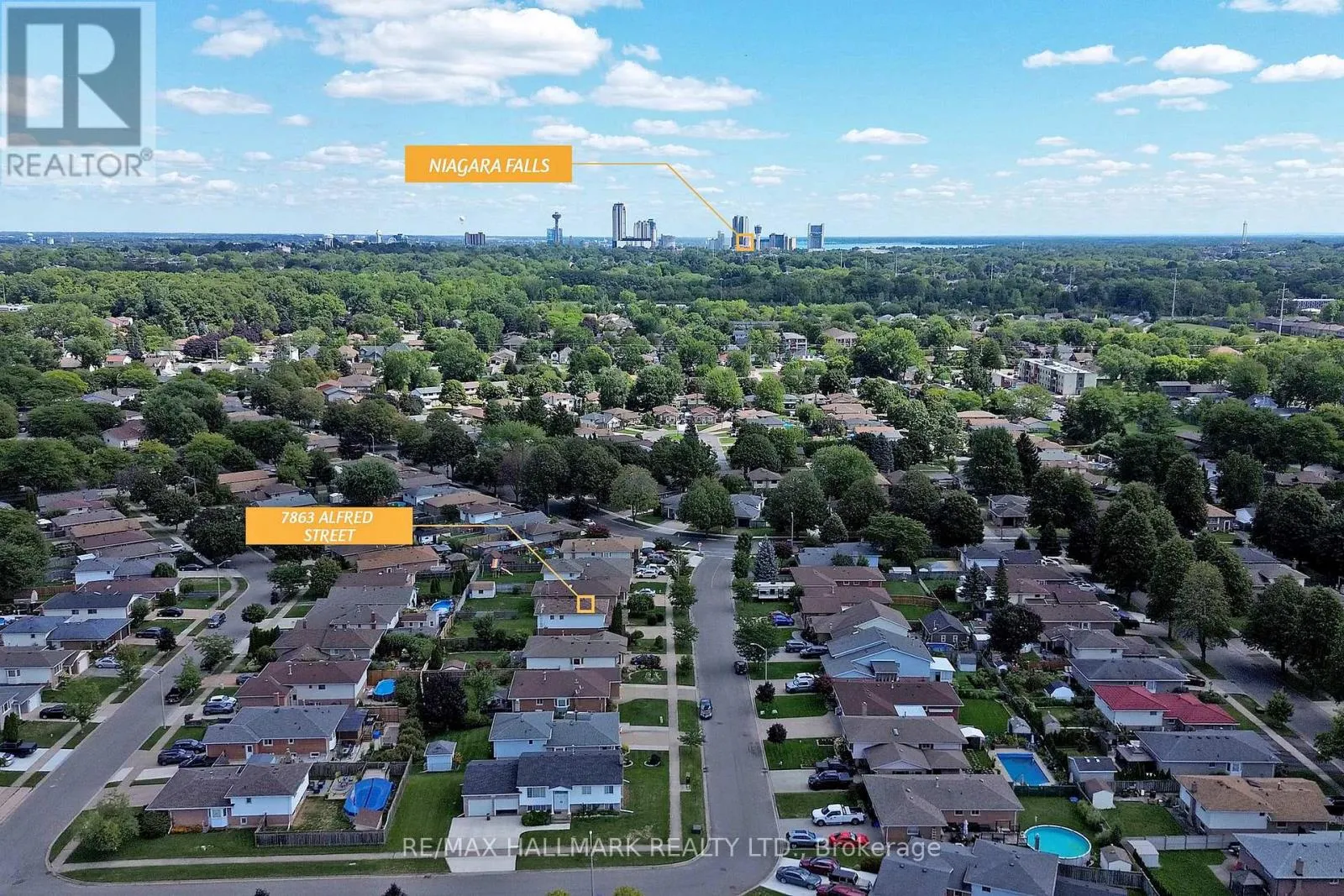 Cross Streets: Lundy's Ln & Montrose Rd. ** Directions: West from Chartwood Ave. Welcome to 7863 Alfred Street -a rare opportunity in the desirable West Wood community of Niagara Falls, where space, safety, and smart investment potential come together. Situated on an impressive 50 x 124 ft lot, this beautifully maintained 2-storey detached home with a double-car garage offers nearly 1,800 sqft of finished living space in a quiet, family-friendly neighbourhood known for pride of ownership. Ideal for homeowners, multi-generational living or buyers seeking long-term value. The main level features a bright, open-concept layout with sun-filled living and dining areas flowing into a spacious eat-in kitchen with quartz countertops. Skylights and California shutters enhance natural light, while direct access to the attached 2-car garage adds everyday convenience and flexible workspace potential. Upstairs offers three generous bedrooms, including a primary suite with dual closets and a private ensuite. Two additional bedrooms share a stylish four-piece bathroom, also finished with quartz counters. The separate-entrance finished basement provides excellent versatility. This space may be suitable for an in-law suite or secondary living area, subject to buyer's due diligence and municipal approvals. Buyers may explore the potential for supplemental rental income to help offset ownership costs. All rental use, income amounts, and compliance to be independently verified by the buyer. The lower level includes a cozy wood-burning fireplace, ample storage, and flexible living space. Enjoy a fully fenced, landscaped backyard, perfect for entertaining, children, or pets, plus a newer shed for added utility. Recent updates include roof, A/C, flooring, select windows and California shutters, offering move-in confidence. Conveniently located approximately 10 minutes to downtown Niagara Falls, close to schools, parks, shopping and commuter routes. A solid home. A safe community. An opportunity to explore additional income potential. Book your private showing today. (id:27476)