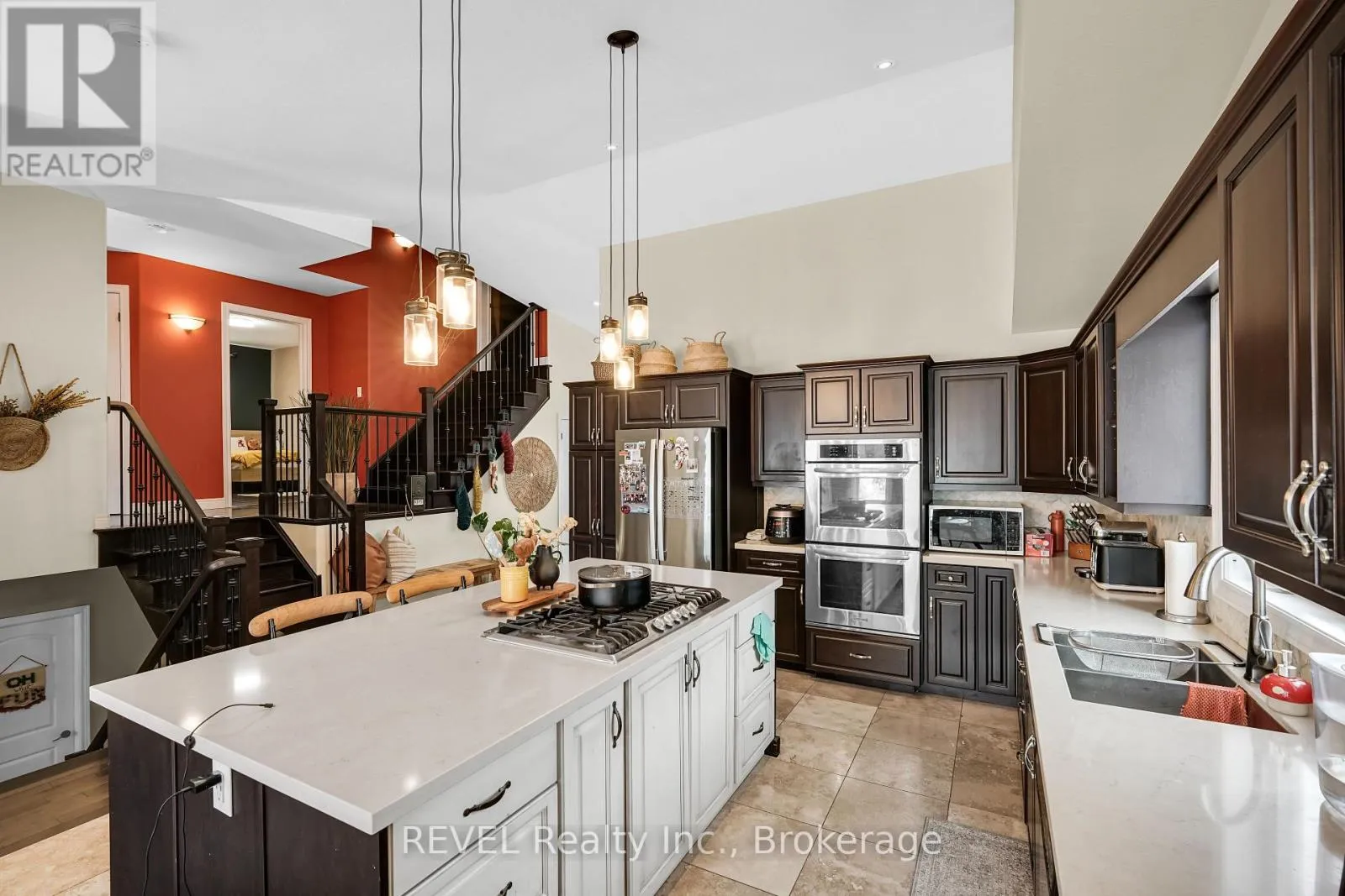 Cross Streets: Garner and Hendershot. ** Directions: Garner to Hendershot to Tapestry. This stunning custom side-split in beautiful Fernwood Estates offers a layout that works perfectly for the whole family. The main floor features a bright front living room overlooking the quiet court. The incredible gourmet kitchen is truly a chef's dream, showcasing a massive custom center island with a built-in spice pullout, a retractable vented gas range, stainless steel refrigerator, two built-in ovens, under-cabinet lighting, quartz countertops, taps, and backsplash. Open to the dining area, it creates an ideal space for gathering with family and friends.Dark hardwood flooring continues upstairs to the second level, which includes three spacious bedrooms, a full bathroom, and lighted closets with organizers. The private third-level primary suite boasts cathedral ceilings, a fireplace, a walk-in closet, and an ensuite bathroom.The lower level offers a large family room with walk-out access, a powder room, and an office or bedroom complete with a wet bar. The lowest level of the home provides triple closet space, laundry facilities, and ample storage, making it suitable as an additional bedroom or family room.Fresh paint throughout the home adds beautiful contrast and character. The attractive exterior features a two-car garage, front porch, irrigation system, double-wide stamped concrete driveway, and two backyard access points-one from the kitchen and one from the family room-enhancing its excellent curb appeal. During the warmer months, perennial gardens in both the front and back yards add vibrant colour. Numerous updates have been completed, including the kitchen appliances, island, countertops, taps, sink, furnace, central vacuum, sump pump, irrigation system, deck, and pergola-just to name a few. (id:27476)