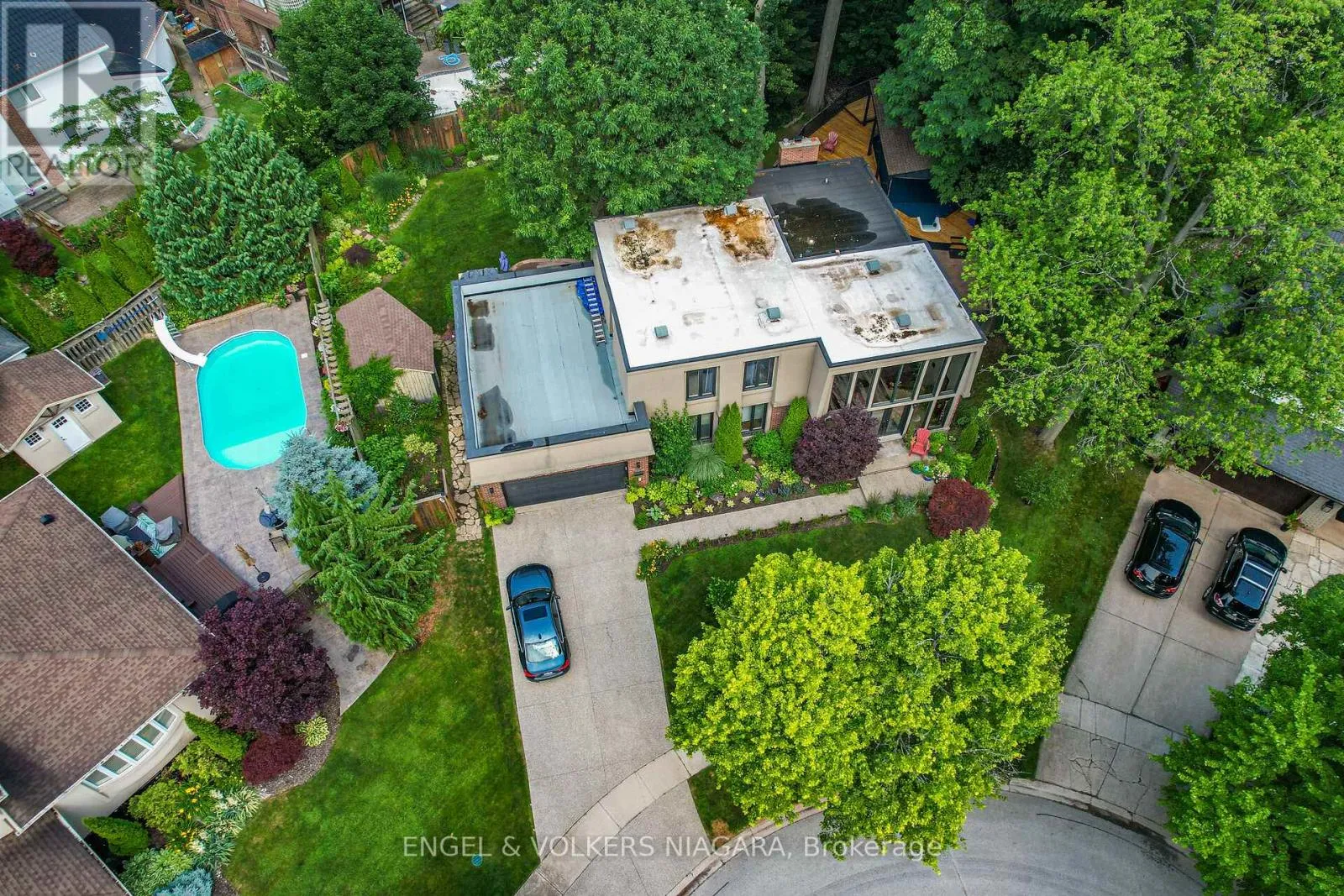 Cross Streets: Dorchester to Woodington St. to Woodington Road to Neolla. ** Directions: Dorchester Road to Woodgate Street to Woodington Road to Noella Crescent. NEW ROOF! Welcome to the highly desired North end in Rolla Woods sitting on the border of Niagara Falls and Niagara on the Lake Wine Country in a quiet mature Cul-de-Sac. Walking into this home's foyer is breathtaking with the floor to ceiling windows and a winding staircase, natural light emanates and gives life throughout this entire home. This one off contemporary home design sits on a large natural wooded lot not found in many new subdivisions, giving off vibes of small town life with a cottage country feel in an upscale neighbourhood. This beautifully updated 3-bedroom, 3-bathroom home has a very spacious and sprawling open concept on the main floor with amazing light and 360 degree views of the pool area and backyard while offering a blend of functionality, comfort and style throughout. On the main floor you will discover 20 foot vaulted ceilings with a warm and inviting calm interior. The heart of the home features a rare fully functional granite wood-burning fireplace surrounded by the spacious main floor living room, perfect for entertaining and relaxing. Upstairs,you'll find three generously sized bedrooms including a serene primary suite with direct access to the main bath with a gorgeous new large walk-in rain shower. Set in a parklike setting is your private and quiet backyard oasis, almost cottage like, complete with an on-ground pool surrounded by a custom wood deck, ideal for summer entertaining or simply unwinding peacefully.The downstairs has been 100 % completely renovated with a seated wet bar and a cozy gas fireplace, a kids play room or extra storage area and an additional 3rd bathroom with a walk-in shower. The double garage offers plenty of storage and,with 2 points of entry into the home, one being a very generous mud room for extra space and storage that connects directly to the kitchen which can also act as a large pantry.Don't miss this opportunity to own a move-in ready home in the soughtafter North end of Niagara Falls and Wine country. (id:27476)
