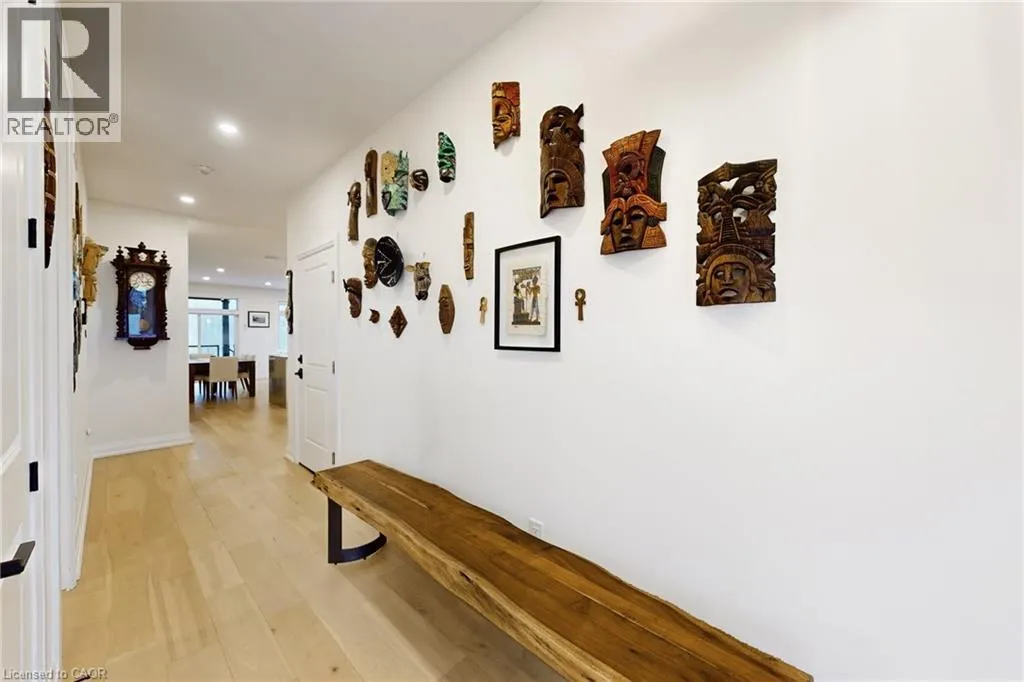 Enjoy luxury living and architectural elegance in this extensively upgraded double car garage bungalow townhome which backs on to the wooded area and located steps from world class 'Legends on the Niagara' golf course in Niagara's premier contemporary community. Luxury finishes throughout the house including $125K (as per seller) spent in quality upgrades and enjoy carefree living in this rare enclave of upscale homes. Features include 9' ceilings on main level, 8' tall interior doors, gorgeous gourmet kitchen with stainless steel appliances, extended center island with Quartz countertops and waterfall edge, laundry room with custom built-ins located conveniently off of the kitchen. Modern open concept great room with electric fireplace and floating wood mantle, large windows, sliding glass door leading to private, covered 20' x 10' deck finished with glass railing and gorgeous views of wooded area. Backyard also features a concrete patio and natural gas hookup for BBQ. Serene primary bedroom with large walk-in closet and spa-inspired 5PC ensuite, complete with glass and tile shower, soaker tub, double vanity and Quartz counters. West facing 2nd bedroom with large windows, 4PC guest bath and interior door to double car garage with rough-in for future electric vehicle completes the main level. Finished basement with upgraded carpet and under pad provides additional 660 Sq Ft of luxurious living space including a bedroom, 3PC ensuite bathroom with heated floors & custom wood shelves, a huge rec room with large window and exercise area. Unfinished mechanical room is 307 Sq Ft in size. Home is wired with audio system in all the rooms, outside video cameras installed and comes with Sony surround sound system, Sonos Amps, HIKVISION for video surveillance along with the 90 TV in the basement rec room. Hunter Douglas blinds throughout with remotes. Upgraded lighting throughout. 200 AMP Electrical Panel. Energy Star certified and located close to golf, watersports and more! (id:27476)