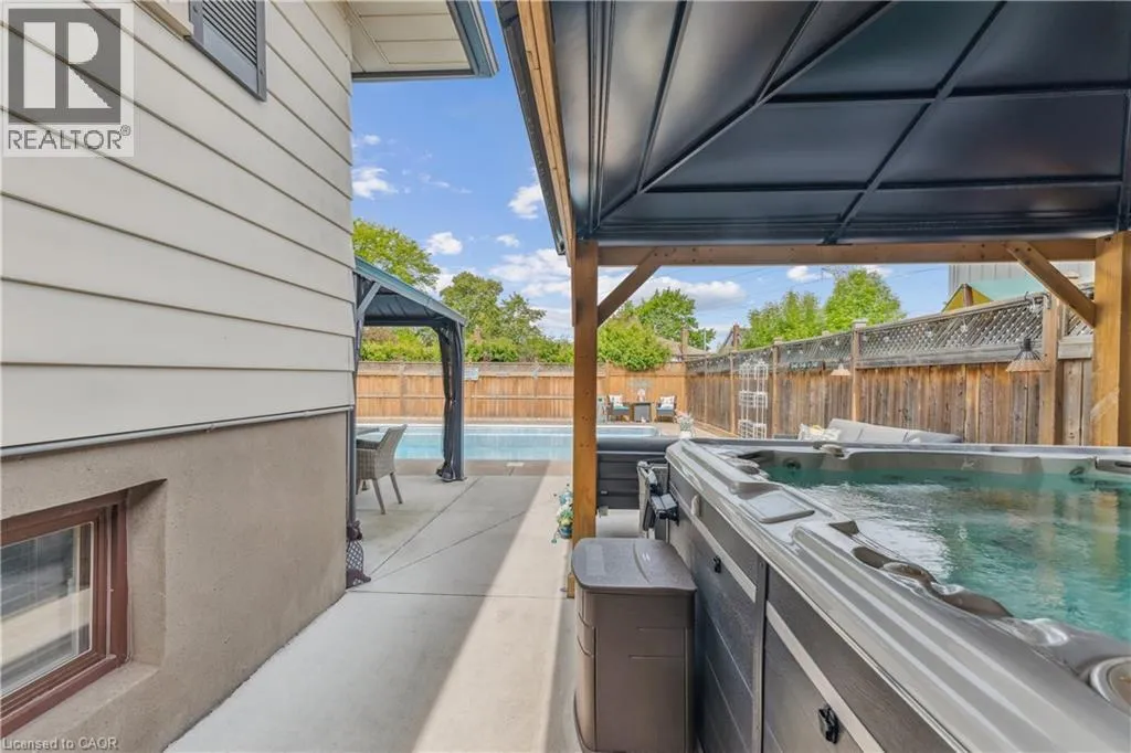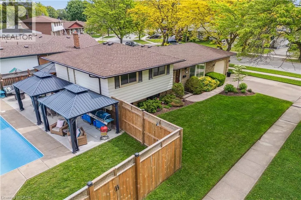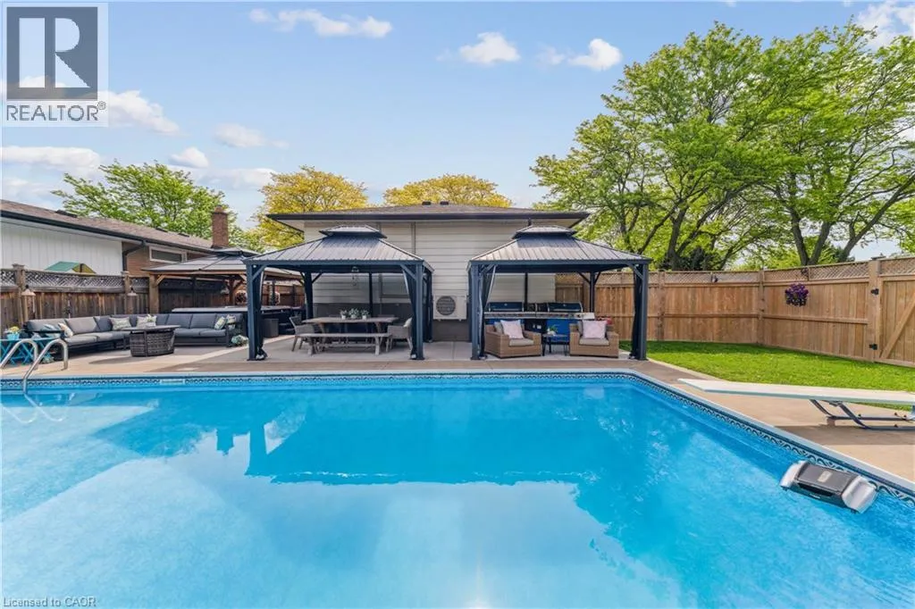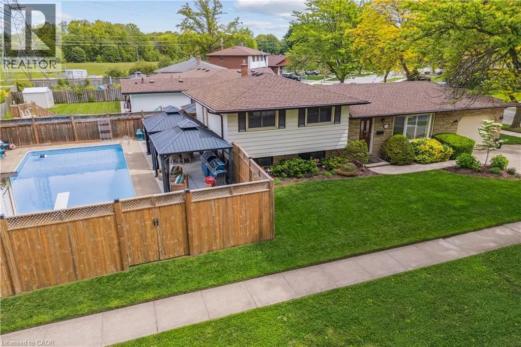 Dorchester Road & Wilinger Street Welcome to your Entertainers' Paradise situated in one of the most sought-after neighbourhoods in Niagara Falls. This spacious 3+1 Bedroom side split home offers approximately 2000 sq ft of finished living space and sits on a gorgeous 6600sq ft corner lot, surrounded by mature trees and parks. Enjoy the ultimate in unparalleled hosting in your private outdoor oasis that features a giant 30x18 inground pool (all equipment 2021 and will stay in poolhouse), an oversize 10 person hot tub covered by a large gazebo, a range of outdoor cooking appliances including 2 propane bbqs, as well as several dining and lounging areas under two more large gazebos. Your hosting continues through the sunroom to the xl garage that is currently set up as a sports bar and dining area, but can easily be converted back into a parking garage with ample workshop space. Not to be outdone by the spectacular exterior, step inside into the serene open dining area that features a cozy bay window and leads into the recently updated kitchen. All new countertops, backsplash and appliances, and sleek recessed lighting creates a modern farmhouse kitchen, and the abundance of countertop and storage space means cooking is not a task, it is a joy! There are three spacious bedrooms on the upper level that share a well appointed four piece bathroom. Step down to the large living room with beautiful original back-lit oak cabinets. This leads into the bonus room that can be used as a playroom, office, exercise room or lounge area. Another good-size bedroom and two-piece bathroom adds to the downstairs living space, with a built-in shower in the next room. Need storage? We've got you covered! The huge laundry room in the basement features washer and dryer, along with shelving and storage space in abundance. Immaculately maintained. Close proximity to schools, highway access, transport, shops, parks and more. (id:27476)