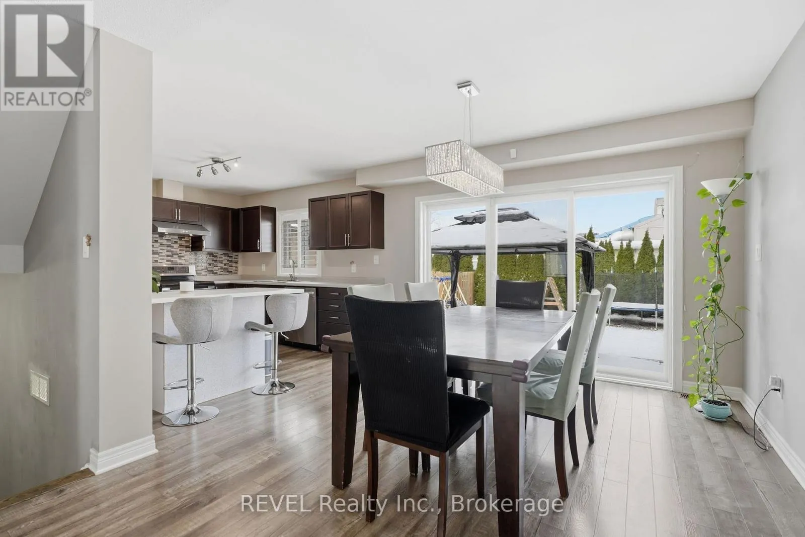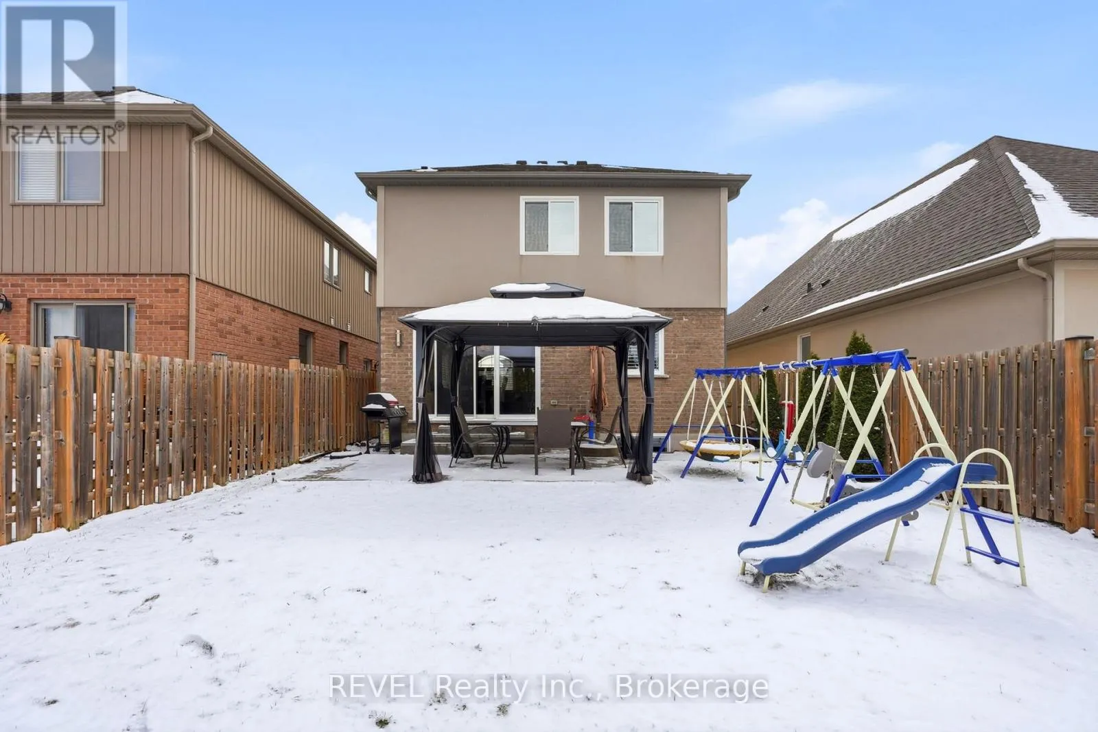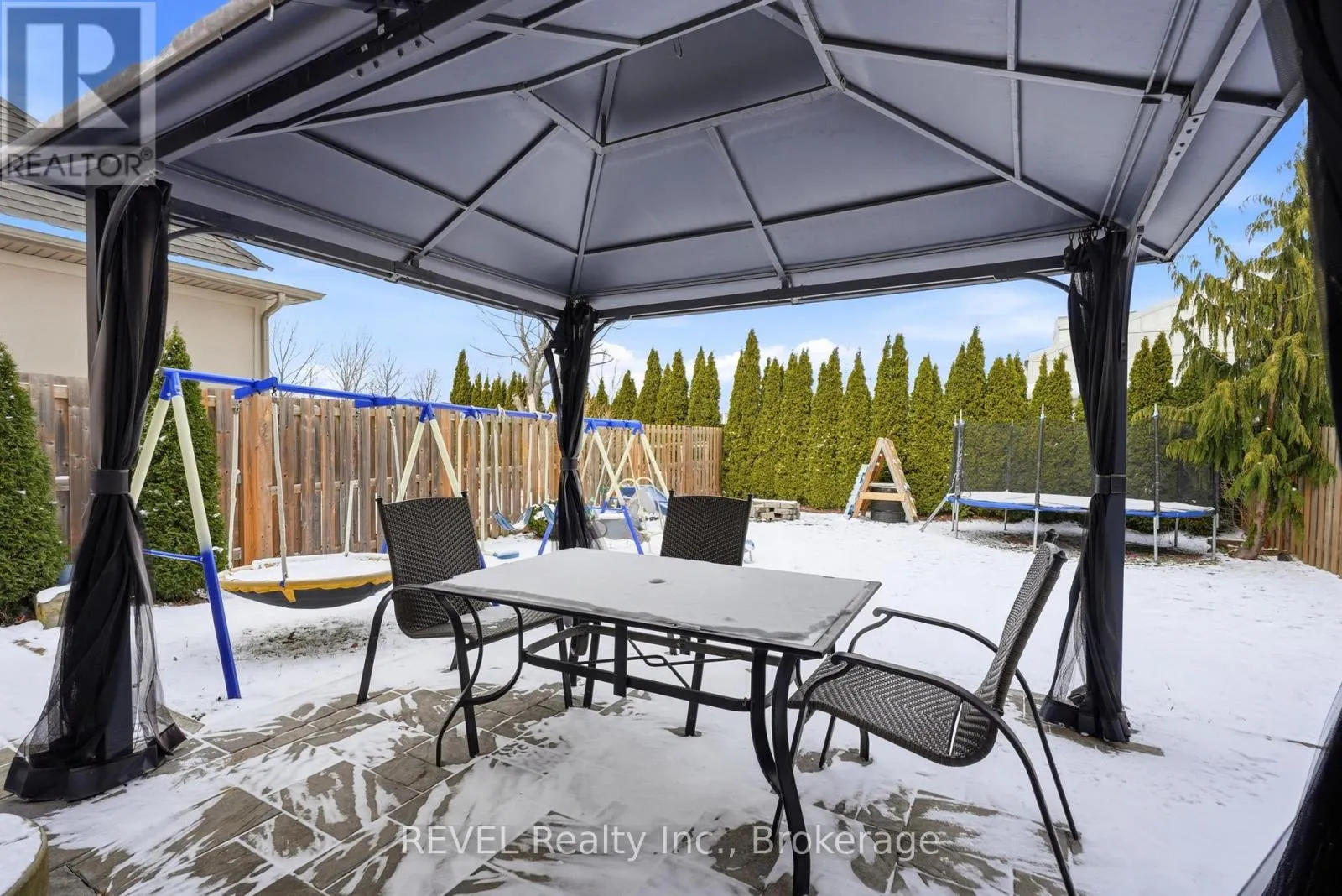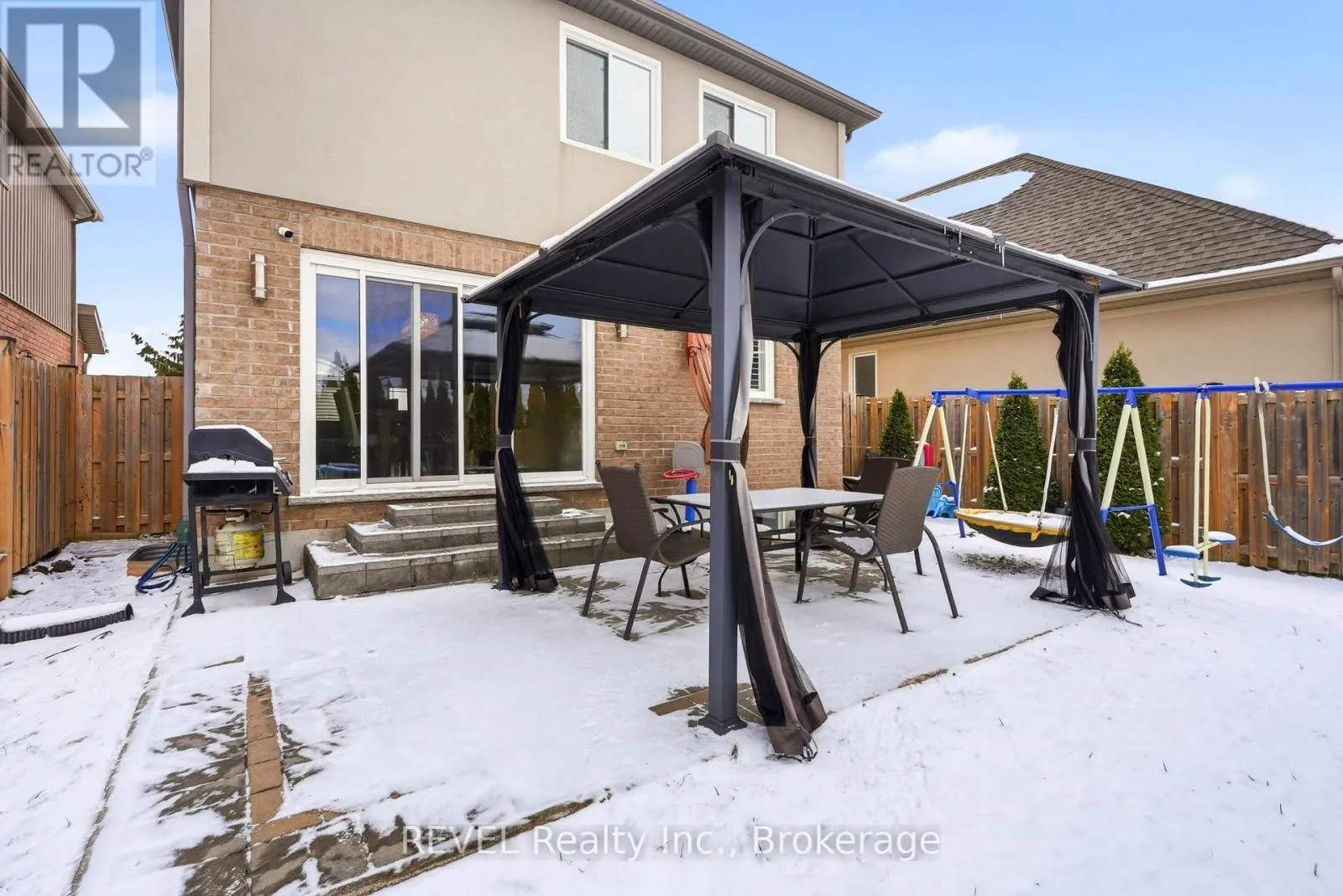 Cross Streets: Angie dr. ** Directions: Off Angie Drive. Welcome to 8553 Jennifer Crescent, a masterpiece of modern living built in 2014 by prestigious custom builder Pinewood Homes, offering a rare sanctuary with no rear neighbors. This stunning property immediately captivates with its sophisticated stone and stucco exterior and an elegant interlock driveway. Inside, the open-concept main floor features living room with arched window and elegant California shutters throughout. The heart of the home is a modern kitchen with espresso-toned cabinetry and a mosaic backsplash, flowing seamlessly into a bright dining area. Large patio doors lead to your private backyard retreat, bordered by a dense privacy hedge and featuring an interlock patio under a protective gazebo-the perfect setting for summer relaxation or family fun including play sets and a fire pit. As you head to the second level, you'll find a clever office nook at the spacious landing, ideal for remote work. The upper floor boasts three spacious bedrooms, including a serene primary suite with a dedicated 3-piece ensuite. A second bedroom impresses with vaulted ceilings and a stunning arched window, while the pristine main bathroom offers extensive cabinetry and modern lighting. Functional elegance continues in the professionally finished basement, a cozy sanctuary anchored by a magnificent floor-to-ceiling cultured stone gas fireplace and a designer laundry center with high-end appliances. Every inch of this home is move-in ready and meticulously maintained. Perfectly located in a premier Niagara Falls enclave, you are within walking distance to top-rated schools, parks and grocery store, with immediate access to Costco, major highways, and championship golf courses. (id:27476)