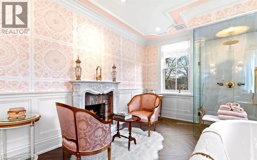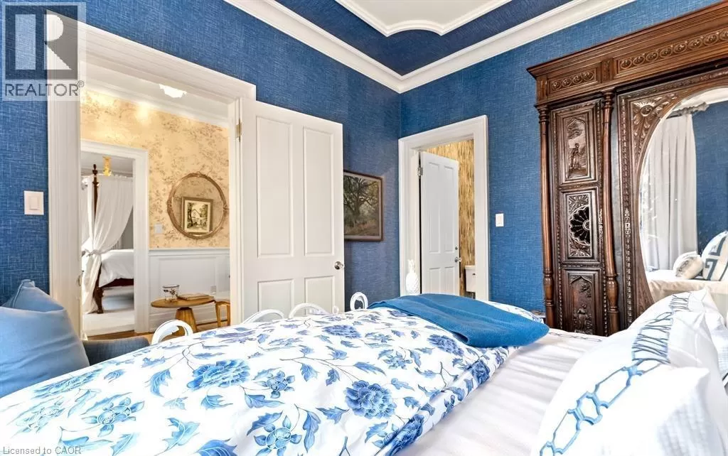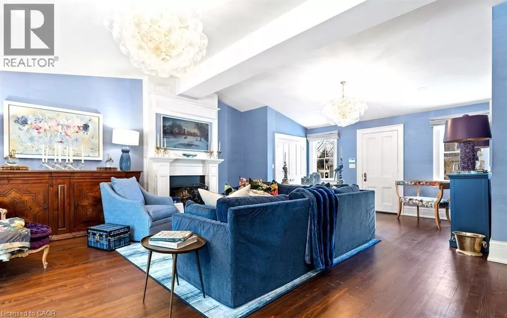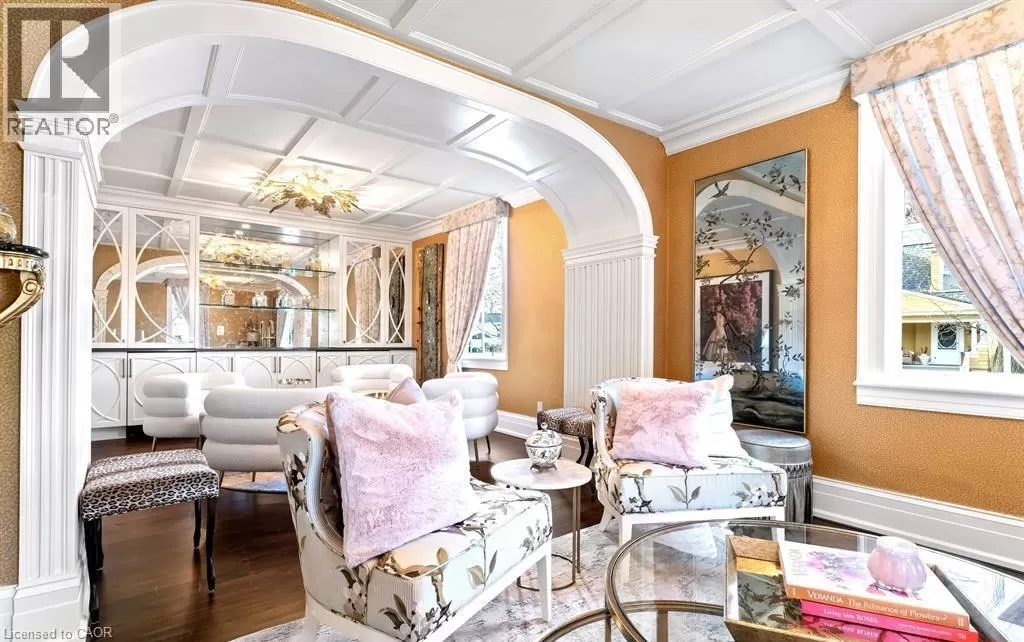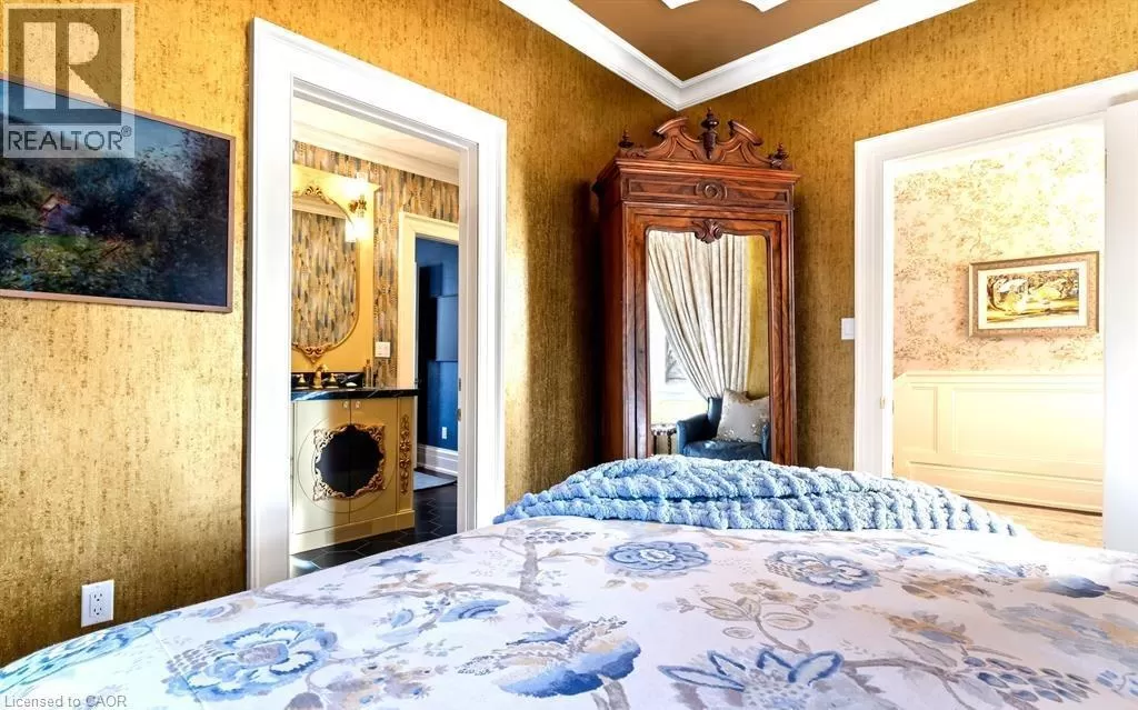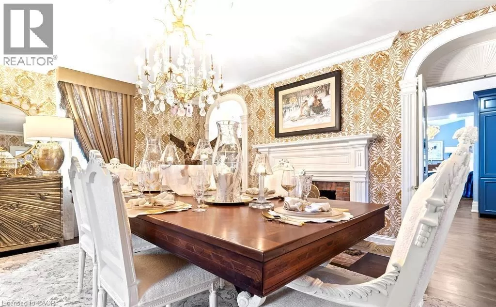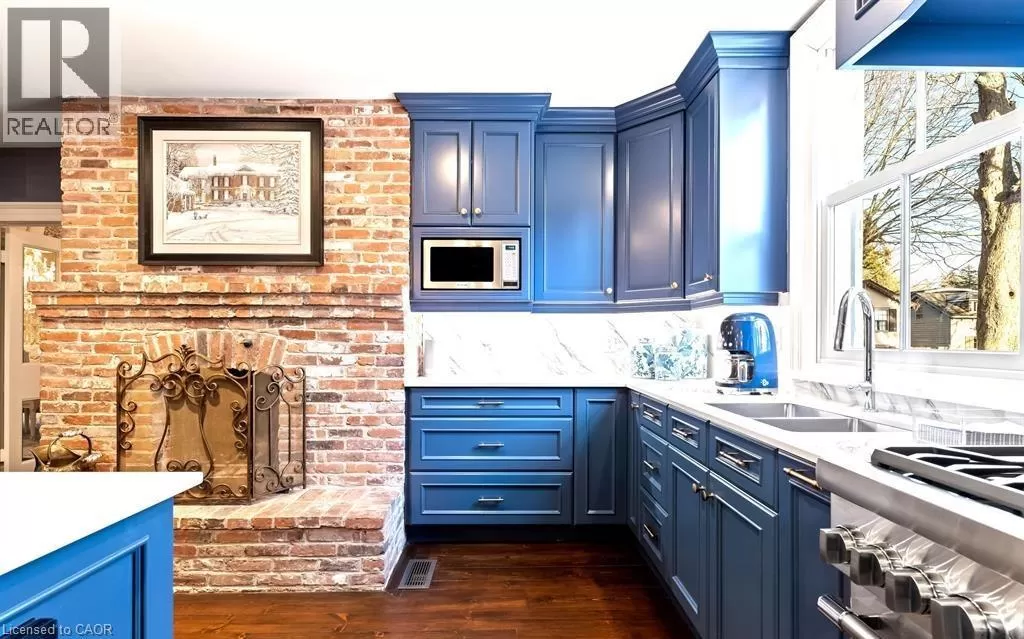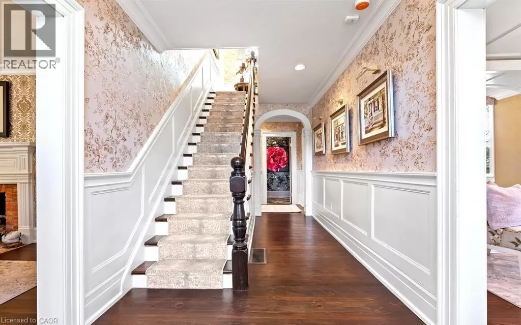 Corner of Prideaux and Victoria Located in one of the most desirable areas of Old Town, beautiful marriage of old-world charm and modern upgrades. Walk to iconic Queen St. with its boutiques, restaurants and theatres or take a short stroll to the waterfront. Enjoy the serenity of Queen's Royal Park or play a round of golf at Canada's oldest golf course. This home showcases stunning decor such as designer light fixtures, custom drapes, valances and luxurious wall coverings. Enter through the antique door into the elegant front entry with gleaming hardwood floors throughout. The formal dining room is sheer opulence with its antique chandelier set in a plaster ceiling medallion, decorative built-in shelving and fireplace with hand-crafted mantle. The grand living room features a beautiful archway with custom millwork set between coffered ceilings with designer brass fixtures, built-in bookcase and buffet with accent mirrored wall. Bright and airy, the kitchen is definitely the heart of the home with 5 stainless steel appliances, center island, quartz countertops, Nantucket grey cabinetry, heated floors and cozy fireplace. Spacious family room with its comfortable seating centered around a fireplace with hand-crafted mantle and soaring vaulted ceiling with contemporary bubble chandeliers. A gorgeous sunken sunroom which offers floor-to-ceiling windows and 4 skylights overlooking the jaw-dropping two-tiered yard. Main floor guest retreat with ensuite. The Grand Victorian staircase features designer runner and custom wainscotting leading to the elegant and spacious landing. Each of the 3 bedrooms have beautiful hardwood flooring, the Primary bedroom with private water closet and spa-like ensuite bath with heated herringbone tile, sumptuous soaker tub, walk-in glass rain shower. Second and third bedrooms share a bath with heated marble flooring and custom vanity. A cozy rec-room and 2nd kitchen in the lower level completes this charming home. (id:27476)