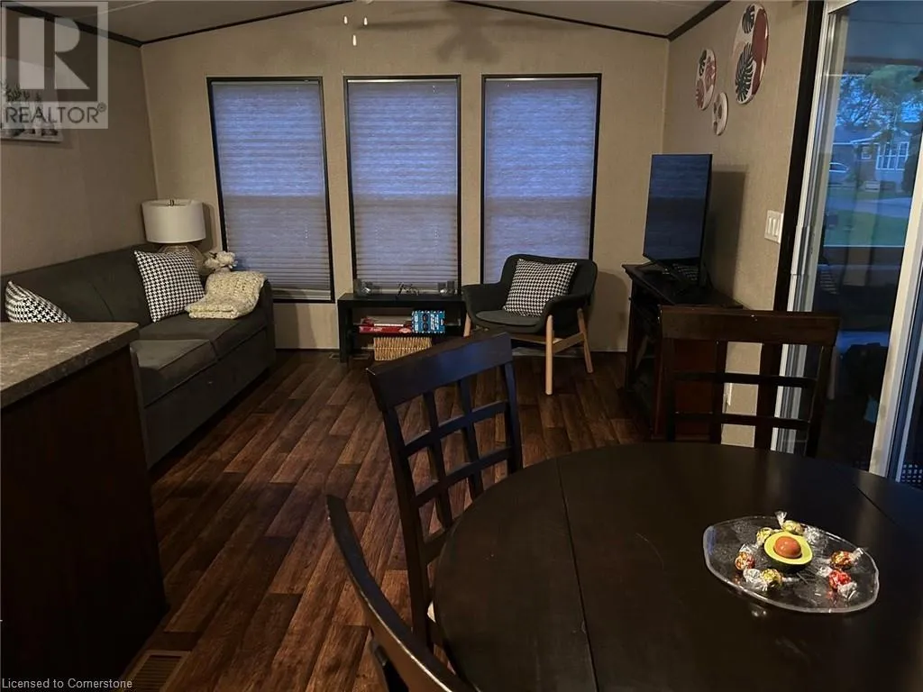 Niagara River Parkway to Line 8 Welcome to Unit 520 at 1501 Line 8 Road a fully furnished 2-bed, 1-bath 2013 Northlander Acorn model located in Vine Ridge Resort. Nestled in a quiet, tree-lined section of the park, this unit offers added privacy and a peaceful setting, ideal for those looking to relax and unwind. Inside, you'll find a bright, open layout with a full kitchen, wood cabinetry, and ample storage throughout. One of the standout features is the extra-large, fully covered deck - sheltered by a full roof, it offers a comfortable outdoor space that feels like a true extension of the home. Vine Ridge Resort offers a wide range of amenities, including two swimming pools (one heated), a splash pad, sports courts for basketball, pickleball, and tennis, multiple playgrounds, scenic walking and biking trails, and picnic areas. The resort also hosts a calendar of activities throughout the season, creating a fun and lively atmosphere for families and guests. Open from May 1 to October 31, the resort allows short-term rentals including Airbnb making this an excellent choice whether you're looking for a weekend escape, a seasonal rental, or a low-maintenance cottage alternative. Unit 520 offers a rare combination of privacy, space, and resort-style living right in the heart of Niagara's wine country. (id:27476)