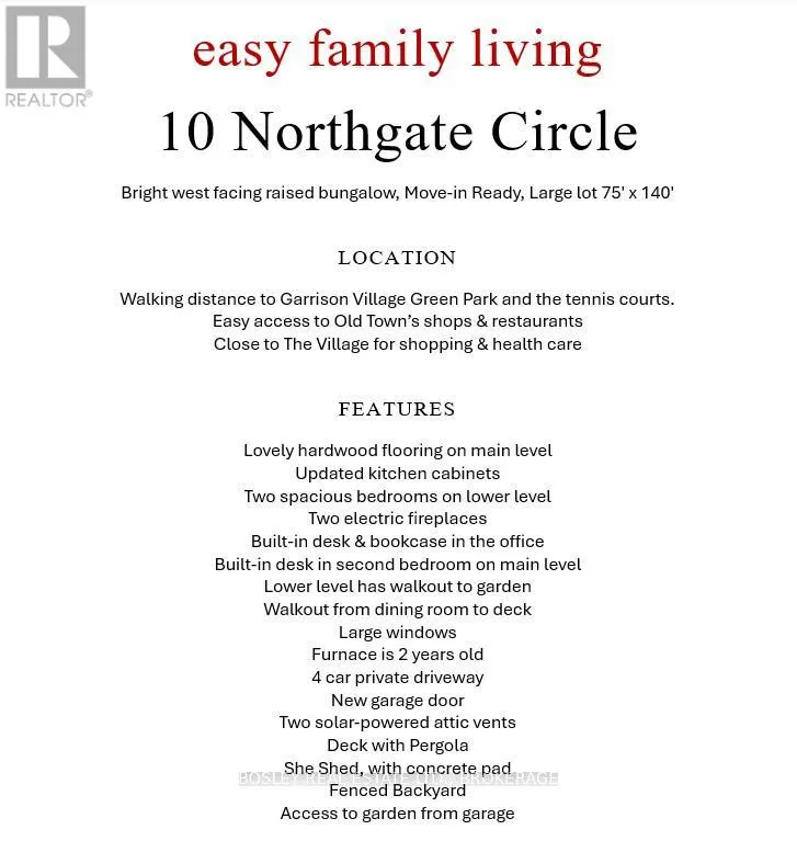 Cross Streets: Garrison Village Drive & Colonel Butler Crescent. ** Directions: Lakeshore to Garrison Village Drive to Colonel Butler Crescent. Welcome to this delightful, updated (2016) raised bungalow featuring two-plus-two bedrooms and two-and-a-half bathrooms, nestled in the heart of Niagara-on-the-Lake. Here, comfort, convenience, and charm come together seamlessly. This move-in-ready residence is thoughtfully designed to support everyday living while offering a warm, welcoming atmosphere that instantly feels like home. Inside, you'll find a bright, spacious layout with two well-appointed bedrooms on the main level, plus a work-ready office complete with a built-in desk and bookcase. Two full bathrooms and a convenient two-piece ensuite ensure smooth mornings for everyone. Each space is crafted to be both functional and inviting, making daily life feel effortless. The sunlit lower level features a walkout to the garden, two generous bedrooms, and a cozy family room with large windows that bring the outdoors in. Step outside to enjoy the expansive 70' x 145' lot and the neighbourhoods natural beauty. Garrison Village Green Park is just a short stroll away, perfect for leisurely walks, a game of tennis, or simply soaking in the changing seasons. The Village shops are also just minutes from your door. Whether you're starting fresh, growing your family, or seeking a change of pace, this home provides the perfect foundation for your next chapter, letting you focus on living, not renovating. (id:27476)