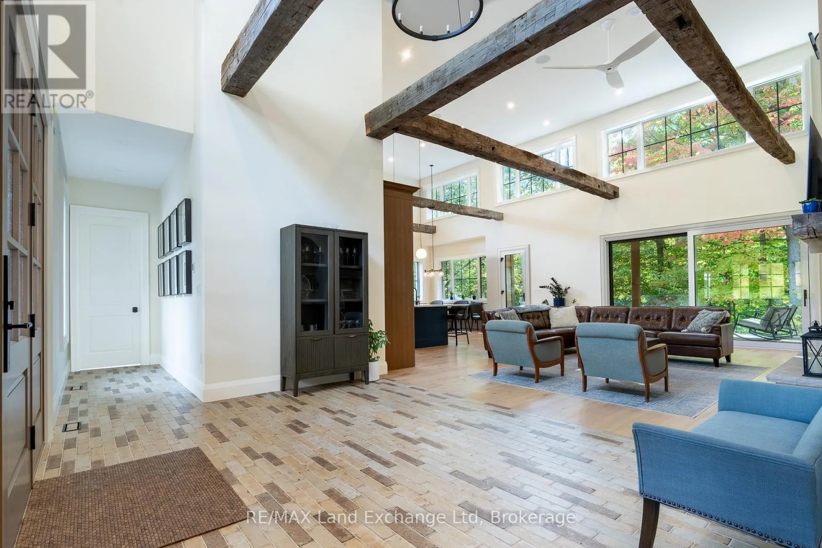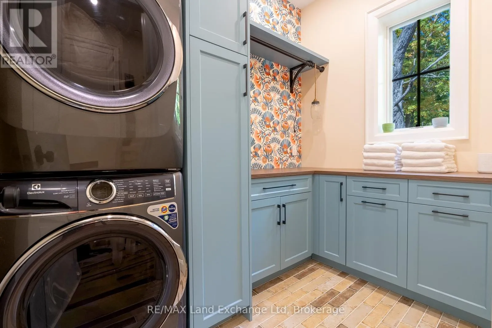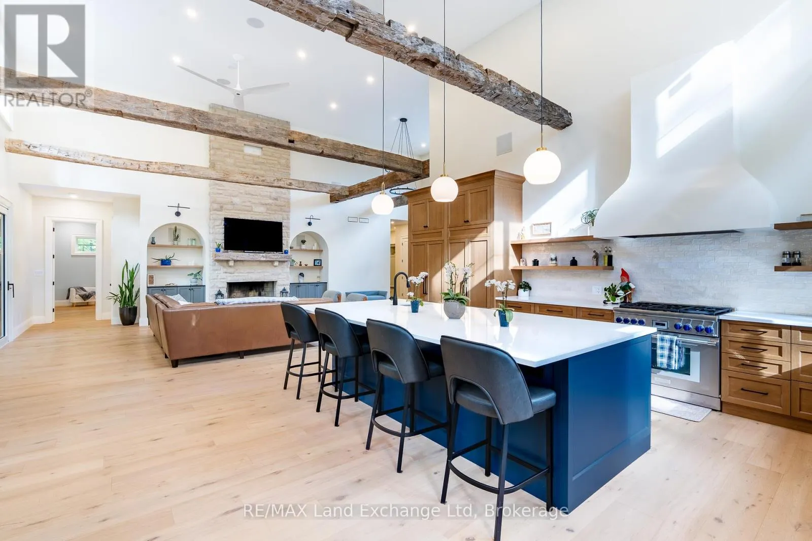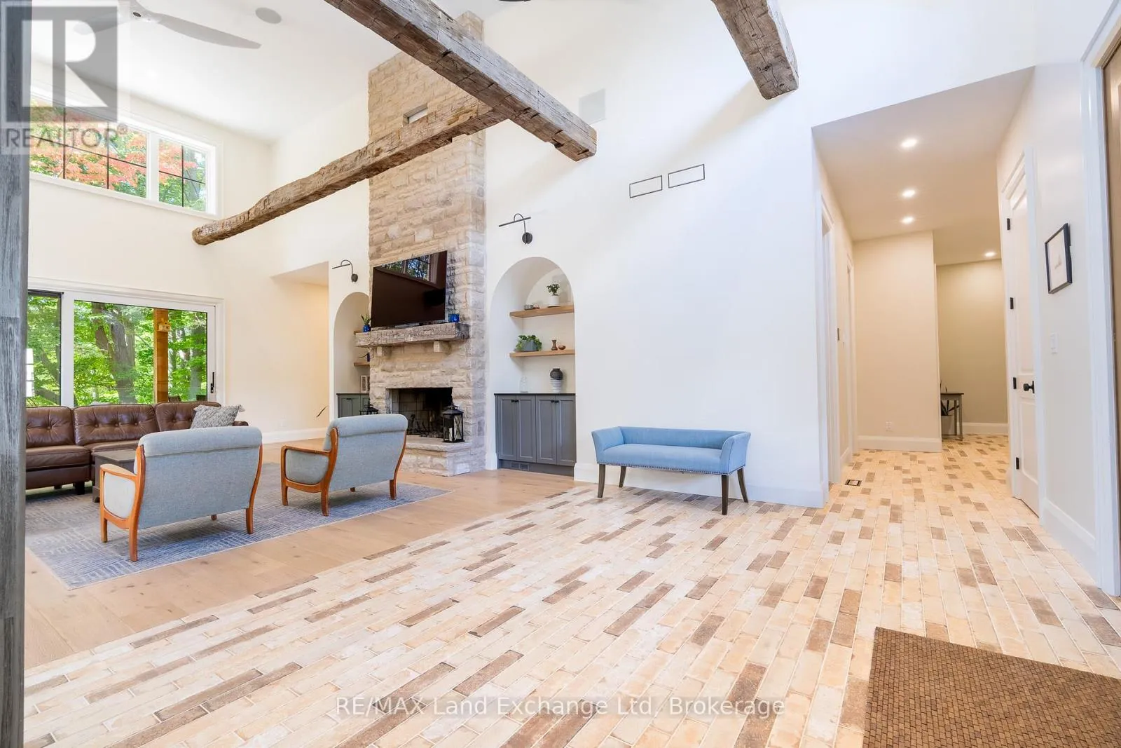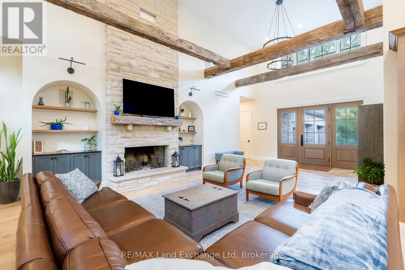 Cross Streets: Wall rd and Four Mile Creek Rd. ** Directions: From down-town NOTL, Head East on RR 87, Turn Left on Four-Mile-Creak rd. Property is on right (across from Enns Battery & Tire). Welcome home to this gorgeous 5 bedroom, 4 bath, New Build. Tucked away and hidden from the road, situated just 2 minutes from the beaches of Lake Ontario and Historic NOTL. Feels like you're living in a Hallmark movie! 18 ft ceilings welcome you into the front entrance with a floor-to-ceiling custom stone wood-burning fireplace, inviting you in to sit back and relax. A seamless flow from the expansive open concept main living room, kitchen and dining room, accented brilliantly by 6 authentic Niagara barn beams and an abundance of windows all around. Enjoy your morning coffee, looking out toward your own enchanting private forest, as you walk out onto your back patio (with heated floors), through the 12 ft kitchen patio doors. Comfort and elegance are all wrapped up in every detail of over 5500 sq ft of living space in this custom home. The spacious primary bedroom boasts a stunning 6 piece en-suite with shower for two, a bathtub + 2 sinks, a spacious walk-in closet, and 10 ft doors leading to your walk-out patio and private hot tub. In-floor heating throughout every room, basement, front & back porch. 3 Car garage, (with one drive through bay), wired-in for EV hookup. Finely detailed kitchen with stainless steel appliances, customized oak drawers and cabinets with quartz counters leading into a private butler's pantry complete with its own sink, dishwasher & high-quality oven. Main Floor Laundry, office and 2 piece powder room. This home was built with ICF foundation and walls for ideal temperature control. Above garage features 2 bedrooms with a shared 4 piece bathroom, and an open sitting/music room. The lower level with 2100 sq ft, includes a large rec room, 2 bedrooms, a 3 piece bath and the mechanical room. Almost an acre backing on the forest and 4 Mile Creek. The Perfect Location. This is a rare find, in the heart of Niagara wine country. The perfect layout for large family gatherings or a cozy night in with the kids. Completely custom. No detail spared. (id:27476)