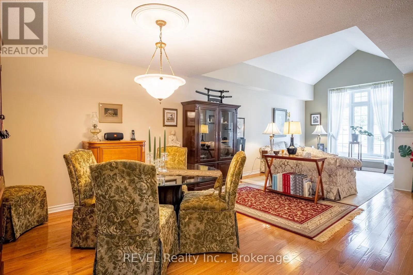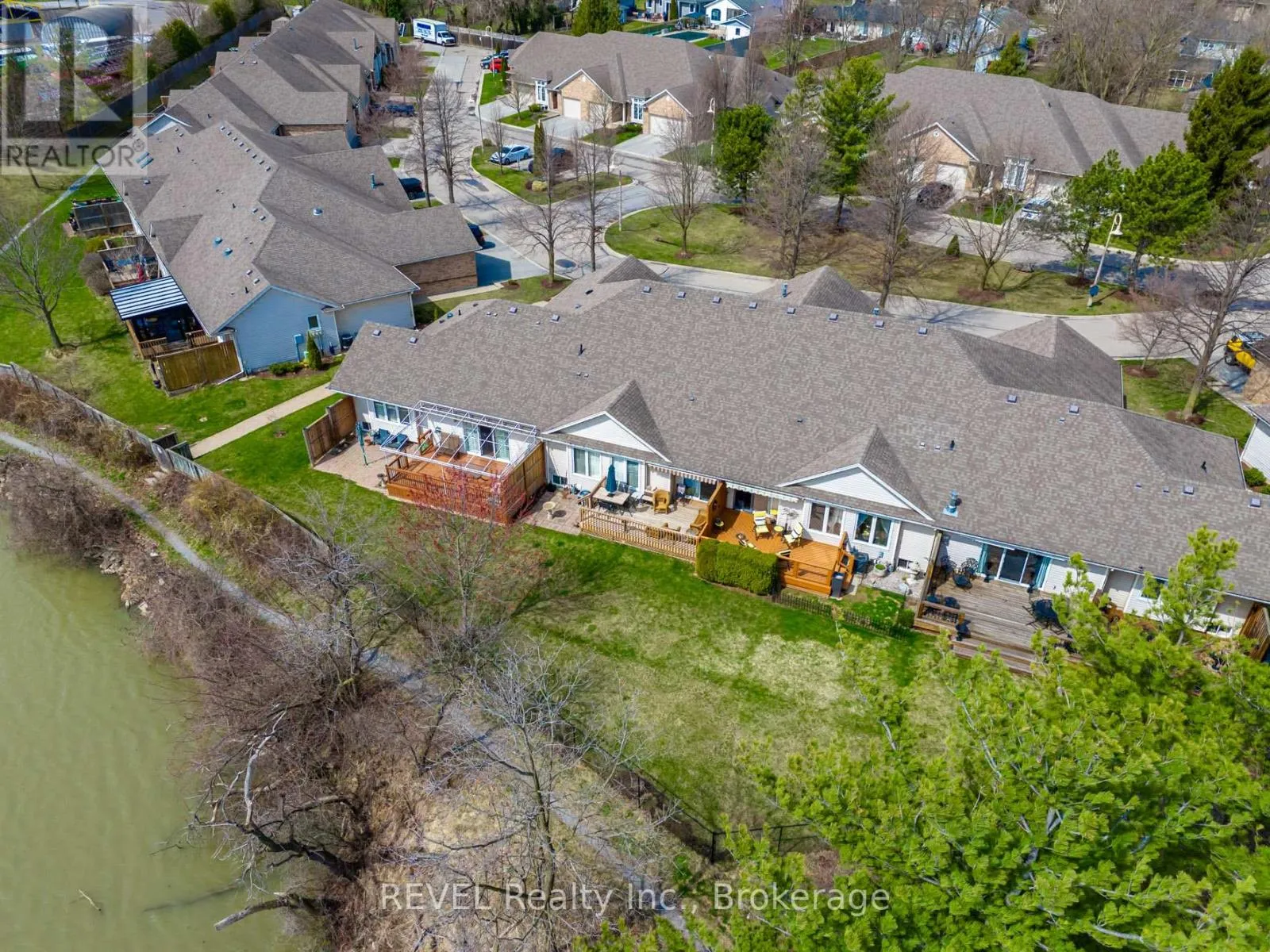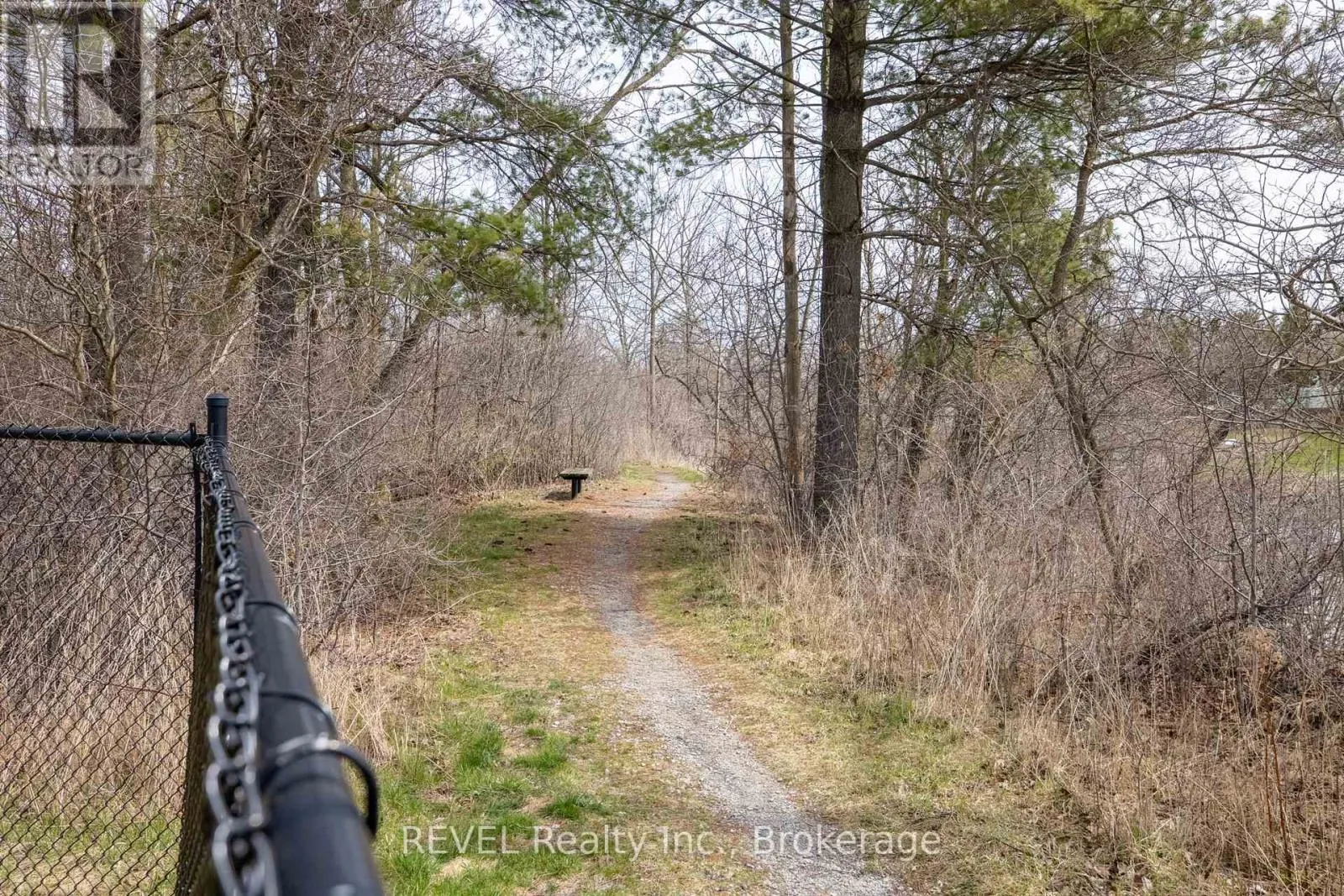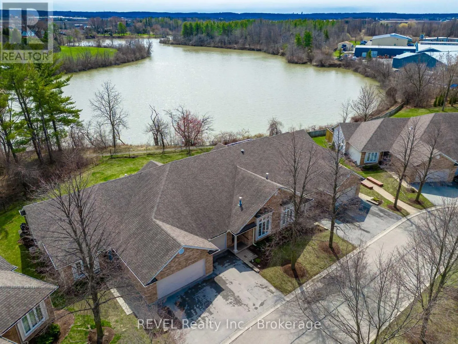 Cross Streets: Creek Road. ** Directions: Niagara Stone Rd (Hwy 55). Welcome to this meticulously cared-for brick bungalow in Glen Brooke Estates, offering 1,360 sq ft of elegant main floor living in the heart of Niagara-on-the-Lake. The main level features a bright and spacious living room with cathedral ceilings and a cozy gas fireplace, a separate formal dining room, and a generous kitchen with Corian countertops, built-in dishwasher, and a charming dinette. Sliding doors lead from the dinette to a 20 x 12 wood deck, perfect for relaxing or entertaining. The primary bedroom boasts a walk-in closet and a private 4-piece ensuite. A second bedroom has been thoughtfully converted into a versatile den, study, or home office. There is also a convenient 2-piece bathroom off the dining room and main-floor laundry just off the kitchen. Direct access to the attached single-car garage adds ease and convenience. The finished lower level offers a large family room, a spacious guest bedroom, a 3-piece bathroom, and a substantial utility room with a new high-efficiency Lennox furnace and A/C. Additional features include a dedicated workshop, and storage area. Backing onto city-owned green space and a peaceful municipal reservoir fed by Four Mile Creek, this home combines natural beauty with low-maintenance living. Condo fees cover all exterior maintenance, lawn care, snow removal, building insurance, water costs, Bell Fibe Internet & TV. This well-maintained one-story townhome complex is highly sought-after in the vibrant community of Virgil. (id:27476)