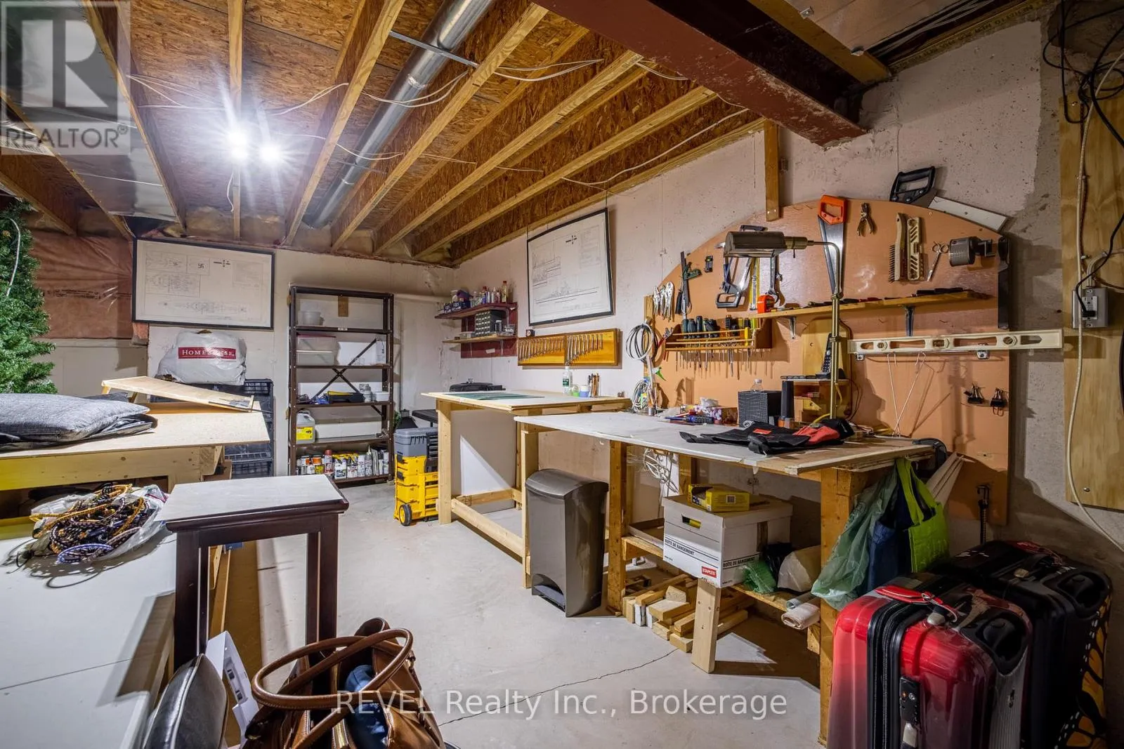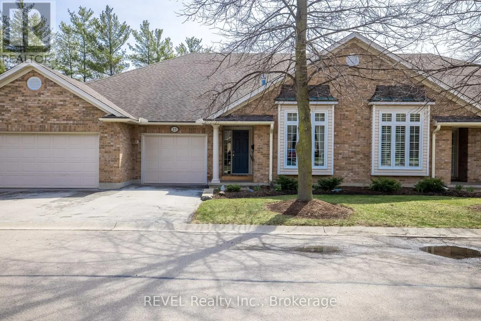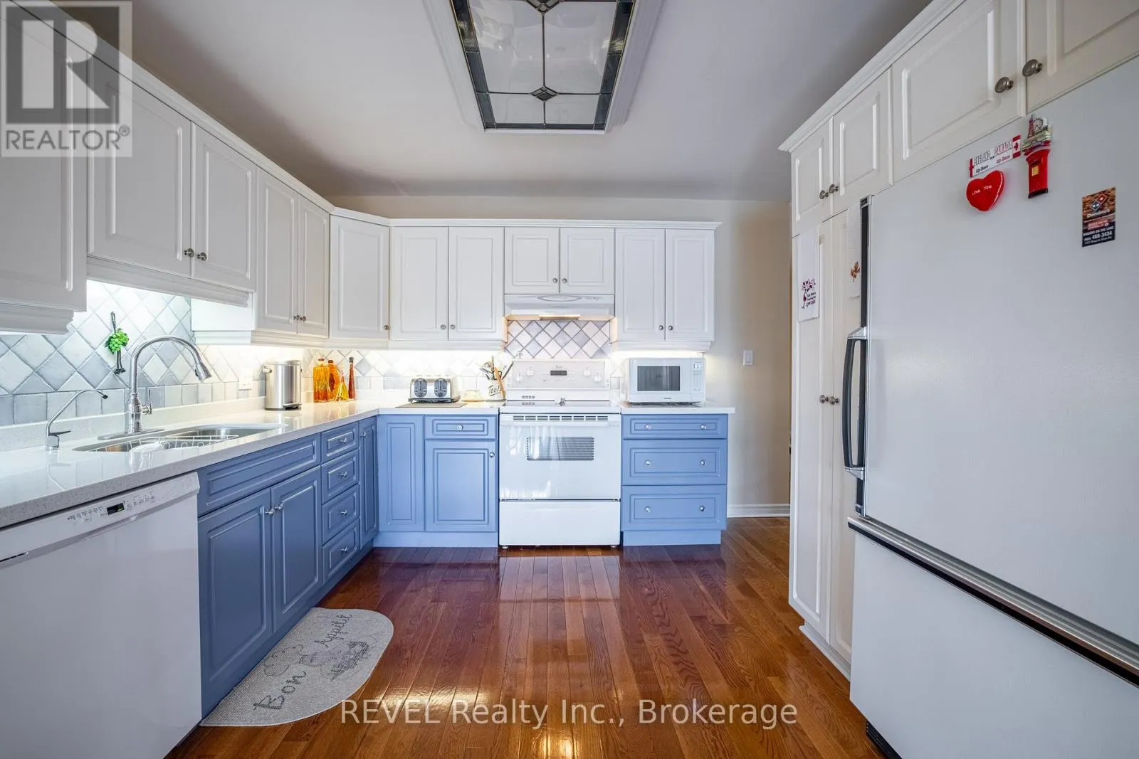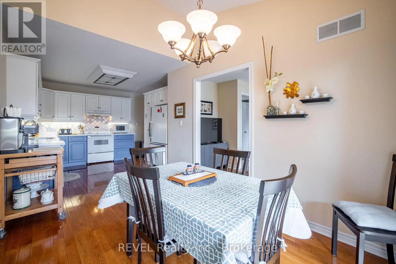 Cross Streets: Creek Road. ** Directions: Niagara Stone Rd (Hwy 55). Welcome to this meticulously cared-for brick bungalow in Glen Brooke Estates, offering 1,360 sq ft of elegant main floor living in the heart of Niagara-on-the-Lake. The main level features a bright and spacious living room with cathedral ceilings and a cozy gas fireplace, a separate formal dining room, and a generous kitchen with Corian countertops, built-in dishwasher, and a charming dinette. Sliding doors lead from the dinette to a 20 x 12 wood deck, perfect for relaxing or entertaining. The primary bedroom boasts a walk-in closet and a private 4-piece ensuite. A second bedroom has been thoughtfully converted into a versatile den, study, or home office. There is also a convenient 2-piece bathroom off the dining room and main-floor laundry just off the kitchen. Direct access to the attached single-car garage adds ease and convenience. The finished lower level offers a large family room, a spacious guest bedroom, a 3-piece bathroom, and a substantial utility room with a new high-efficiency Lennox furnace and A/C. Additional features include a dedicated workshop, and storage area. Backing onto city-owned green space and a peaceful municipal reservoir fed by Four Mile Creek, this home combines natural beauty with low-maintenance living. Condo fees cover all exterior maintenance, lawn care, snow removal, building insurance, water costs, Bell Fibe Internet & TV. This well-maintained one-story townhome complex is highly sought-after in the vibrant community of Virgil. (id:27476)