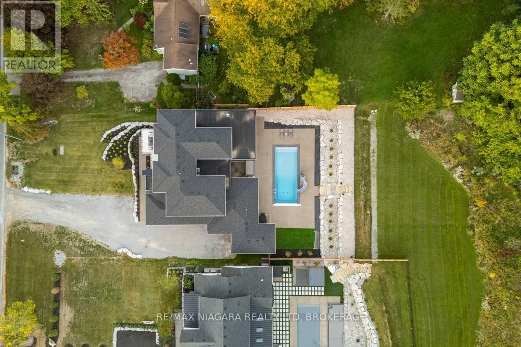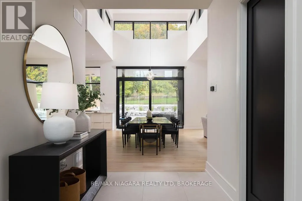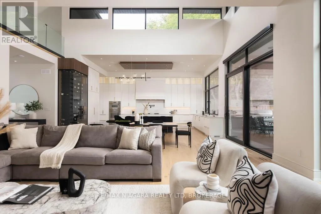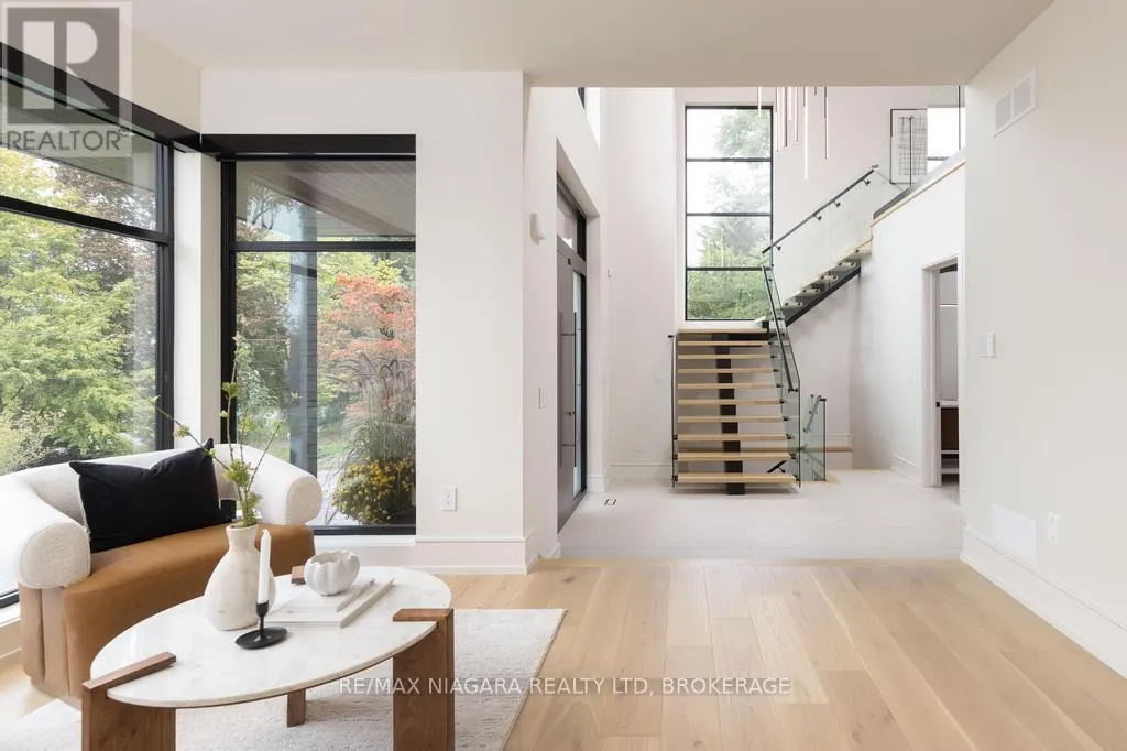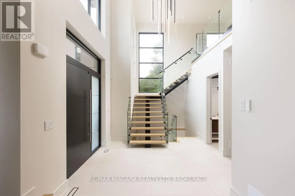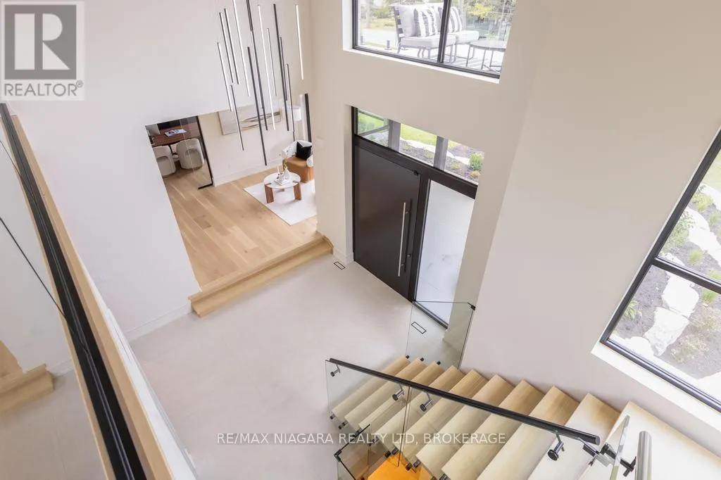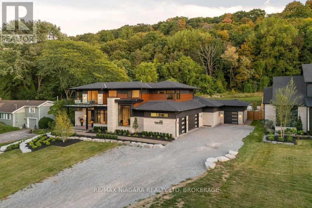 NIAGARA PARKWAY/QUEENSTON. Nestled in the heart of Niagara-on-the-Lake, 2005 York Road is a one-of-a-kind, Portofino-inspired bungaloft offering over 7,500 square feet of luxurious living space. This exquisite residence features oversized garages, 4 bedrooms, 4 bathrooms, and the utmost privacy, backing onto the protected greenspace of the Niagara Escarpment. Seamlessly blending timeless European elegance with contemporary design and cutting-edge smart home technology, the home's open-concept layout showcases soaring ceilings, an expansive European Luxury Aluminum Window System with Premium Reynaer Window System by VIIU, and exceptional craftsmanship throughout. The chef's kitchen serves as the true centrepiece, boasting Thermador appliances, an oversized island, quartz countertops, and custom cabinetry designed for both function and style. The main-floor primary suite occupies its own private wing, offering a serene retreat complete with a spa-inspired ensuite featuring a steam shower, heated floors, and direct access to the backyard. A striking mono-stringer staircase with glass railings leads to the upper loft, which features 2 additional bedrooms, a flex space, a bathroom, a secondary laundry area, and an outdoor balcony with sweeping views of the surrounding landscape. The lower level provides a full walkout to the backyard, expanding the living and future theatre room. Every detail has been meticulously curated, from in-floor heated bathrooms, power shades, a Generac backup generator and a flat roof featuring heat tracers. The professionally landscaped grounds create a private resort-like oasis, complete with an inground pool, hot tub, covered patio with an outdoor kitchen and outdoor gas fireplace. Designed with both comfort and sophistication in mind, this remarkable residence embodies the pinnacle of modern luxury living in one of Niagara-on-the-Lake's most sought-after locations. Luxury Certified. (id:27476)