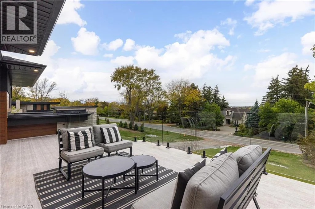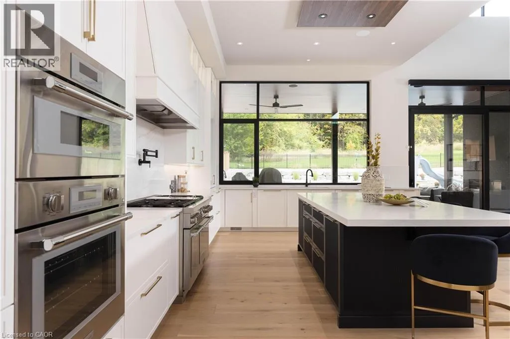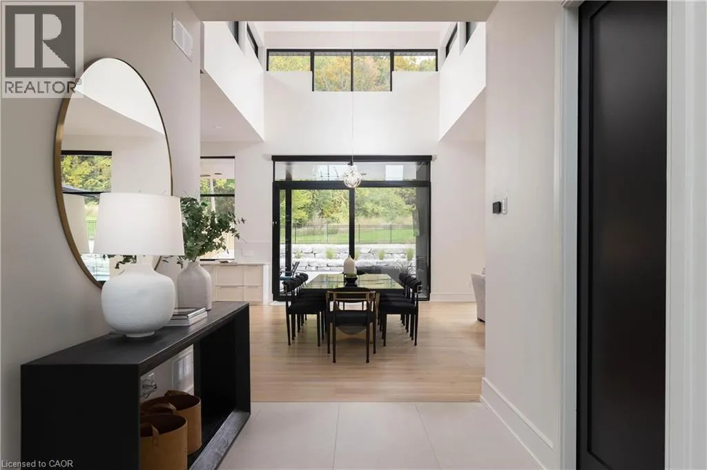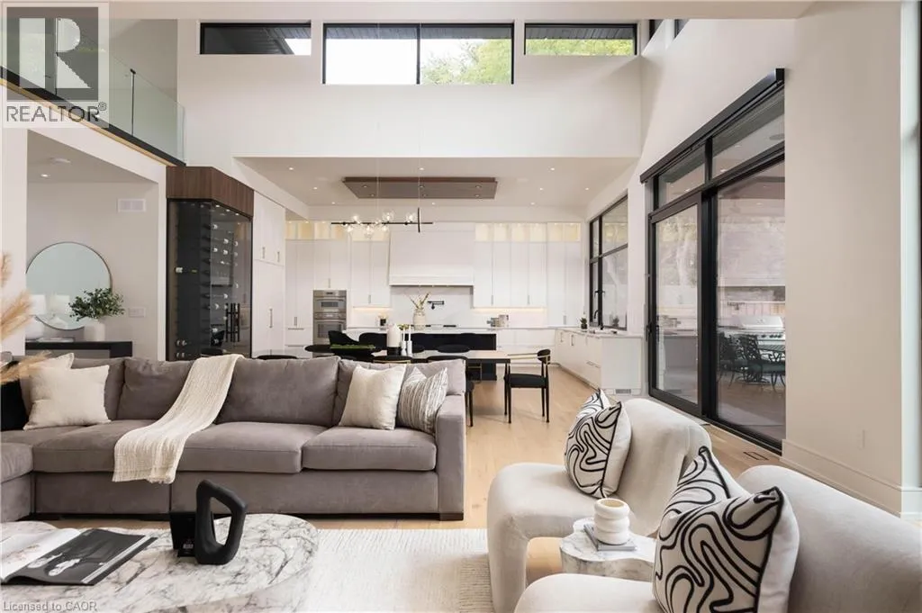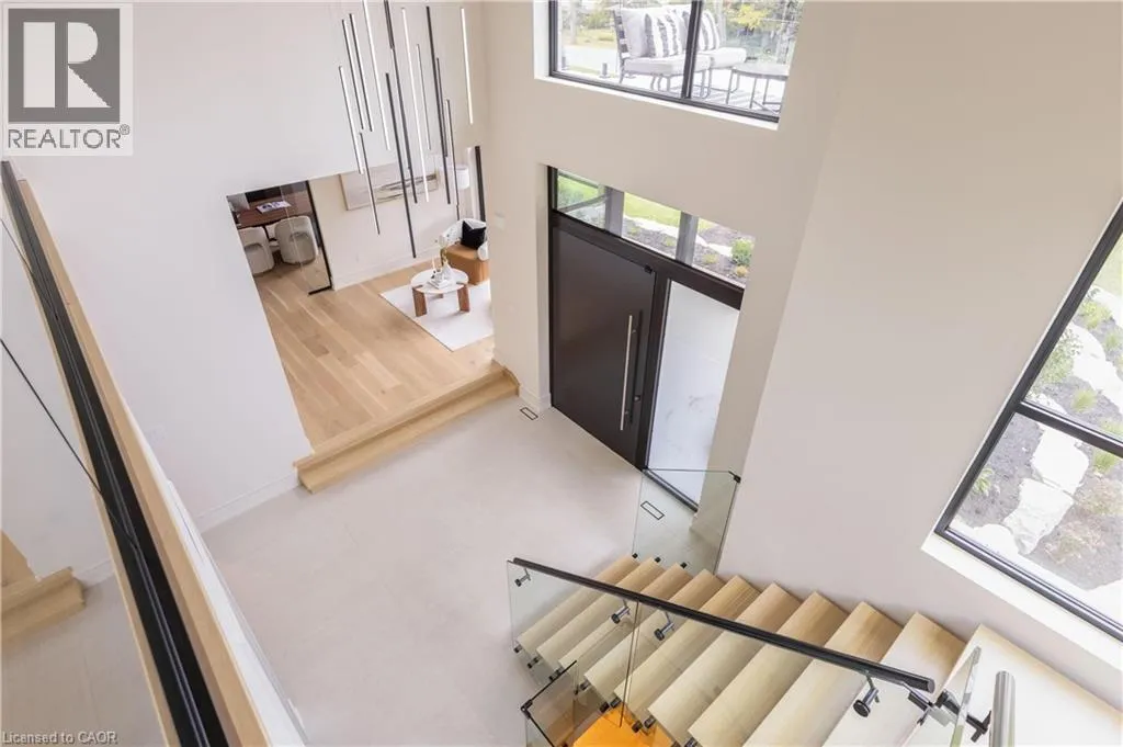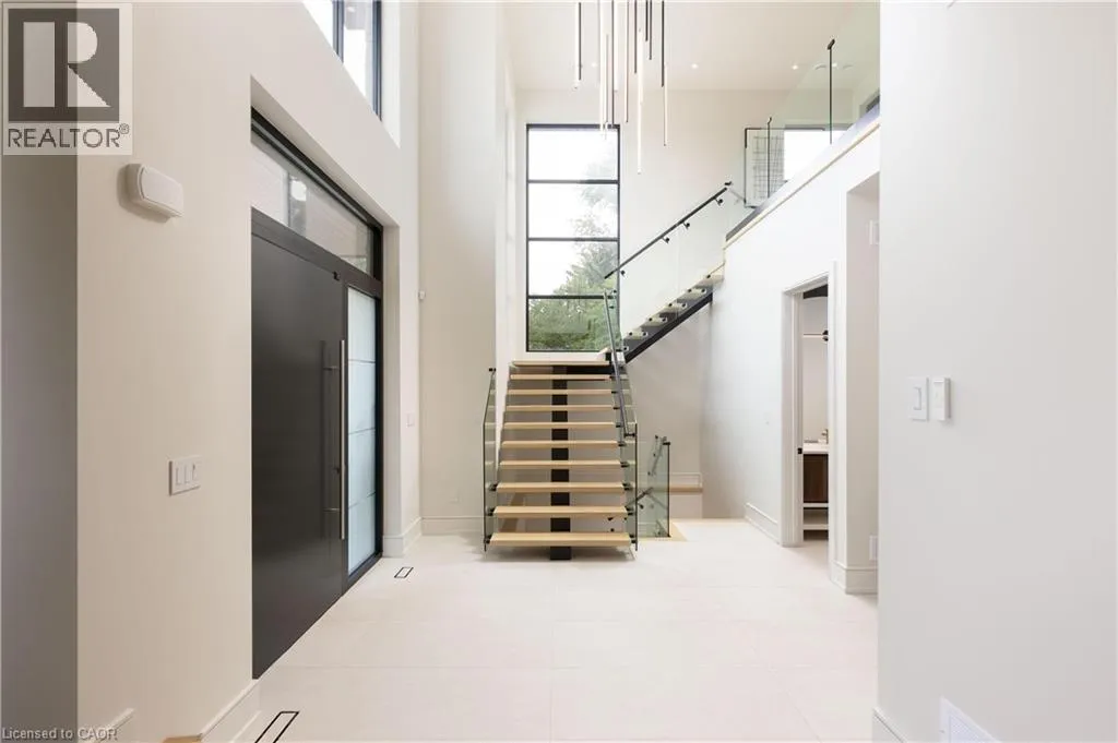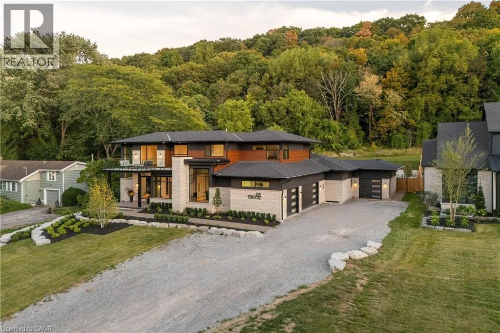 NIAGARA PARKWAY/QUEENSTON Nestled in the heart of Niagara-on-the-Lake, 2005 York Road is a one-of-a-kind, Portofino-inspired bungaloft offering over 7,500 square feet of luxurious living space. This exquisite residence features oversized garages, 4 bedrooms, 4 bathrooms, and the utmost privacy, backing onto the protected greenspace of the Niagara Escarpment. Seamlessly blending timeless European elegance with contemporary design and cutting-edge smart home technology, the home's open-concept layout showcases soaring ceilings, an expansive European Luxury Aluminum Window System with Premium Reynaer Window System by VIIU, and exceptional craftsmanship throughout. The chef's kitchen serves as the true centrepiece, boasting Thermador appliances, an oversized island, quartz countertops, and custom cabinetry designed for both function and style. The main-floor primary suite occupies its own private wing, offering a serene retreat complete with a spa-inspired ensuite featuring a steam shower, heated floors, and direct access to the backyard. A striking mono-stringer staircase with glass railings leads to the upper loft, which features 2 additional bedrooms, a flex space, a bathroom, a secondary laundry area, and an outdoor balcony with sweeping views of the surrounding landscape. The lower level provides a full walkout to the backyard, expanding the living and future theatre room. Every detail has been meticulously curated, from in-floor heated bathrooms, power shades, a Generac backup generator and a flat roof featuring heat tracers. The professionally landscaped grounds create a private resort-like oasis, complete with an inground pool, hot tub, covered patio with an outdoor kitchen and outdoor gas fireplace. Designed with both comfort and sophistication in mind, this remarkable residence embodies the pinnacle of modern luxury living in one of Niagara-on-the-Lake's most sought-after locations. (id:27476)