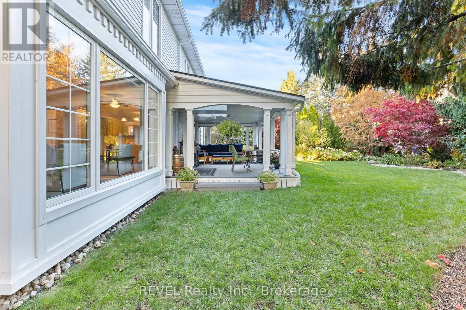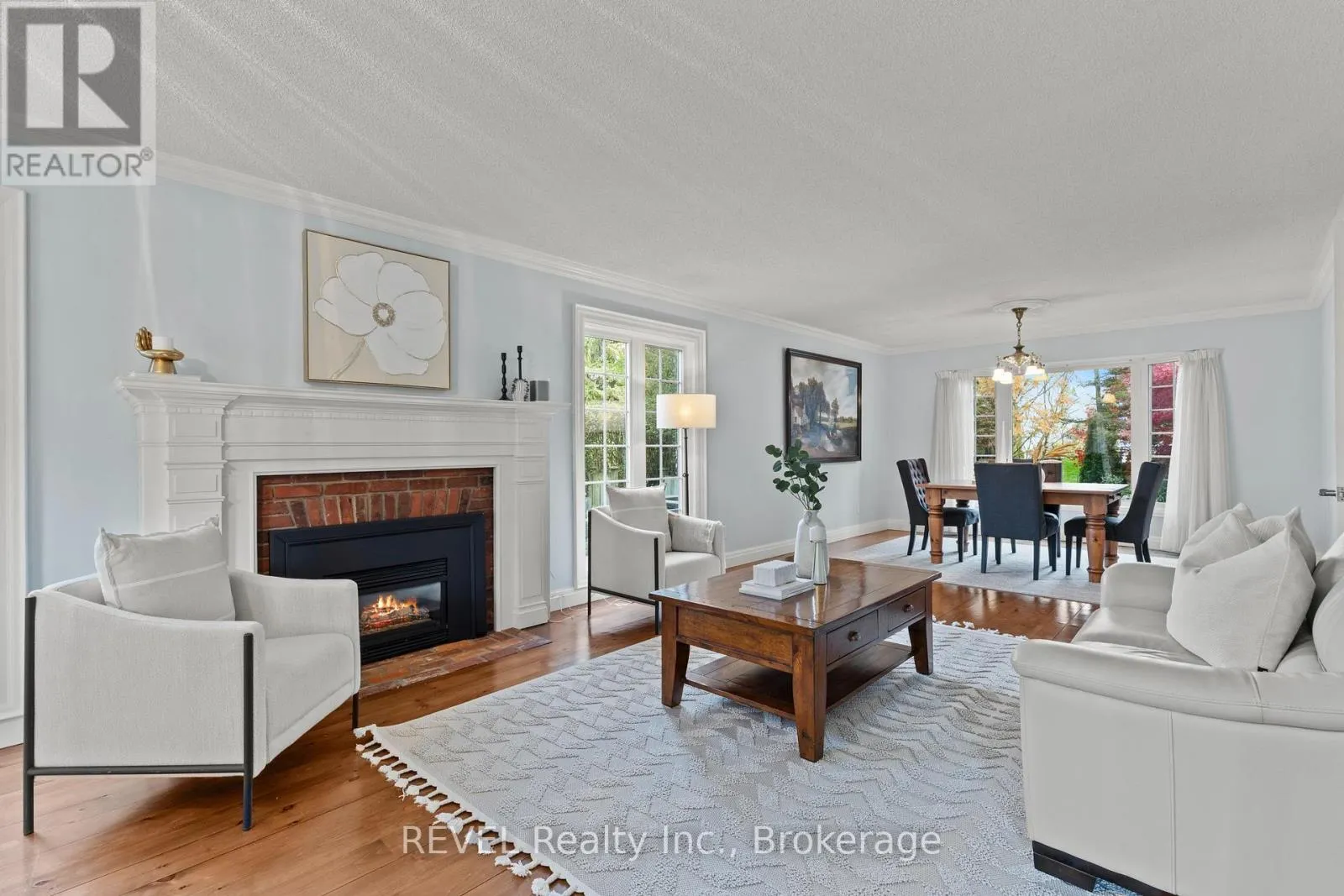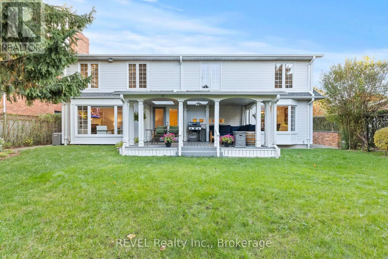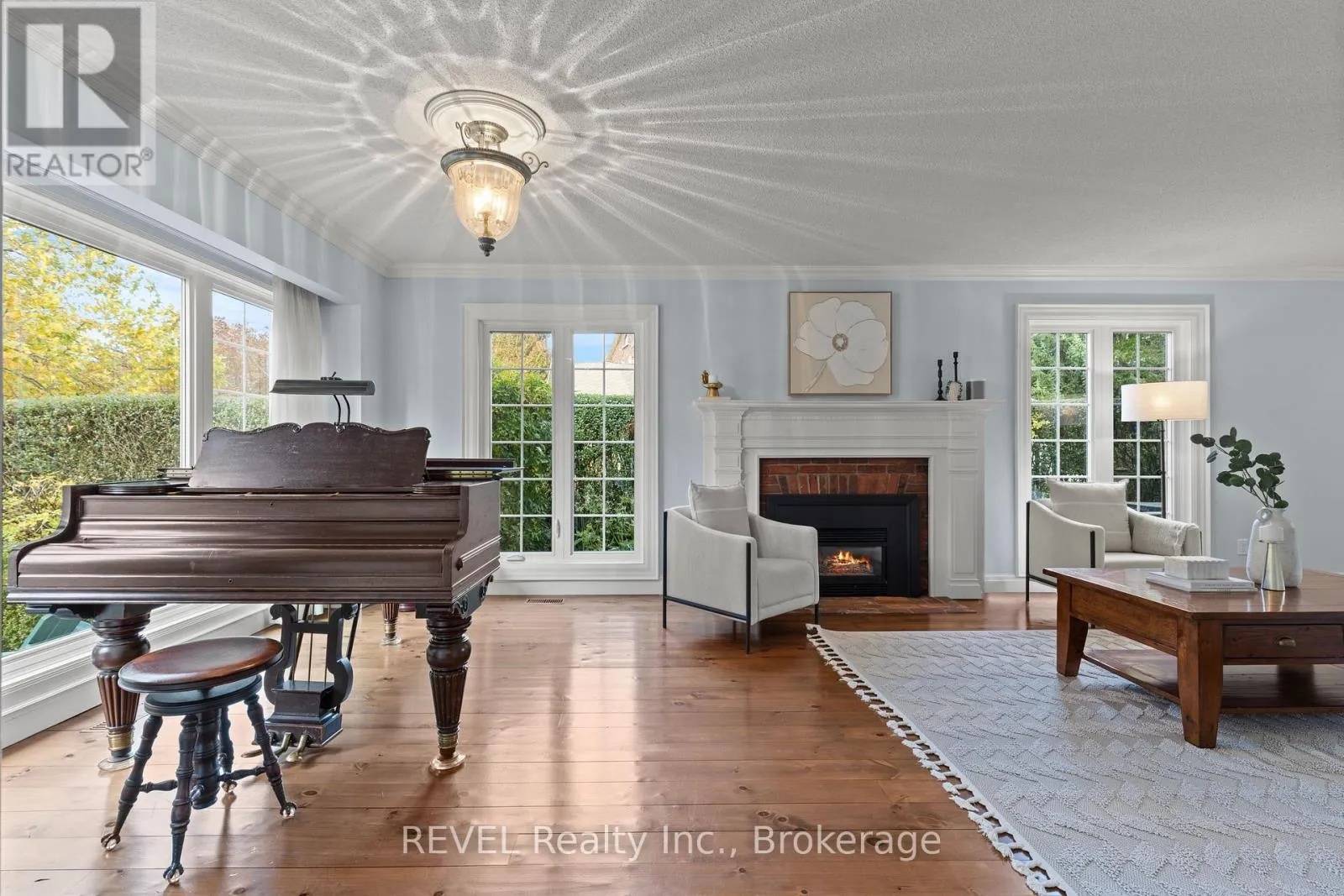 Cross Streets: Garrison Village Drive. ** Directions: Garrison Village Dr to Lower Canada Dr to Confederation Dr. Gracefully situated in the prestigious community of Garrison Village, 36 Confederation Drive offers a rare opportunity to own a refined residence where timeless architectural charm meets modern sophistication. This exceptional 4-bedroom, 3-bathroom home welcomes you with beautifully proportioned, light-filled living spaces and an inviting sense of warmth throughout.The main level features elegant wide plank flooring, a stately living room with gas fireplace, a formal dining area ideal for entertaining, and a private den perfect for work or relaxation. The open-concept kitchen and family room overlook the manicured backyard and provide seamless access to a covered deck-an ideal setting for outdoor living.Upstairs, four spacious bedrooms offer comfort and versatility, highlighted by a serene primary suite with a cozy wood-burning fireplace, walk-in closet, private ensuite, and tranquil treetop views. A convenient upper-level laundry room adds to everyday ease. The lower level extends the living space with a walk-up to the backyard and a wine cellar, a subtle nod to Niagara-on-the-Lake's celebrated wine country lifestyle. Surrounded by mature landscaping, this home offers an exceptional blend of elegance, functionality, and serenity in one of the area's most sought-after neighbourhoods. (id:27476)