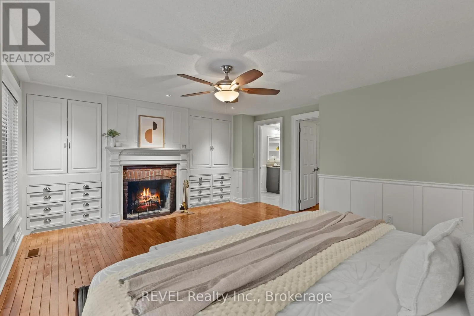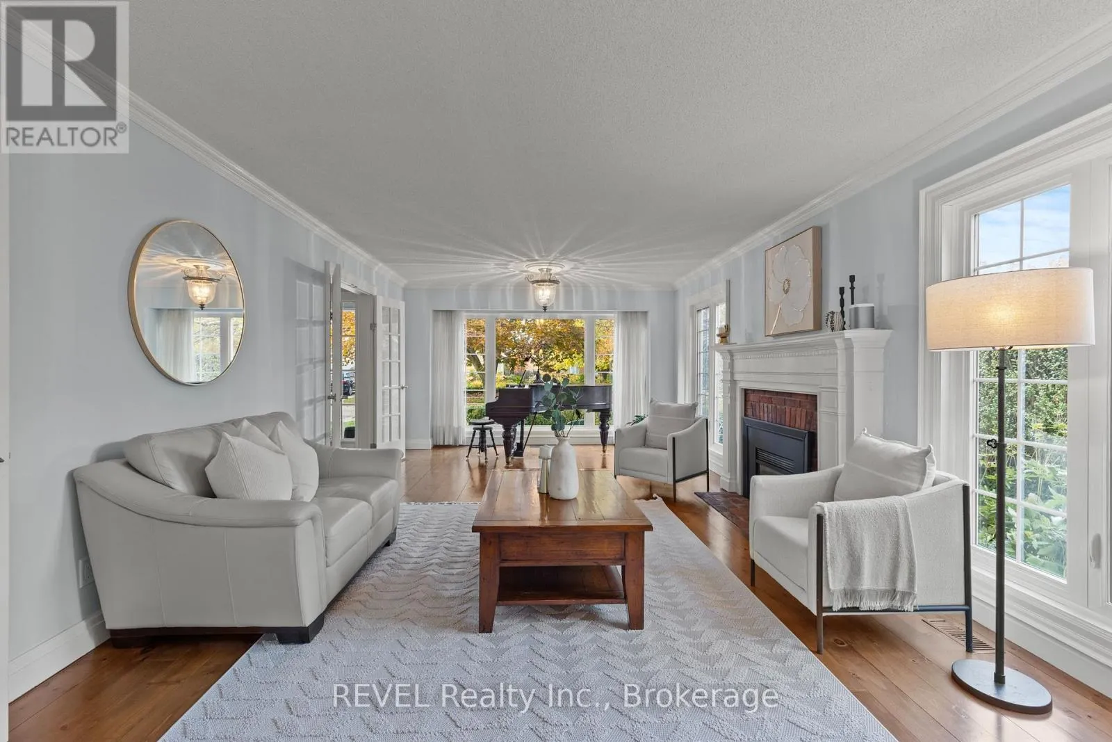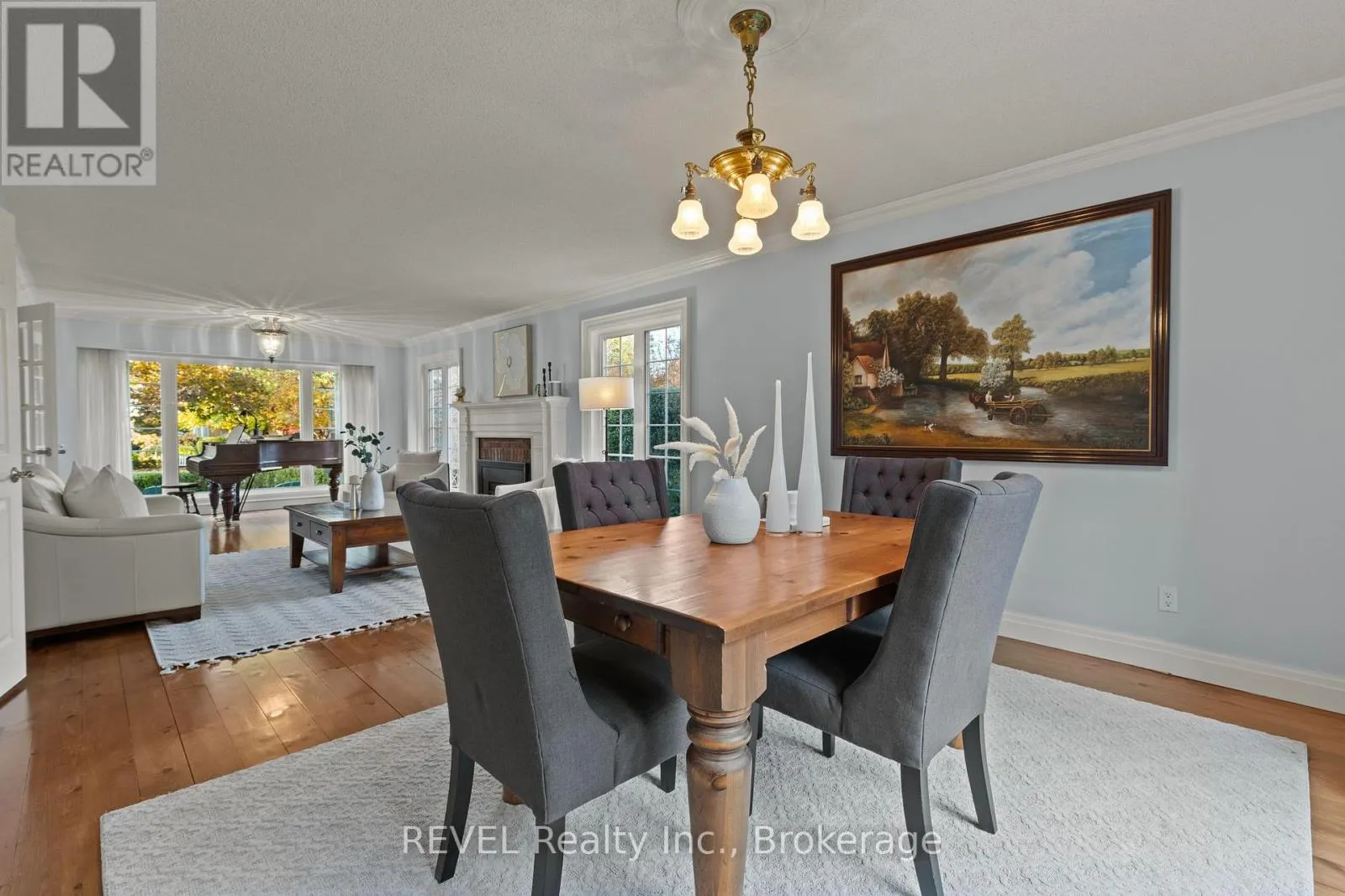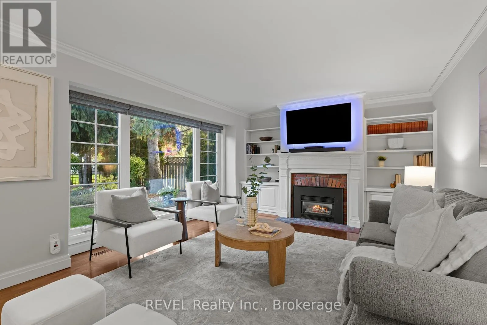 Cross Streets: Garrison Village Drive. ** Directions: Garrison Village Dr to Lower Canada Dr to Confederation Dr. Gracefully situated in the prestigious community of Garrison Village, 36 Confederation Drive offers a rare opportunity to own a refined residence where timeless architectural charm meets modern sophistication. This exceptional 4-bedroom, 3-bathroom home welcomes you with beautifully proportioned, light-filled living spaces and an inviting sense of warmth throughout.The main level features elegant wide plank flooring, a stately living room with gas fireplace, a formal dining area ideal for entertaining, and a private den perfect for work or relaxation. The open-concept kitchen and family room overlook the manicured backyard and provide seamless access to a covered deck-an ideal setting for outdoor living.Upstairs, four spacious bedrooms offer comfort and versatility, highlighted by a serene primary suite with a cozy wood-burning fireplace, walk-in closet, private ensuite, and tranquil treetop views. A convenient upper-level laundry room adds to everyday ease. The lower level extends the living space with a walk-up to the backyard and a wine cellar, a subtle nod to Niagara-on-the-Lake's celebrated wine country lifestyle. Surrounded by mature landscaping, this home offers an exceptional blend of elegance, functionality, and serenity in one of the area's most sought-after neighbourhoods. (id:27476)