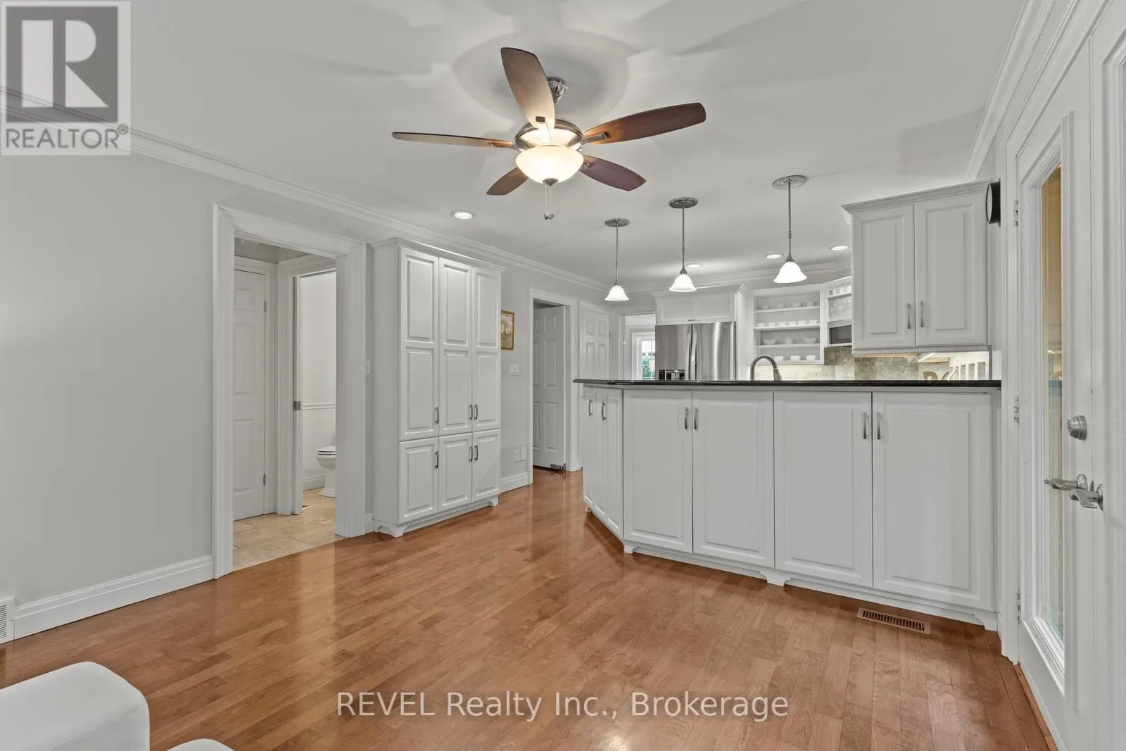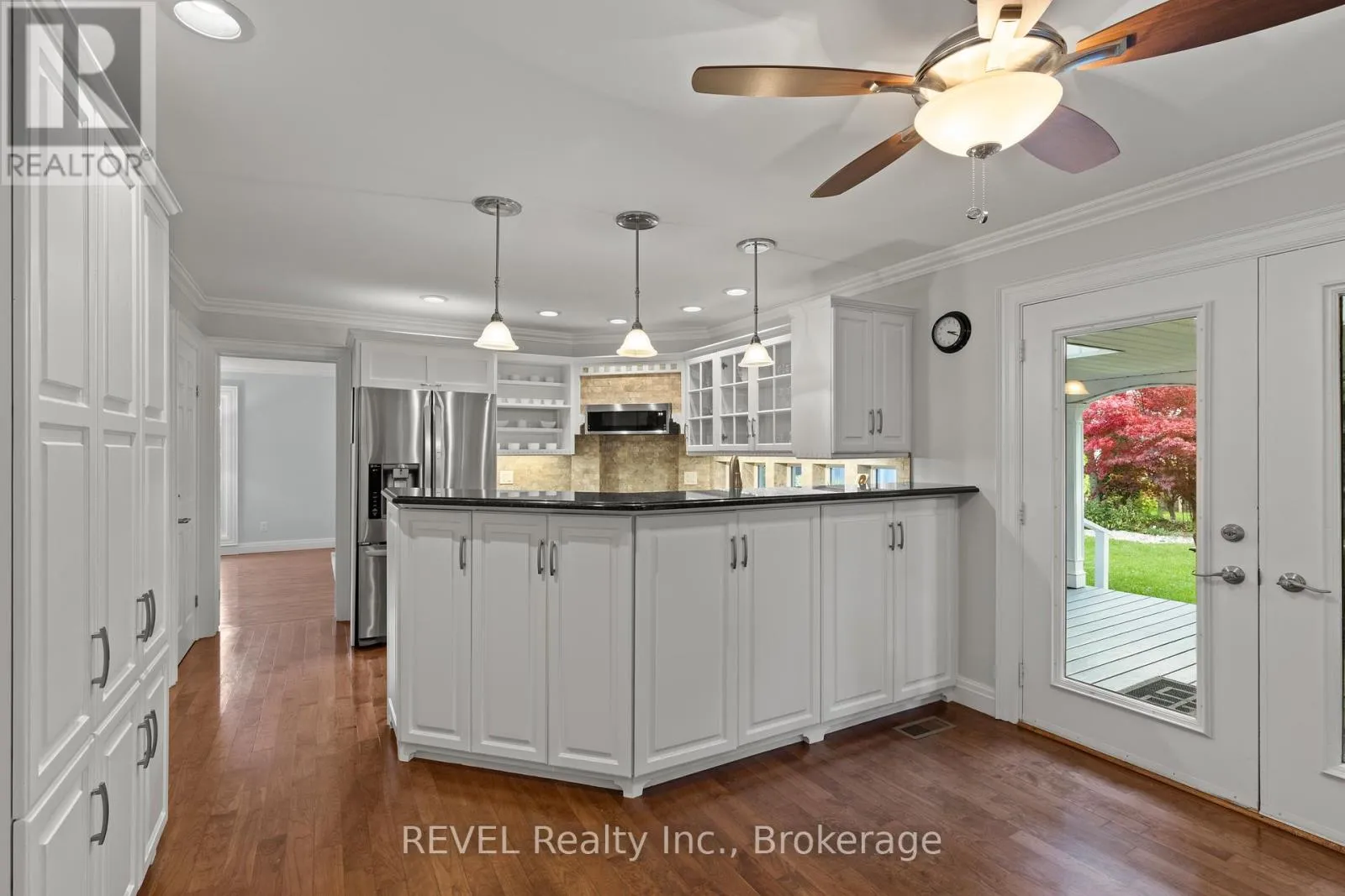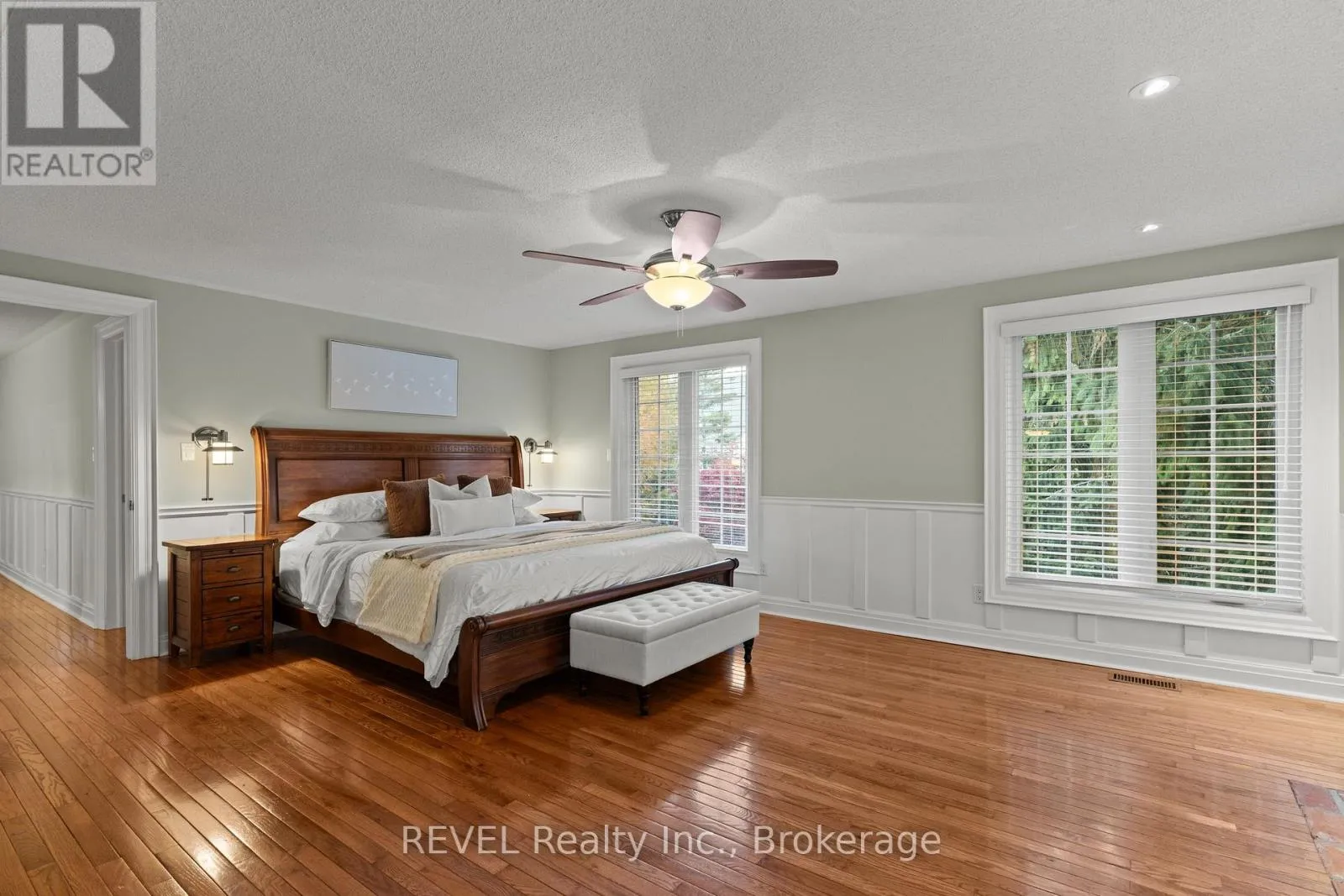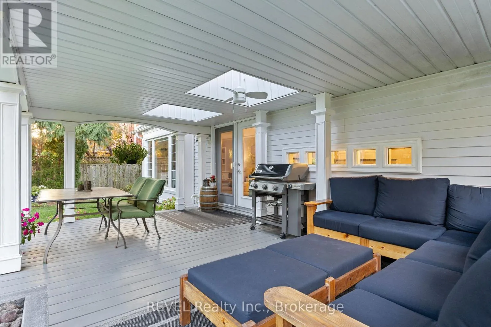 Cross Streets: Garrison Village Drive. ** Directions: Garrison Village Dr to Lower Canada Dr to Confederation Dr. Gracefully situated in the prestigious community of Garrison Village, 36 Confederation Drive offers a rare opportunity to own a refined residence where timeless architectural charm meets modern sophistication. This exceptional 4-bedroom, 3-bathroom home welcomes you with beautifully proportioned, light-filled living spaces and an inviting sense of warmth throughout.The main level features elegant wide plank flooring, a stately living room with gas fireplace, a formal dining area ideal for entertaining, and a private den perfect for work or relaxation. The open-concept kitchen and family room overlook the manicured backyard and provide seamless access to a covered deck-an ideal setting for outdoor living.Upstairs, four spacious bedrooms offer comfort and versatility, highlighted by a serene primary suite with a cozy wood-burning fireplace, walk-in closet, private ensuite, and tranquil treetop views. A convenient upper-level laundry room adds to everyday ease. The lower level extends the living space with a walk-up to the backyard and a wine cellar, a subtle nod to Niagara-on-the-Lake's celebrated wine country lifestyle. Surrounded by mature landscaping, this home offers an exceptional blend of elegance, functionality, and serenity in one of the area's most sought-after neighbourhoods. (id:27476)