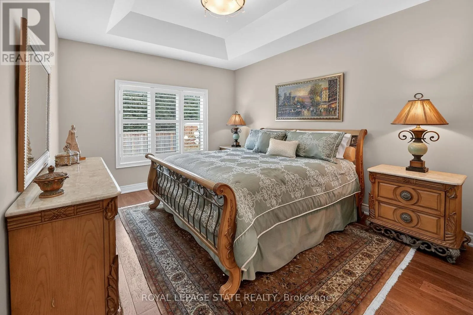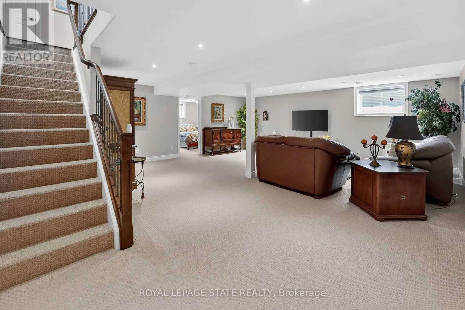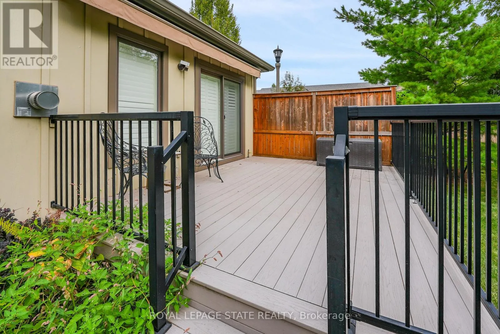 Cross Streets: York & Tanbark. ** Directions: York Road, South on Tanbark, East on Pinecroft. Stunning St. Davids Bungalow Townhome: Unrivaled Privacy & Master CraftsmanshipExperience maintenance-free luxury in this executive end-unit bungalow townhome, perfectly situated in the prestigious St. Davids community. From the moment you arrive, the stone exterior, interlock double drive, and professional landscaping set a sophisticated tone. The interior reveals over 2,200 sq. ft. of refined living space defined by cove ceilings, low-sheen hardwood, and California shutters. The chef-inspired kitchen features premium solid-surface counters, an expansive breakfast bar, and an abundance of cabinetry. Bathed in natural light from skylights and vaulted ceilings, the living room offers a cozy gas fireplace-the heart of the home. Retreat to the primary suite featuring a walk-in closet and private ensuite, or host guests in the airy front bedroom with its own vaulted ceilings. The fully finished lower level feels like an extension of the main floor, boasting large windows in every room, a spacious rec room, two additional bedrooms, and a 3-piece bath. Step outside to your private oasis: a large composite deck with an electric awning overlooking a serene, treed view. Low condo fees cover snow and lawn care, ensuring a lifestyle of pure relaxation. (id:27476)