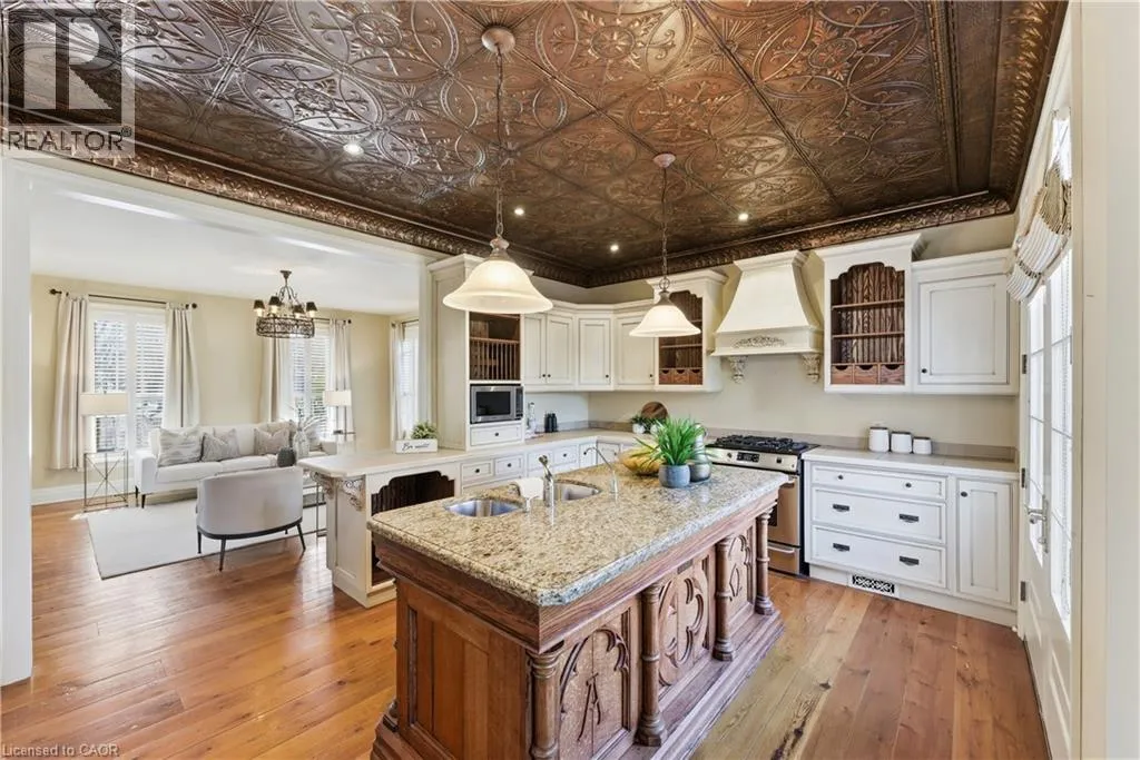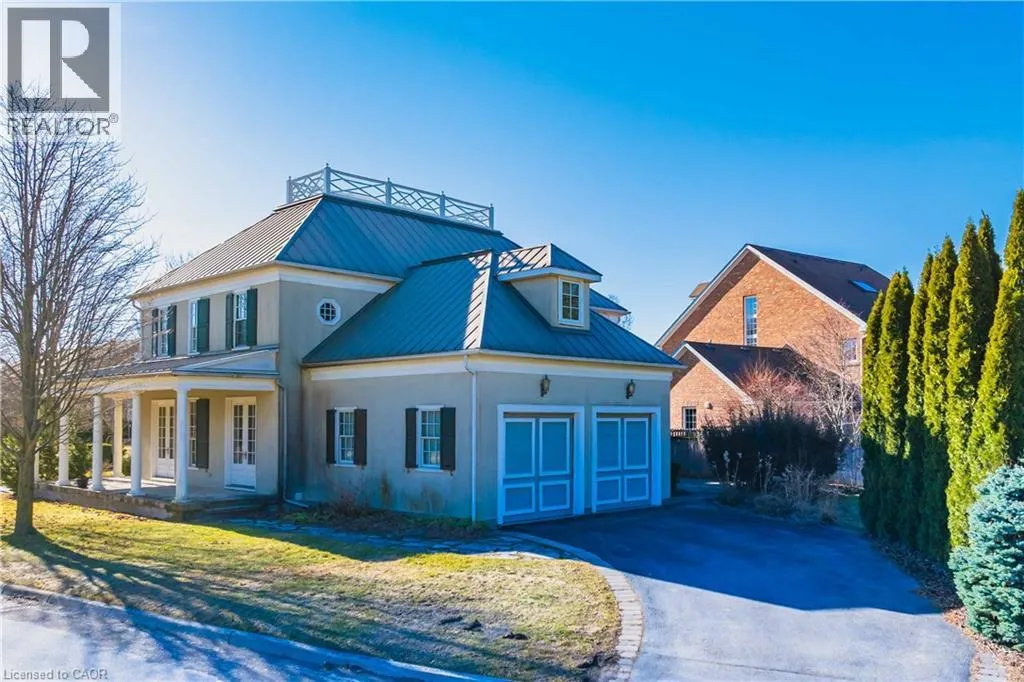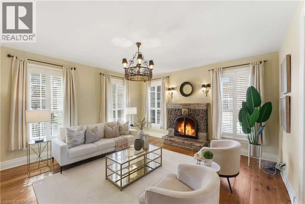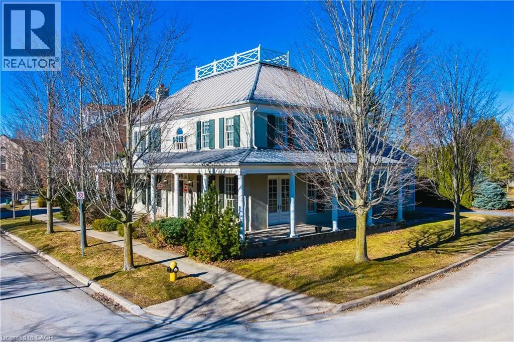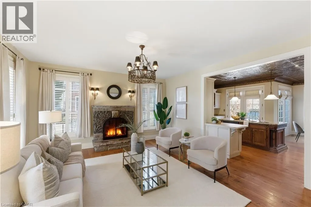 Niagara Stone Rd to Garrison Village Dr Nestled on a quiet street in the heart of Niagara-on-the-Lake, this stunning 4-bedroom, 3-bath residence offers approximately 2,925 sq. ft. of thoughtfully designed living space, blending timeless character with luxurious finishes. A gorgeous stone wraparound porch welcomes you home. Step inside to a grand foyer featuring an extra-wide staircase and elegant wall sconces. The main floor showcases wide-plank hemlock wood flooring, creating warmth and character. The living room is highlighted by a stone wood-burning fireplace and walkout access to the wraparound porch. The large eat-in dining room offers plenty of room for family gatherings and dinner parties, with additional doors leading directly to the porch. At the heart of the home lies the kitchen. A copper ceiling in the kitchen and breakfast nook creates a dramatic focal point. The breakfast area opens directly onto a stone patio and backyard. Completing the main floor is a convenient 2-piece bath and a versatile bonus room-ideal as a home office, craft room, or potential 5th bedroom. Upstairs, you'll find four generously sized bedrooms, offering large windows and ample closet space. The primary suite serves as a private retreat, featuring a spa-inspired 4-piece ensuite complete with a built-in vanity, soaker tub, and stand-up shower. An additional 4-piece bath provides convenience for family and guests. The finished basement expands the living space with a large recreation room anchored by a second stone fireplace. There is also plenty of additional storage space. Outside, the spacious backyard offers endless possibilities for entertaining, play, or relaxation, with abundant garden space for gardening enthusiasts. A double-wide attached garage and ample driveway. Located in an exceptional Niagara-on-the-Lake location, this home combines luxury, character, and tranquility, all while being close to the town's renowned wineries, dining, and charming amenities. (id:27476)