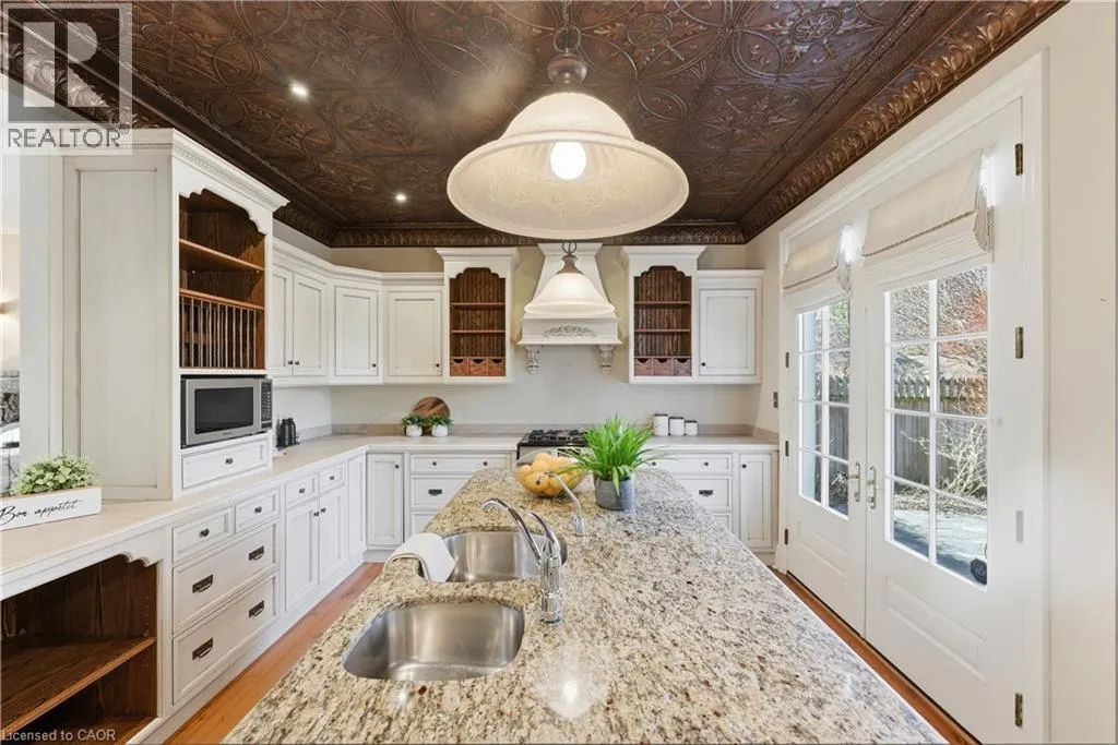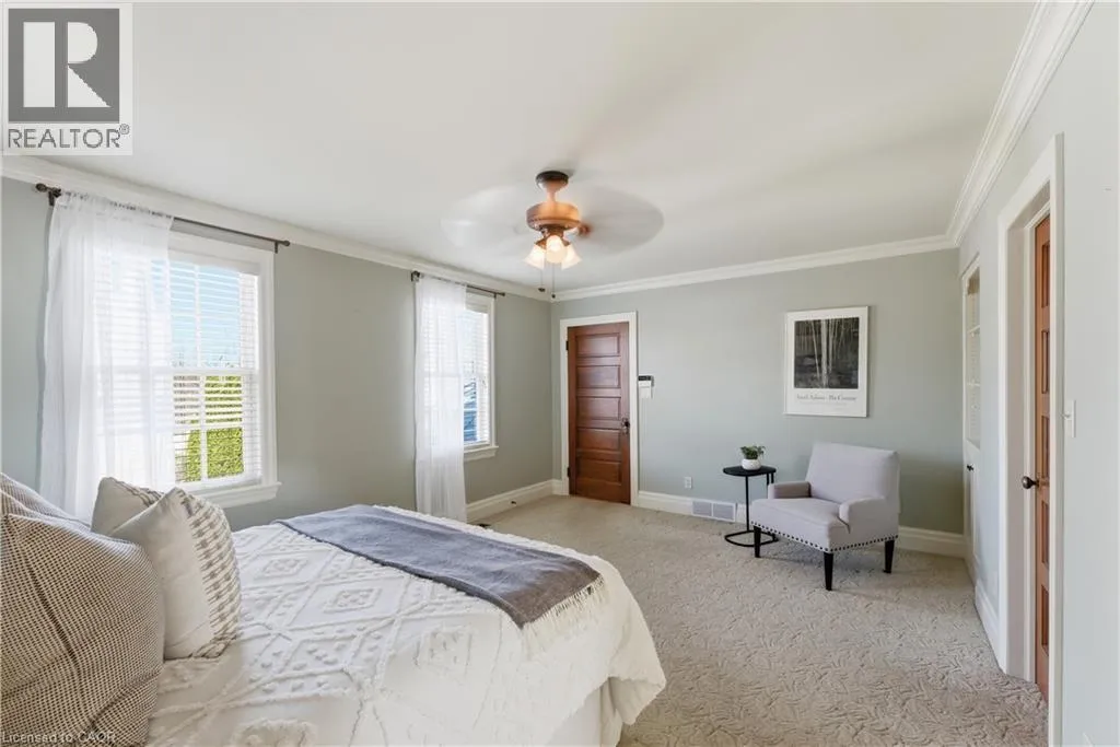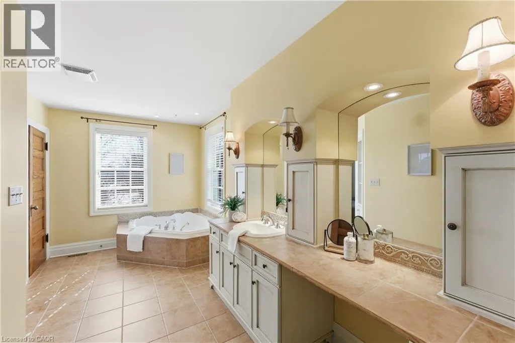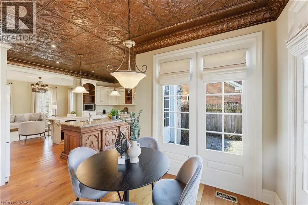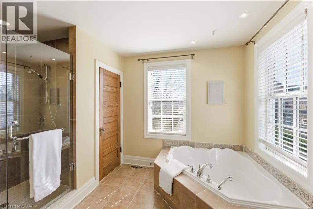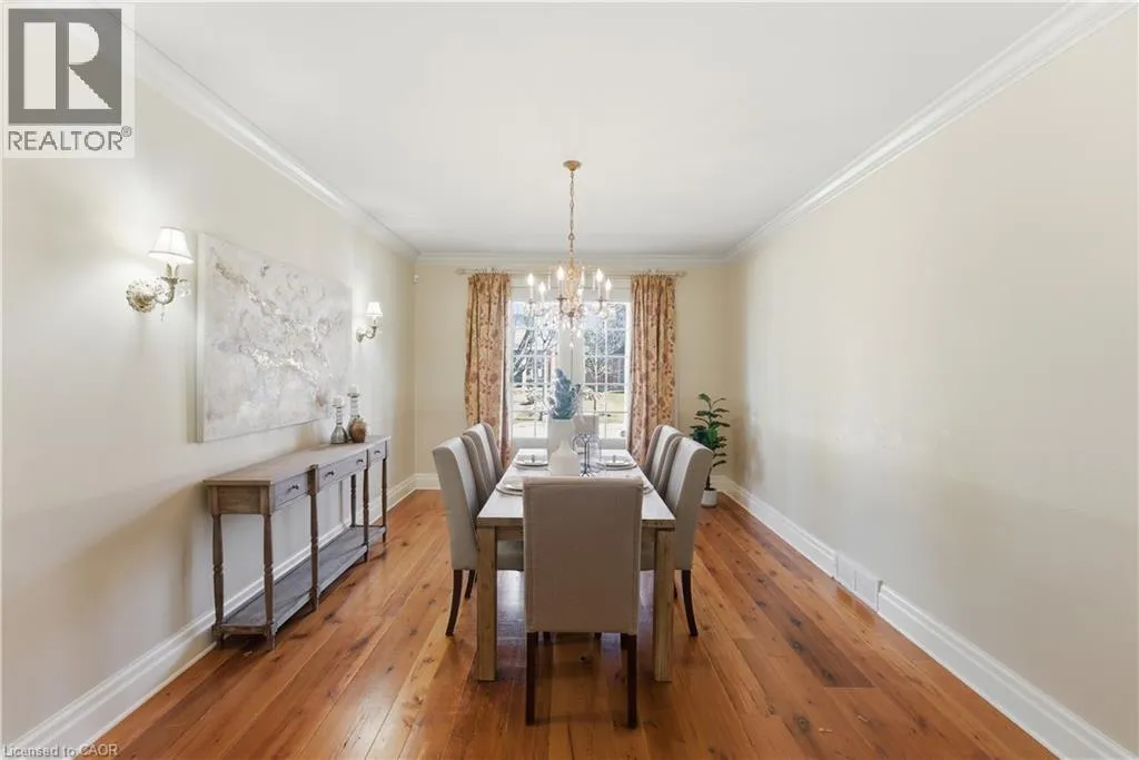 Niagara Stone Rd to Garrison Village Dr Nestled on a quiet street in the heart of Niagara-on-the-Lake, this stunning 4-bedroom, 3-bath residence offers approximately 2,925 sq. ft. of thoughtfully designed living space, blending timeless character with luxurious finishes. A gorgeous stone wraparound porch welcomes you home. Step inside to a grand foyer featuring an extra-wide staircase and elegant wall sconces. The main floor showcases wide-plank hemlock wood flooring, creating warmth and character. The living room is highlighted by a stone wood-burning fireplace and walkout access to the wraparound porch. The large eat-in dining room offers plenty of room for family gatherings and dinner parties, with additional doors leading directly to the porch. At the heart of the home lies the kitchen. A copper ceiling in the kitchen and breakfast nook creates a dramatic focal point. The breakfast area opens directly onto a stone patio and backyard. Completing the main floor is a convenient 2-piece bath and a versatile bonus room-ideal as a home office, craft room, or potential 5th bedroom. Upstairs, you'll find four generously sized bedrooms, offering large windows and ample closet space. The primary suite serves as a private retreat, featuring a spa-inspired 4-piece ensuite complete with a built-in vanity, soaker tub, and stand-up shower. An additional 4-piece bath provides convenience for family and guests. The finished basement expands the living space with a large recreation room anchored by a second stone fireplace. There is also plenty of additional storage space. Outside, the spacious backyard offers endless possibilities for entertaining, play, or relaxation, with abundant garden space for gardening enthusiasts. A double-wide attached garage and ample driveway. Located in an exceptional Niagara-on-the-Lake location, this home combines luxury, character, and tranquility, all while being close to the town's renowned wineries, dining, and charming amenities. (id:27476)